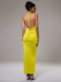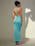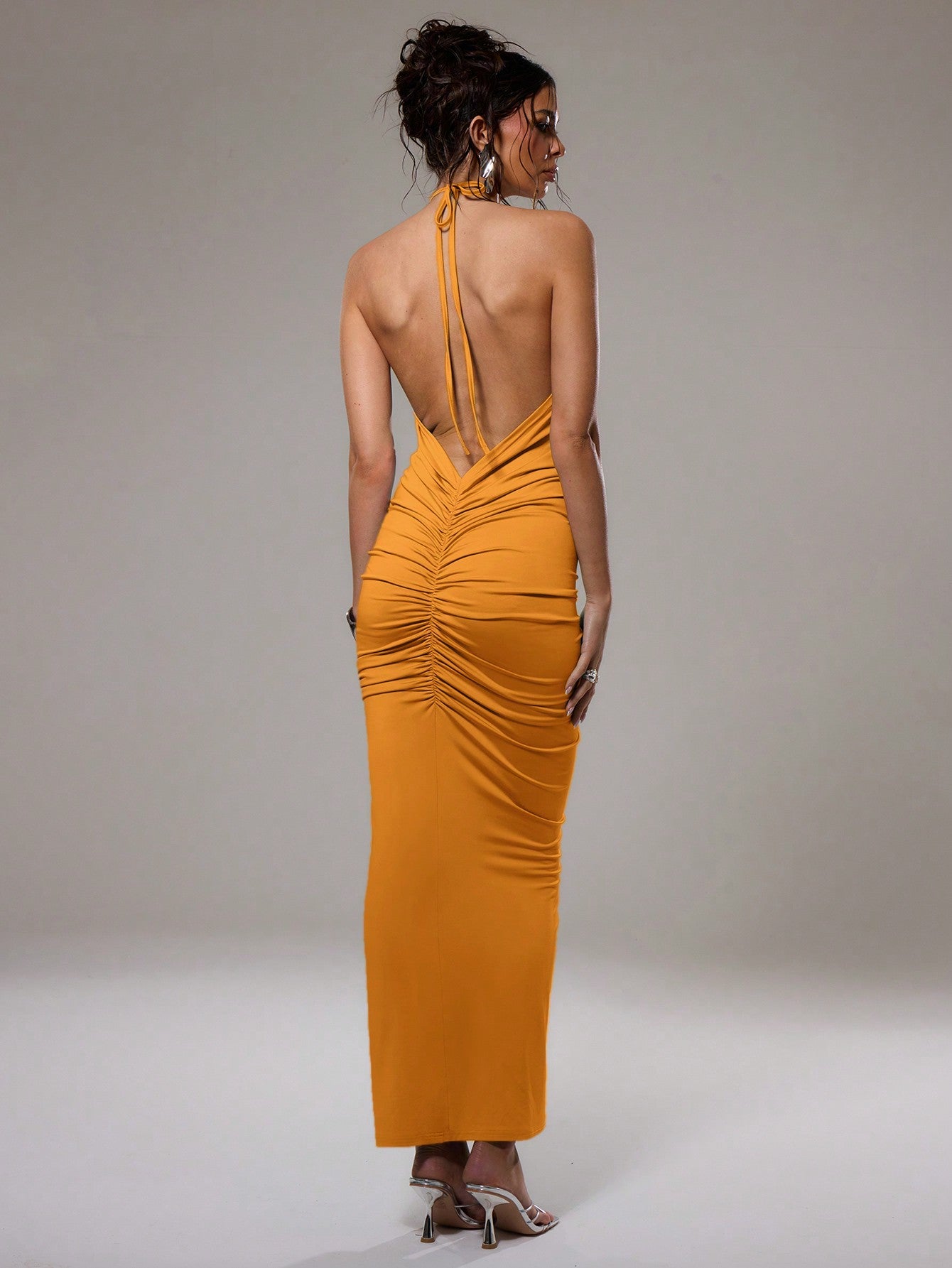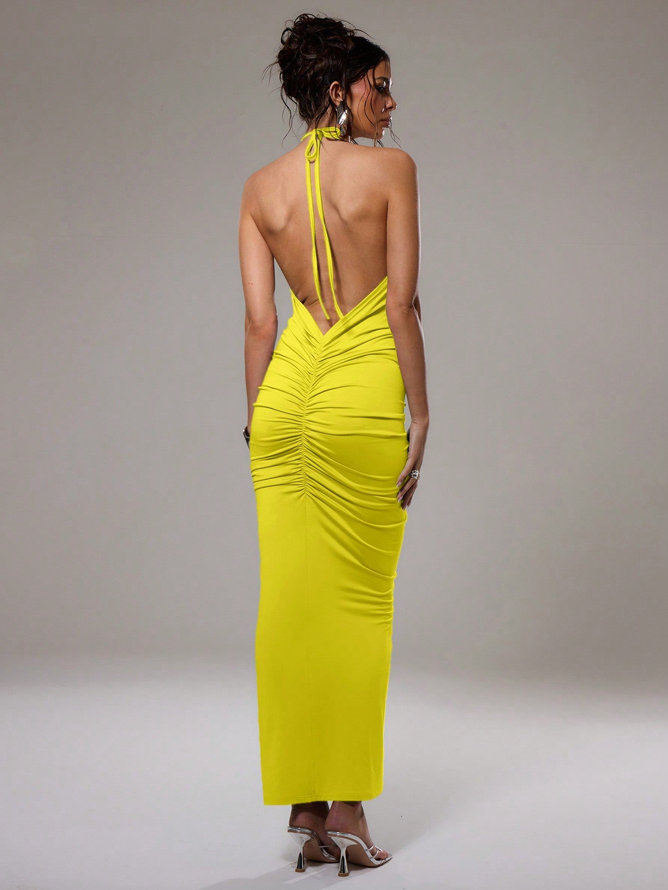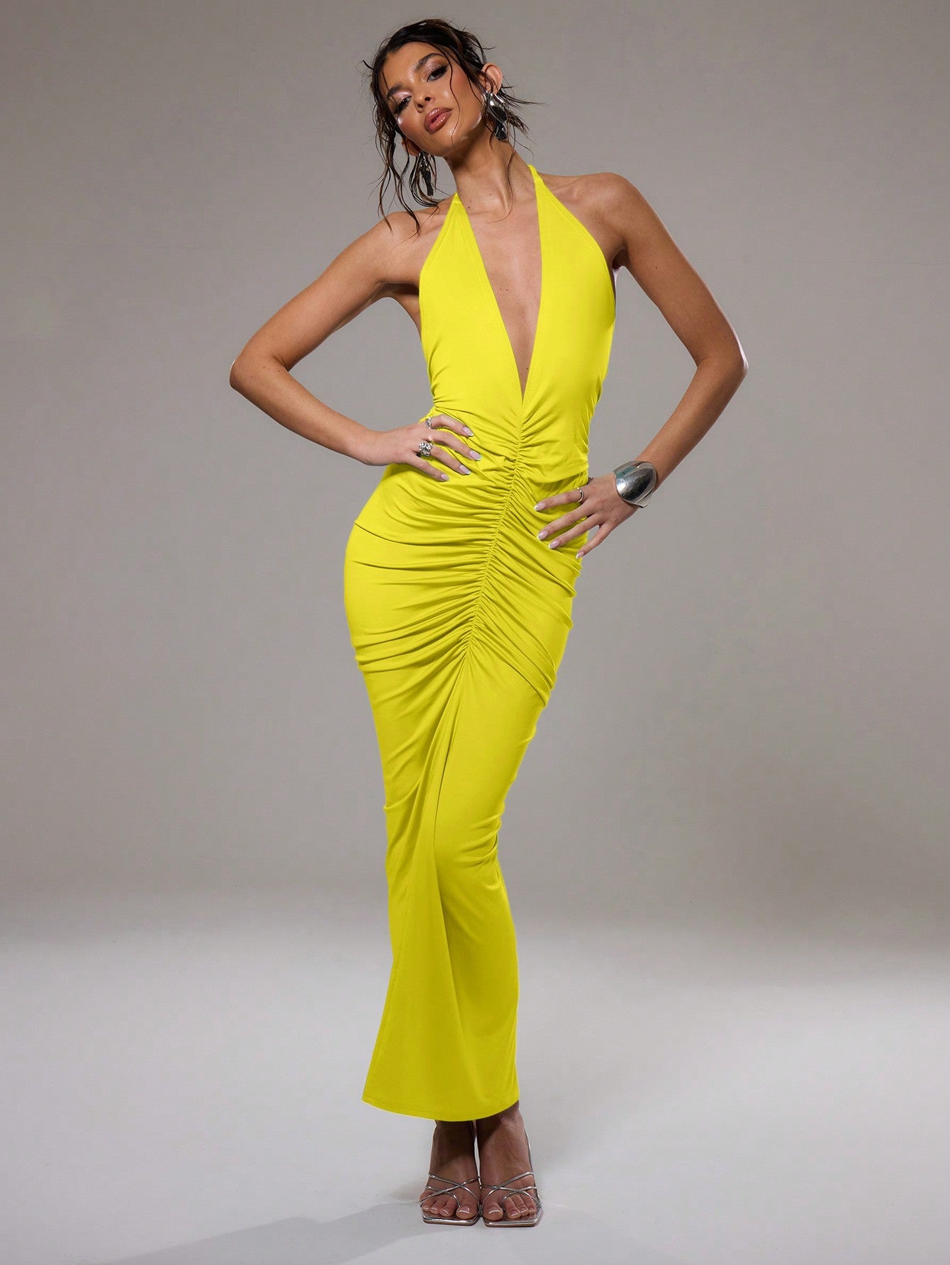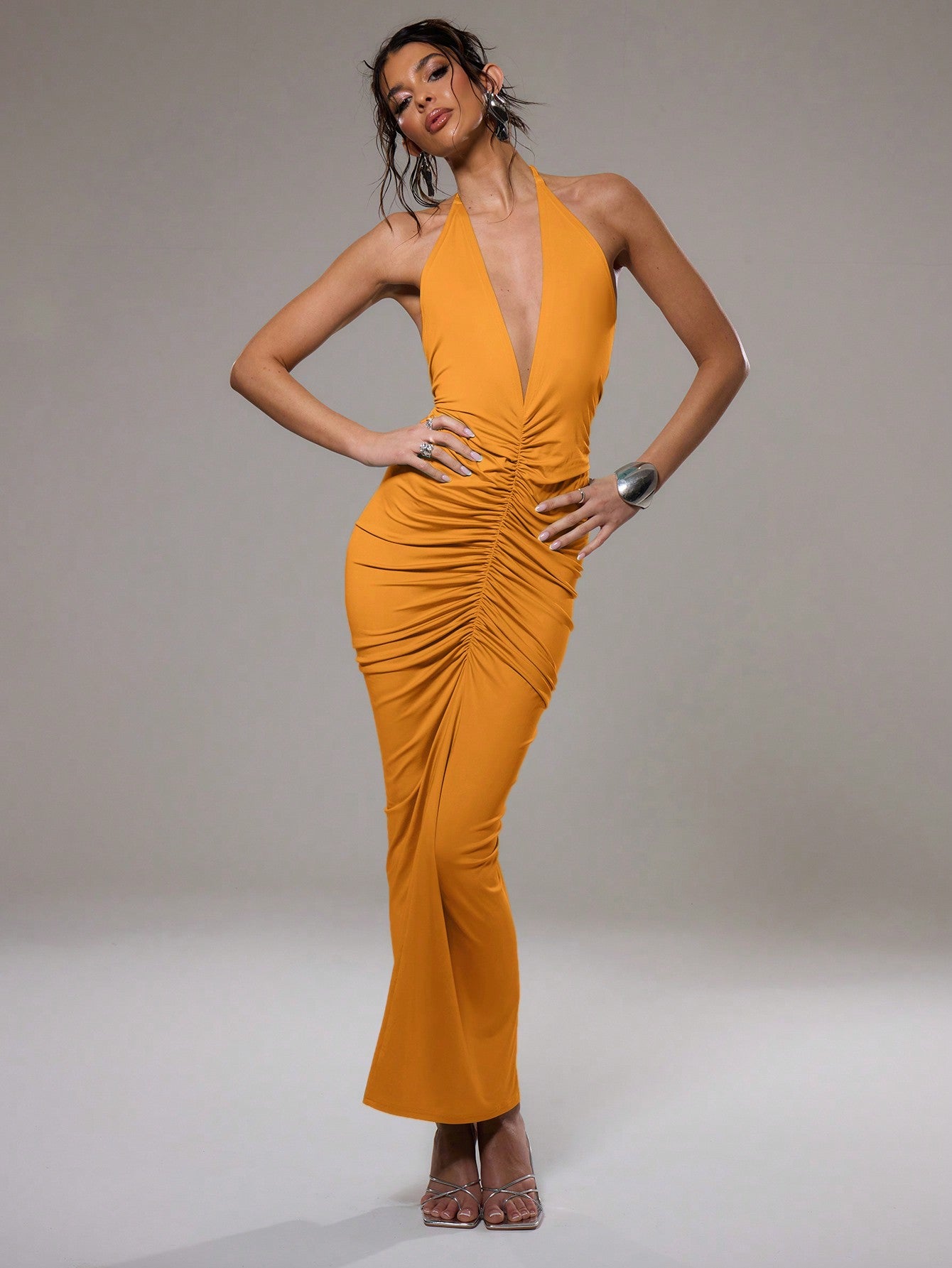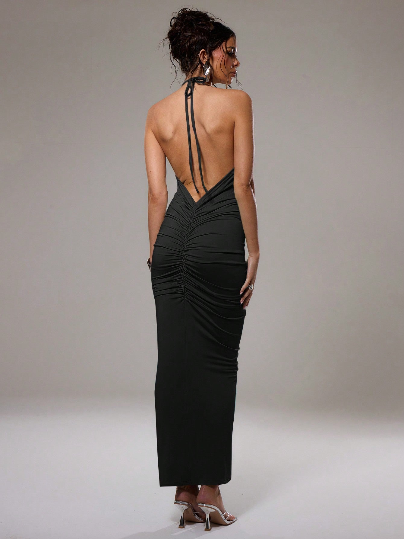Midnight Muse: Ruched Maxi Dress with Extreme Plunge