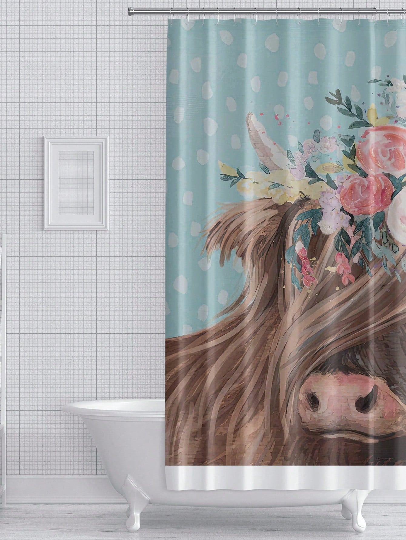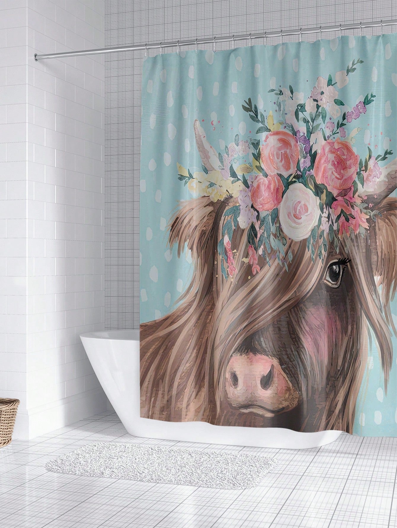 Shower Curtain. This unique and playful curtain features a realistic cow print, making it perfect for any animal lover. The durable fabric and water-resistant design ensure long-lasting use, while the easy installation makes it a hassle-free addition to your bathroom."