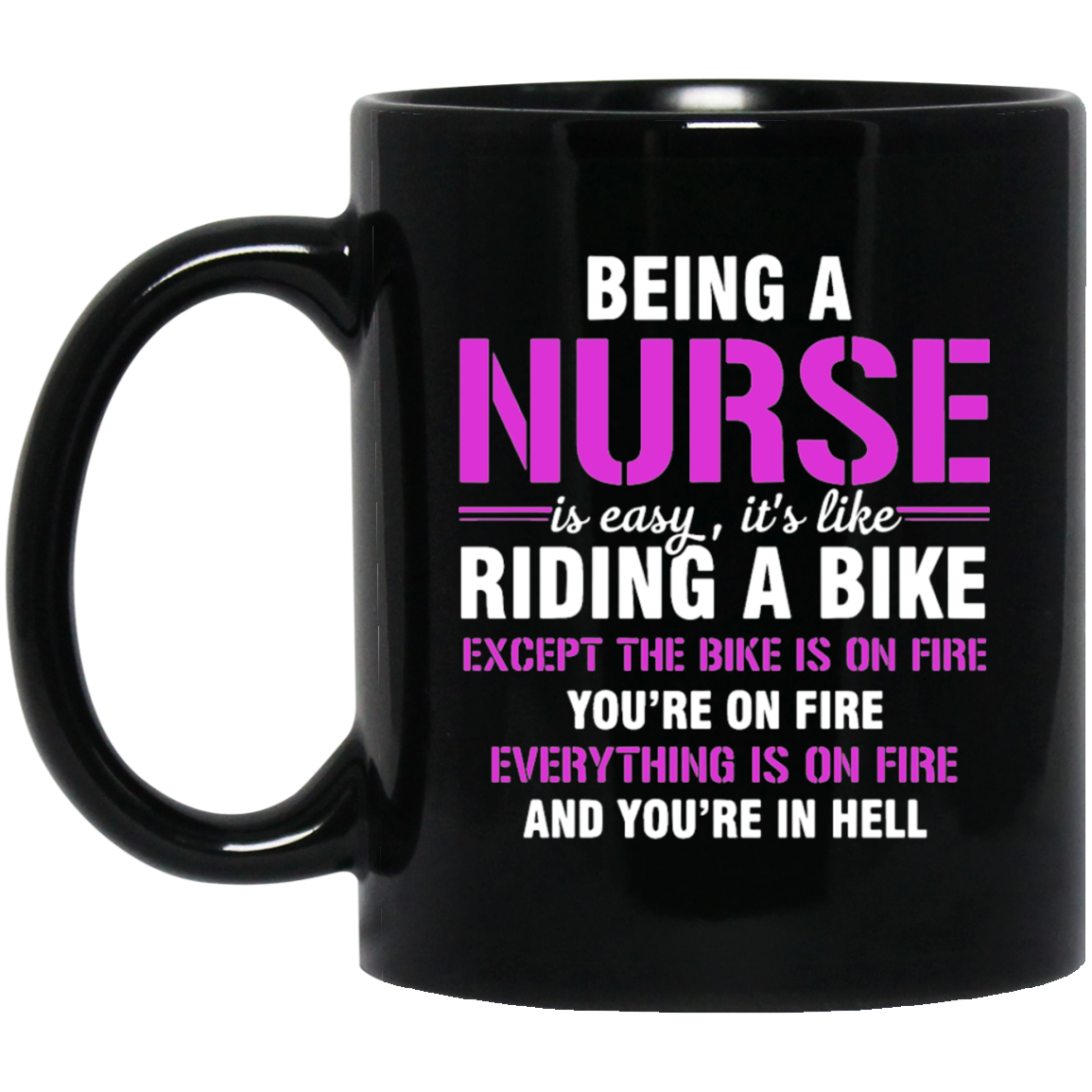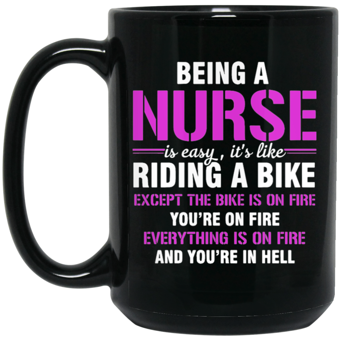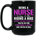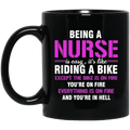 Nurse Gift, Being A Nurse Is Easy, Like Riding A Bike, Except The Bike Is On Fire Black Mug
