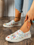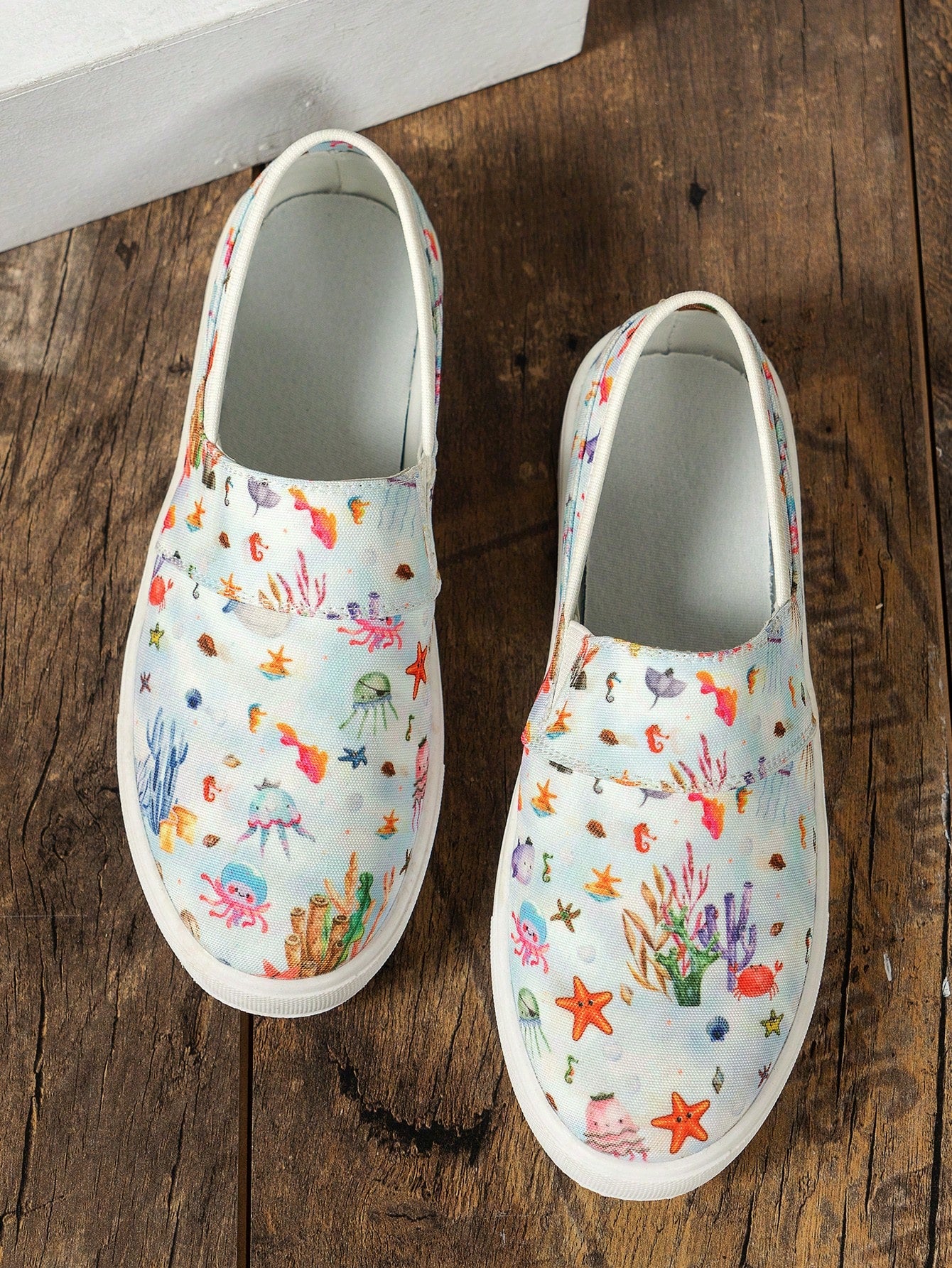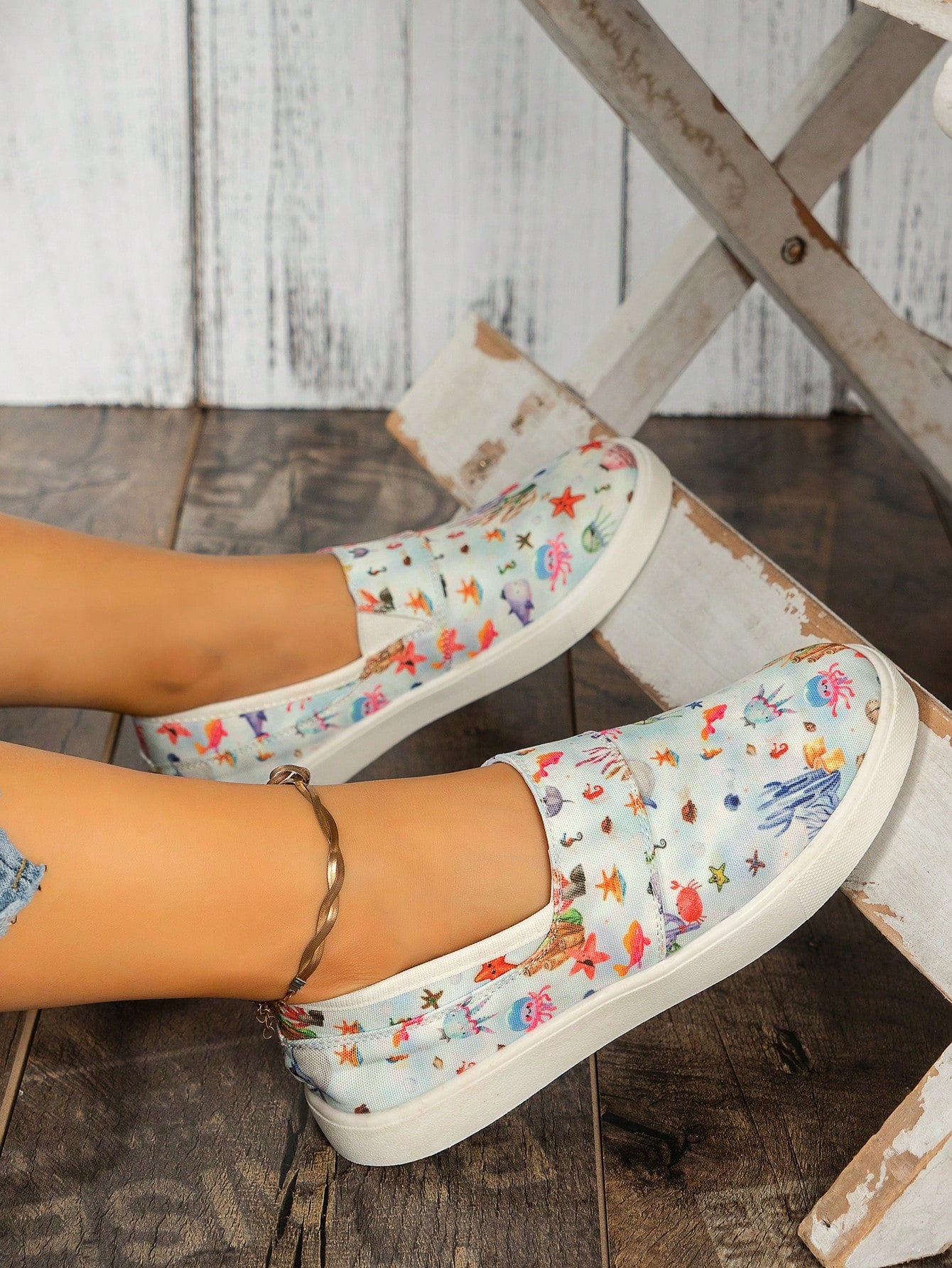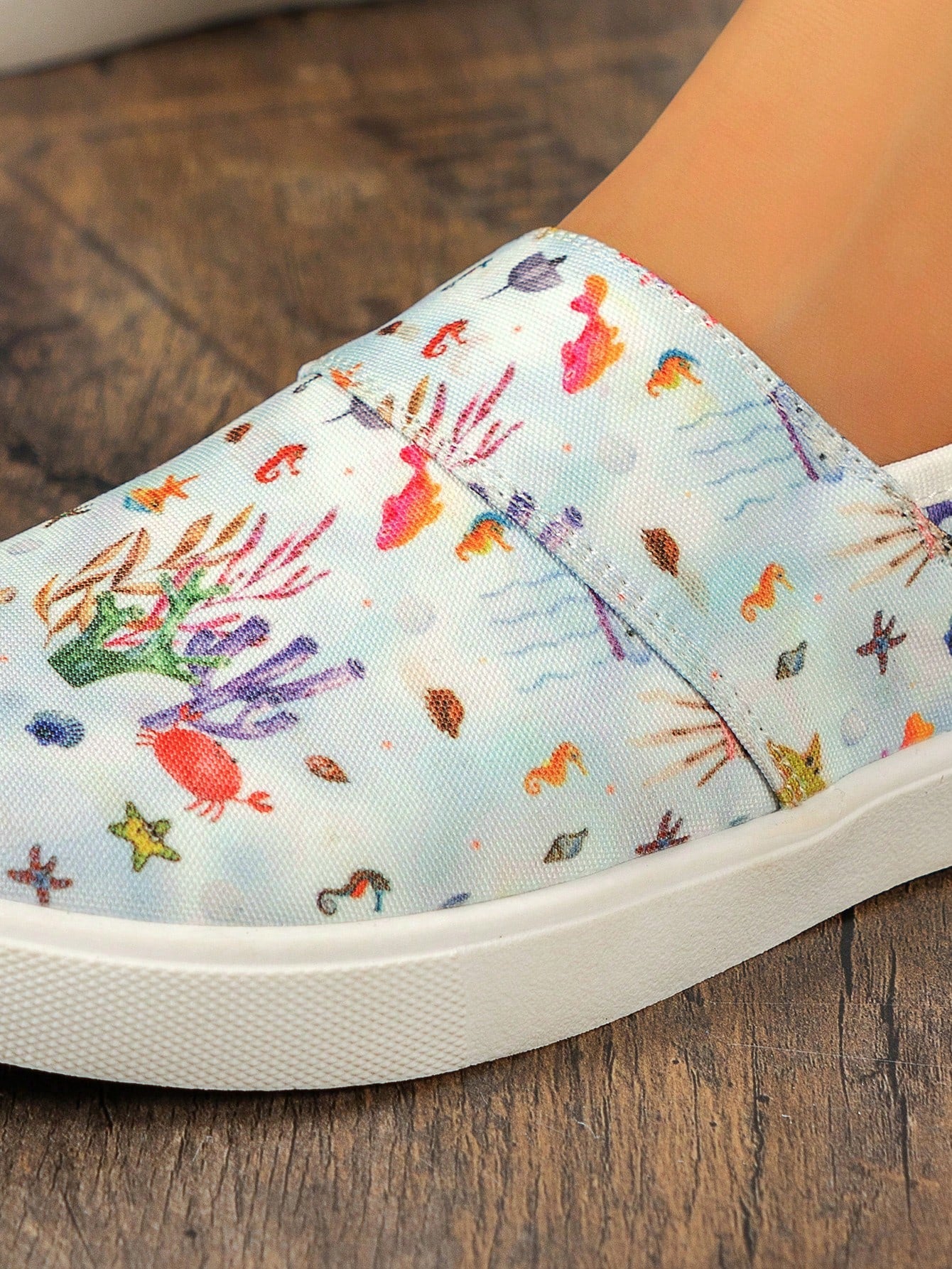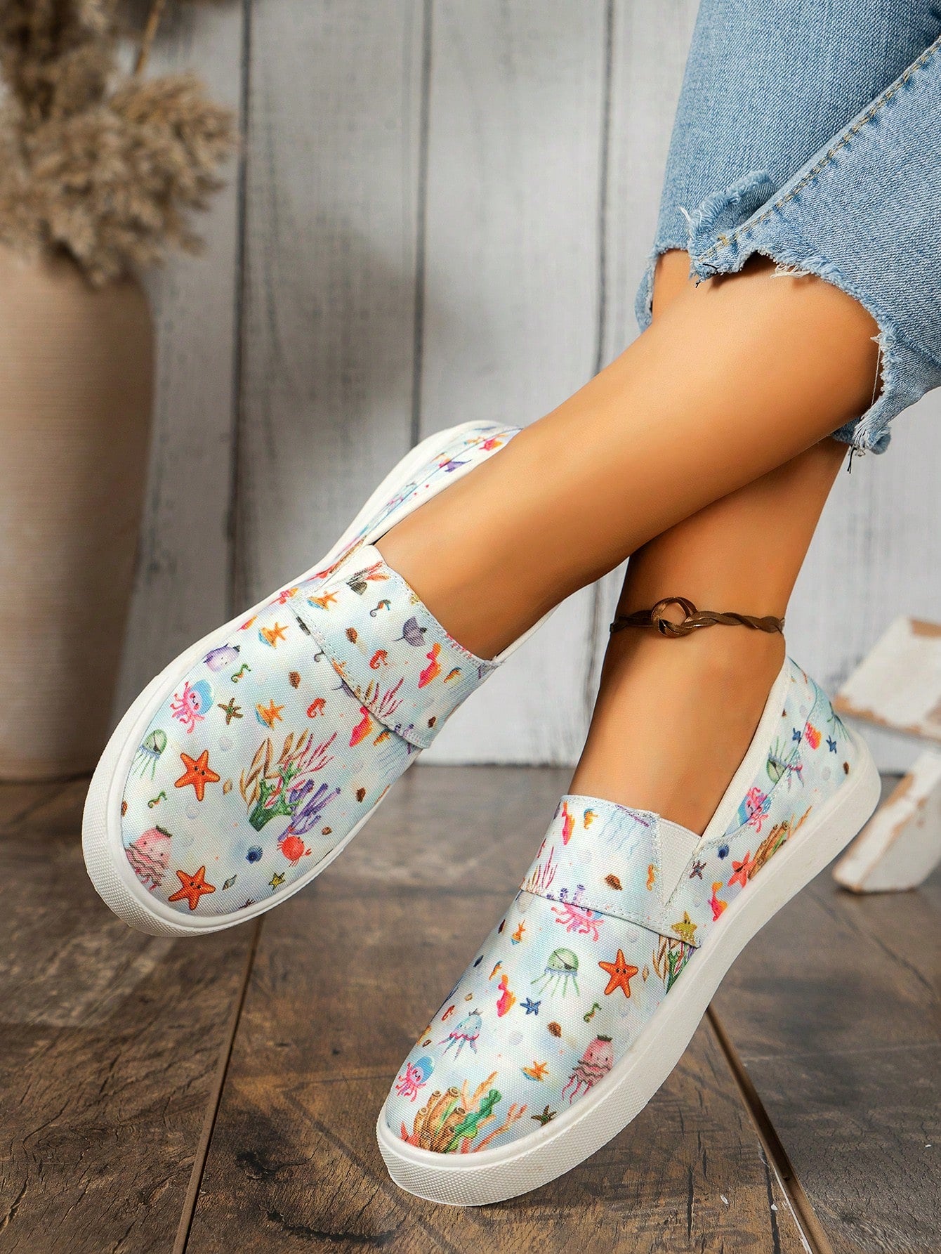Ocean Pattern Casual Sneakers: Women's New Autumn Arrival Outdoor Comfortable Flat Sole Sneakers with Random Light-colored Flower Design