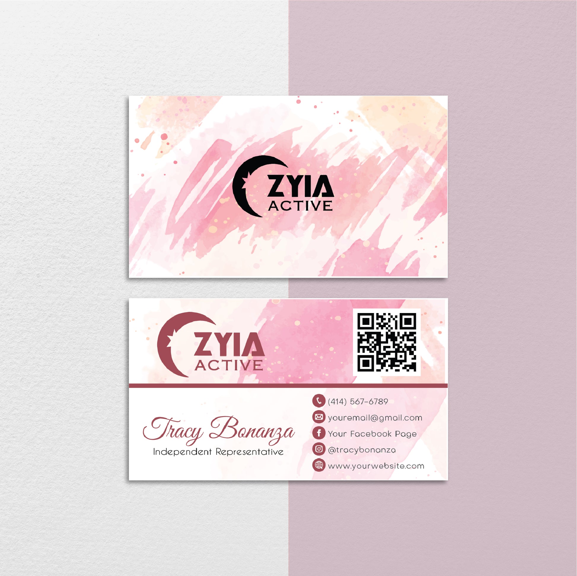 Pink Style Zyia Business Card, Watercolor Personalized Zyia Active QR Code Cards ZA14.