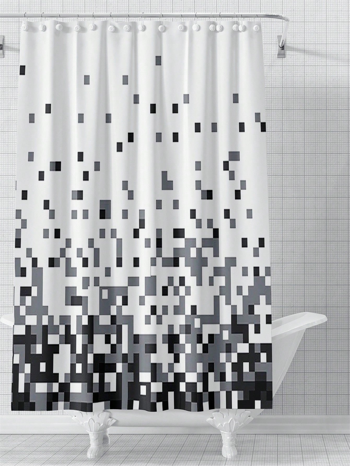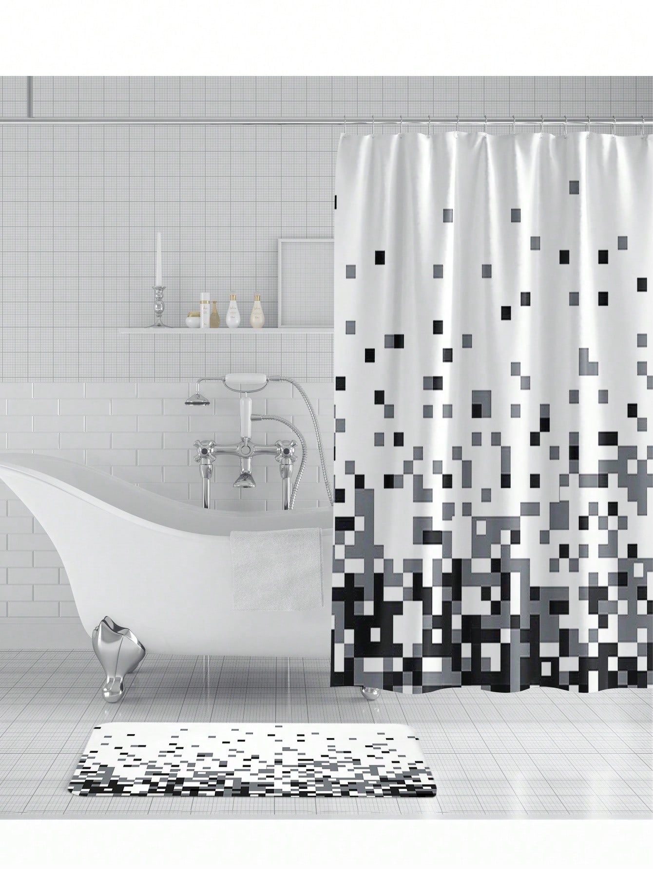Bathroom Decor Set. This set includes a shower curtain and non-slip rug, perfect for adding a stylish touch to any bathroom. The pixelated black design adds an eye-catching element, while the rug provides safety and comfort. Elevate your bathroom with this stunning set."