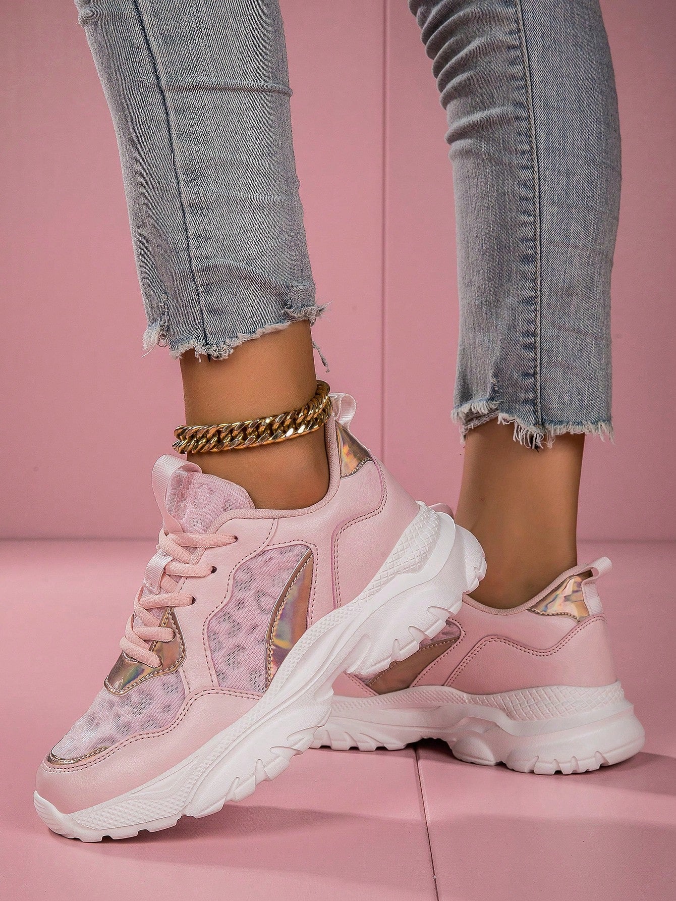 Stay on trend and comfortable with these fashionable and lightweight dad sneakers. Perfect for a day out or a run, with their comfortable running feature. The stylish pink color adds a feminine touch to any outfit. Don't sacrifice style for comfort - now you can have both!