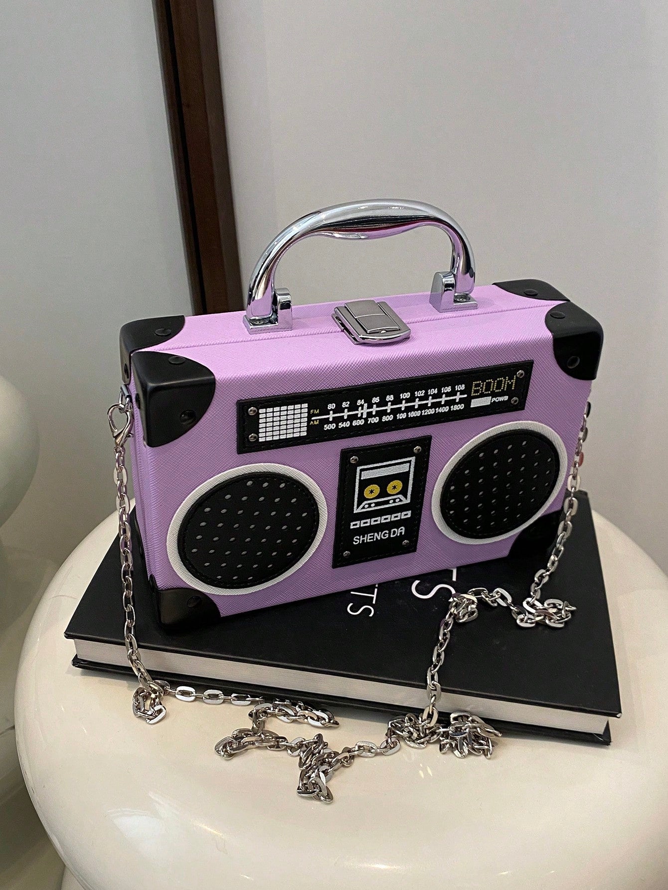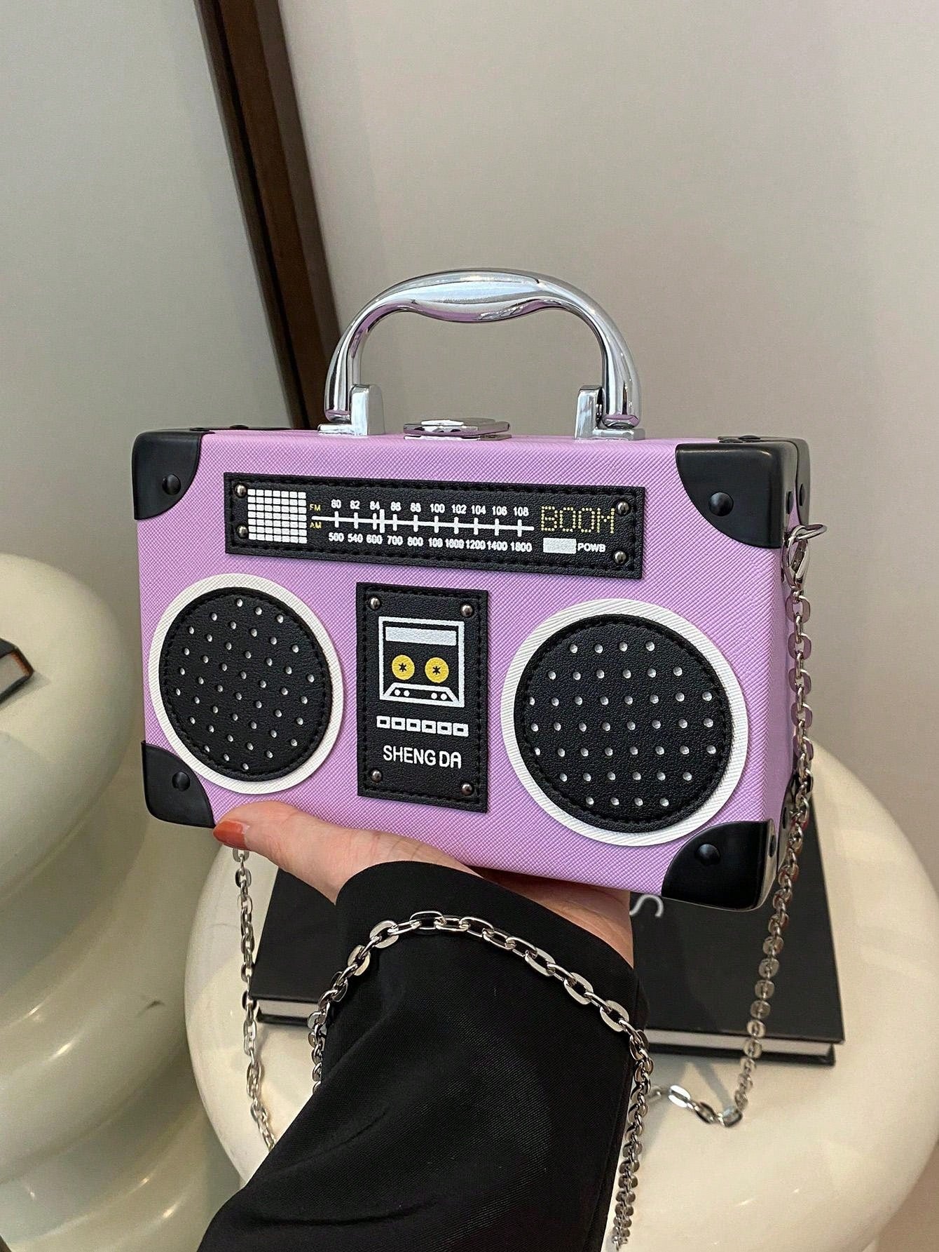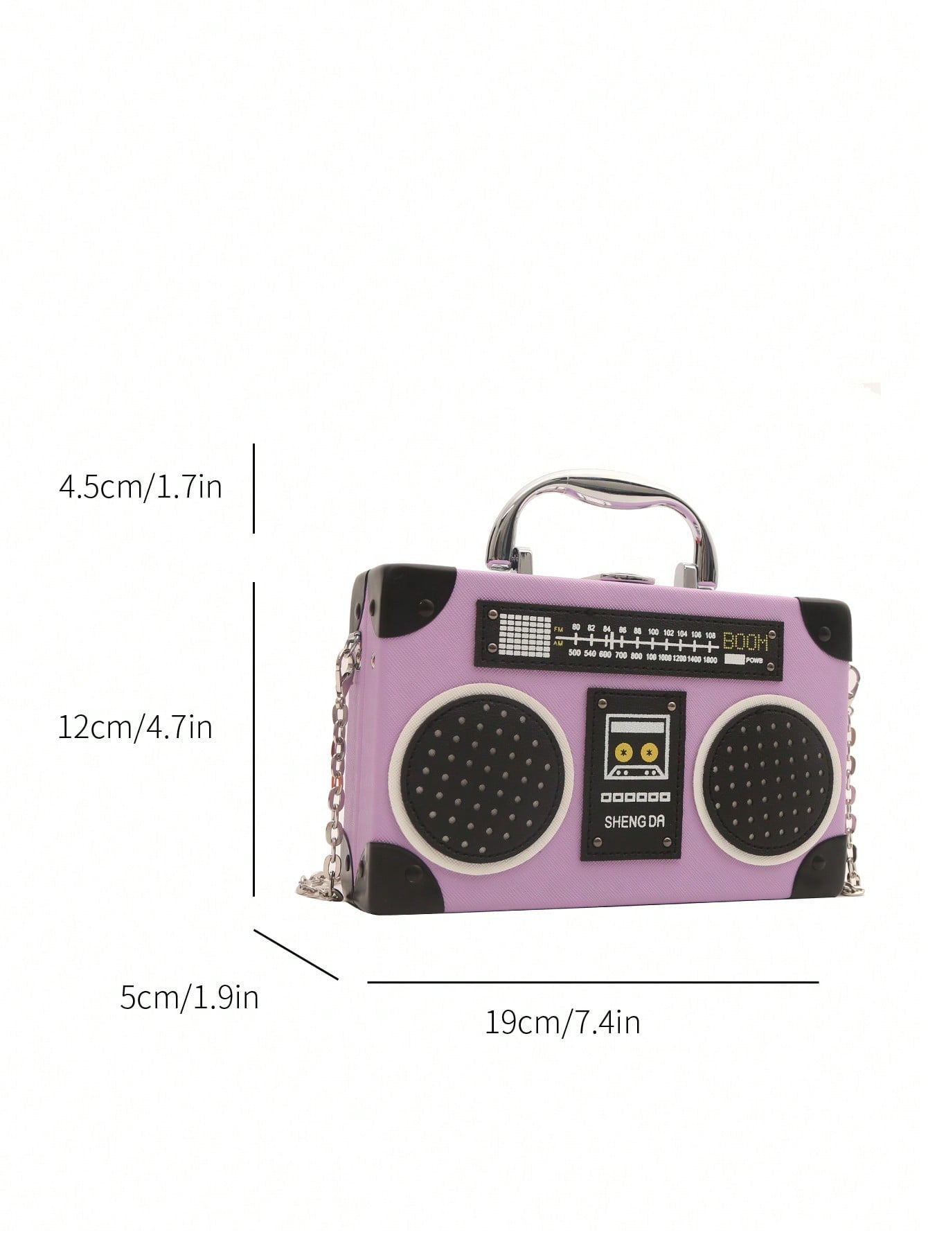Introducing the Radiant Melody: Purple Radio Handbag, a trendy music-inspired crossbody bag. With its stylish design and convenient crossbody strap, this bag is perfect for carrying all your essentials while adding a touch of music to your outfit. Made from high-quality materials, it is both durable and fashionable. Elevate your fashion game with this must-have accessory.