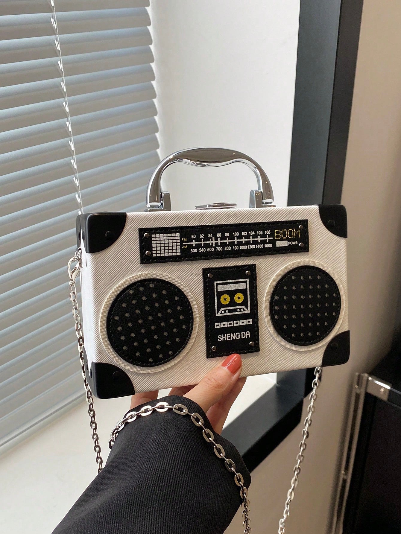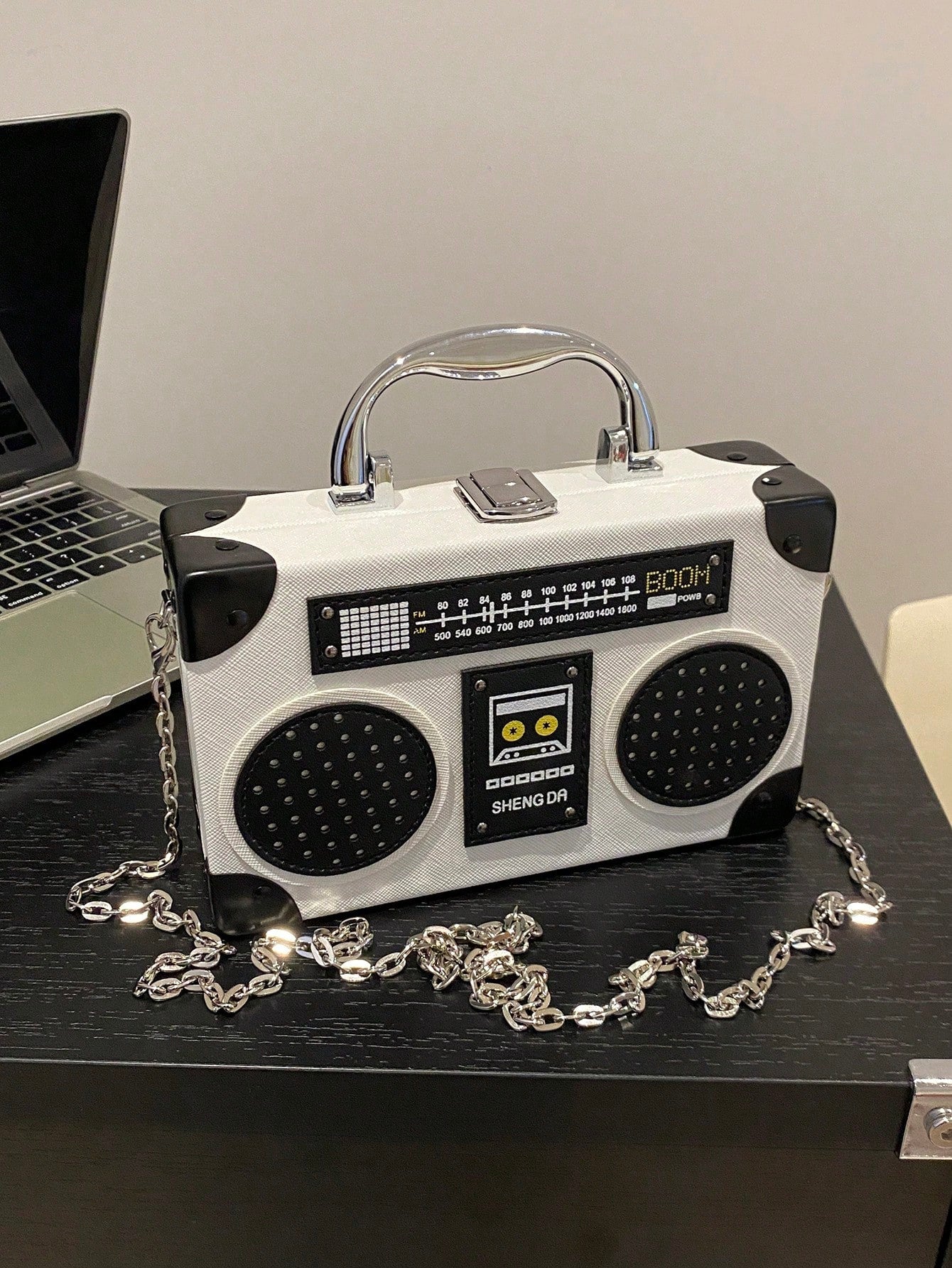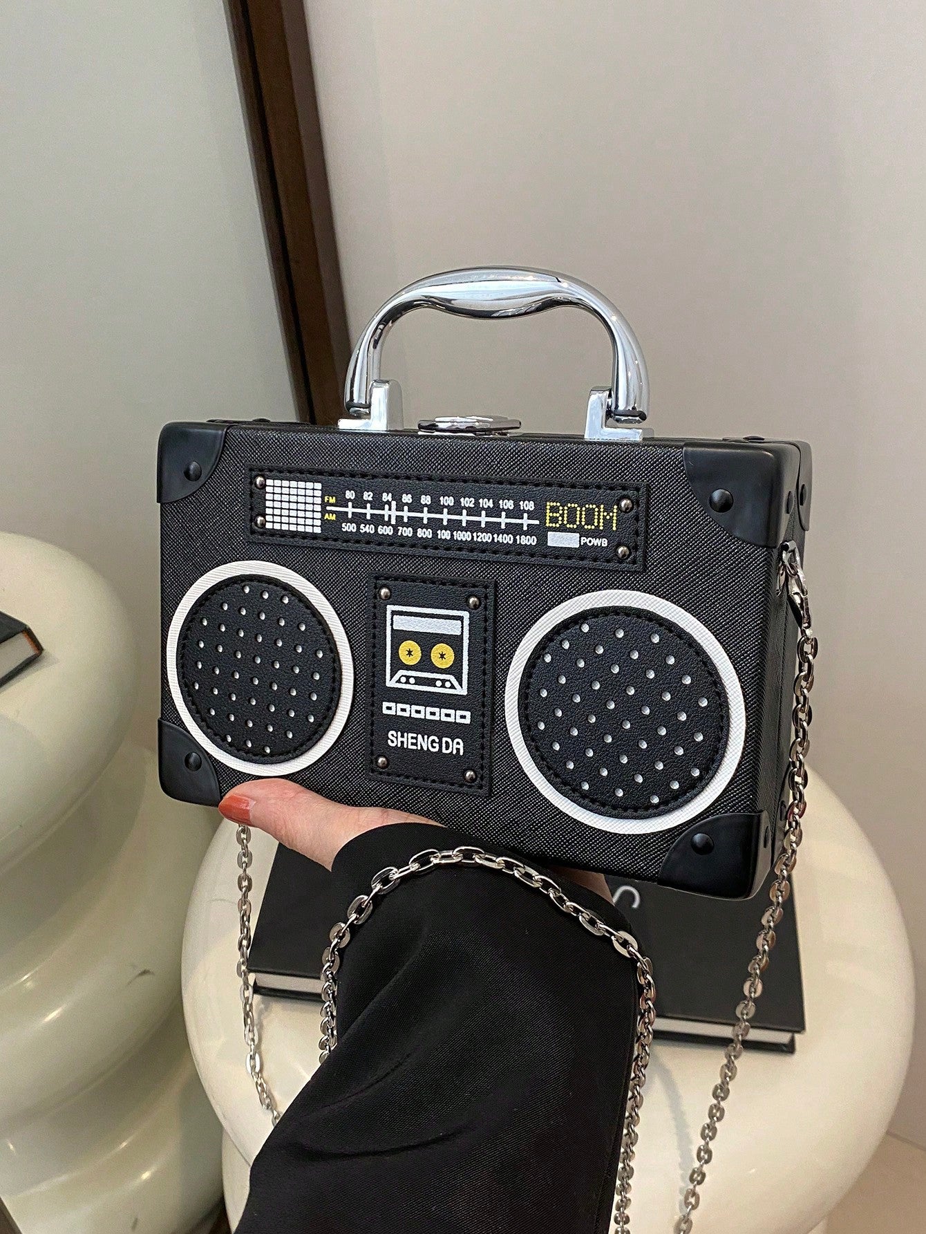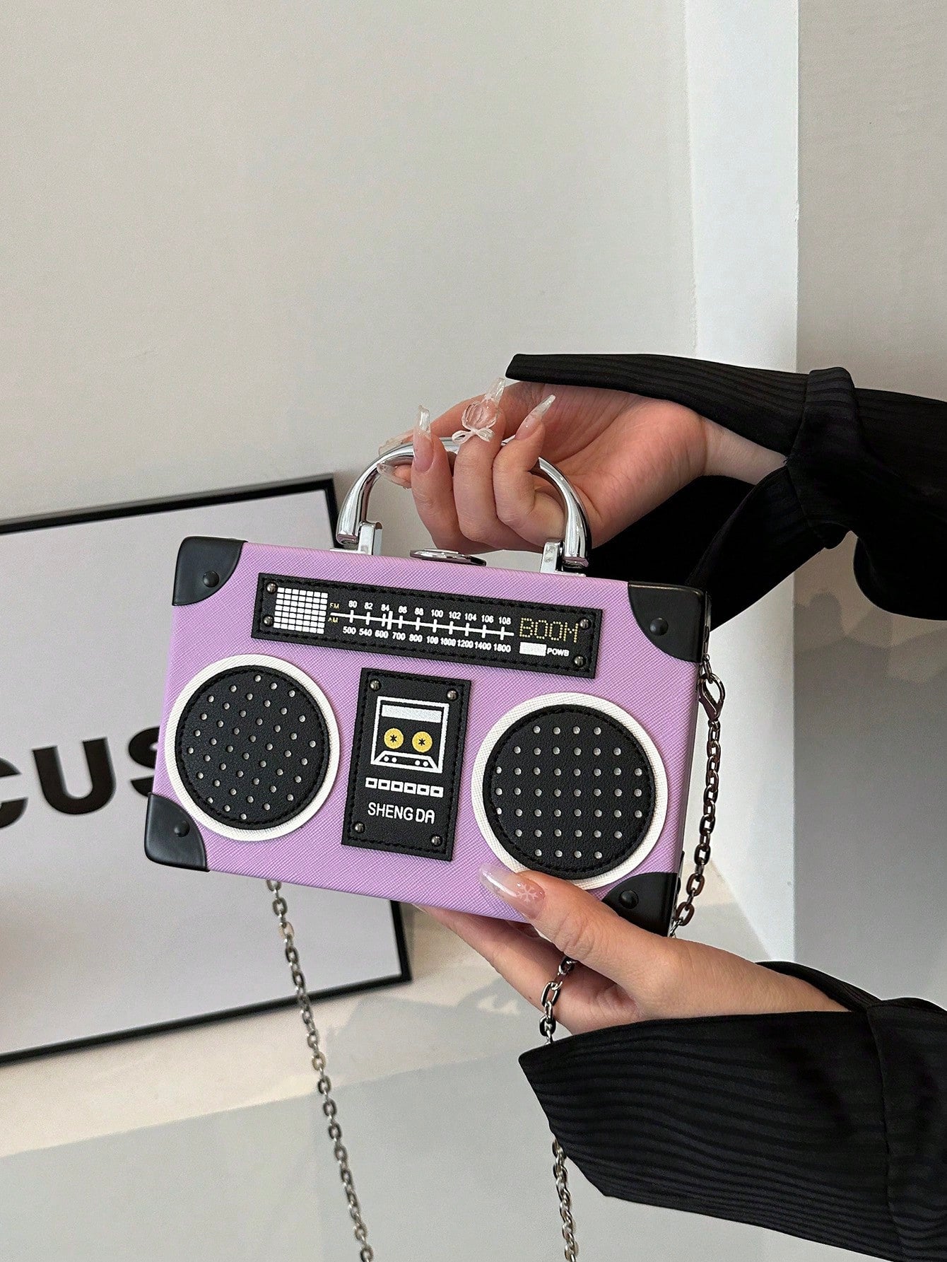 Introducing the Radiant Melody: Purple Radio Handbag, a trendy music-inspired crossbody bag. With its stylish design and convenient crossbody strap, this bag is perfect for carrying all your essentials while adding a touch of music to your outfit. Made from high-quality materials, it is both durable and fashionable. Elevate your fashion game with this must-have accessory.