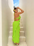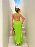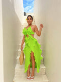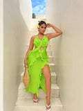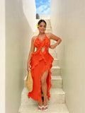 Ravishing Ruffles: Holiday Sexy Style Halter Neck Dress with High Split Hemline