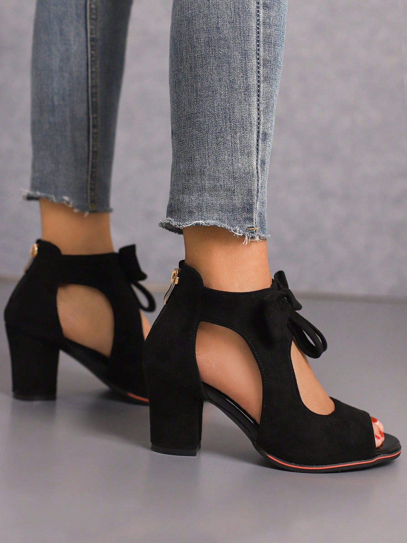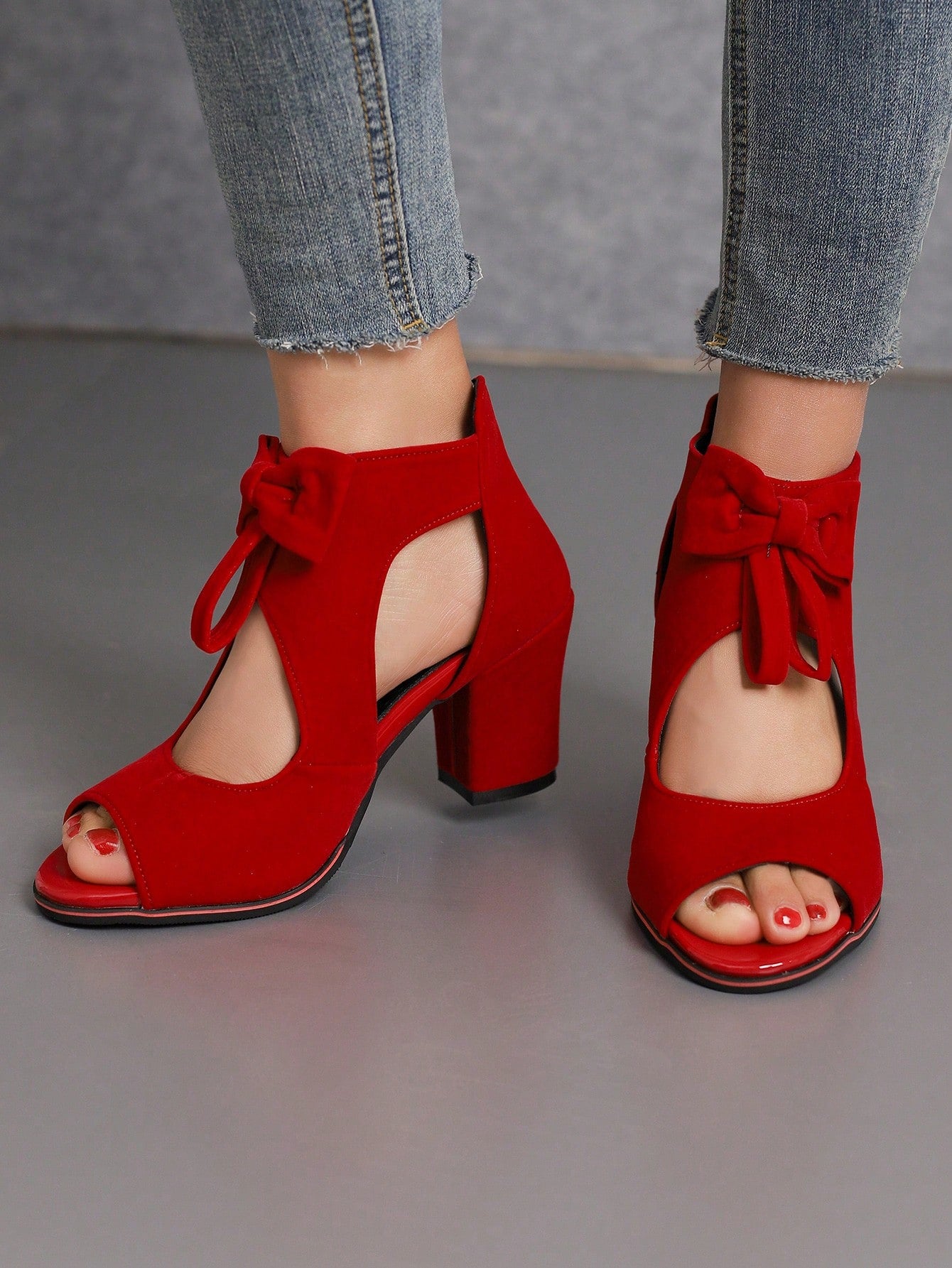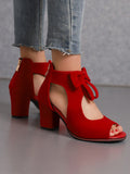 Elevate your style with our Red Suede Butterfly Knot Peep Toe Sandals Boots. Crafted with a striking red suede exterior and adorned with a delicate butterfly knot, these boots are perfect for stepping into style. The peep toe design adds a touch of elegance while the sturdy construction ensures comfort and durability.