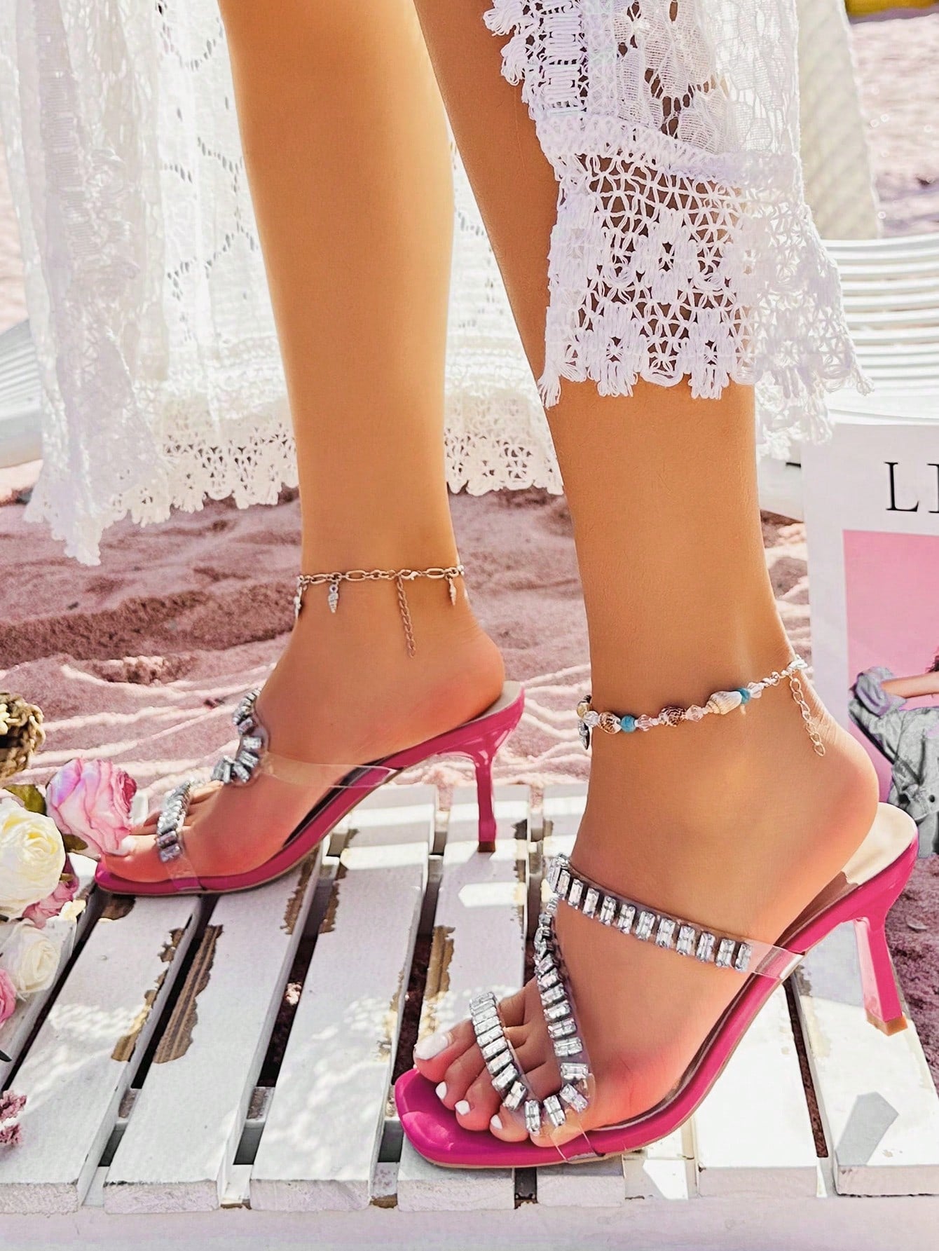 Sandals. These fashionable high heels are designed to complement plus-size feet and add a touch of glamour to any outfit. With dazzling rhinestones and a comfortable fit, these sandals are perfect for a night out or special occasion. Make a statement and step out in confidence with Rhinestone Glam."