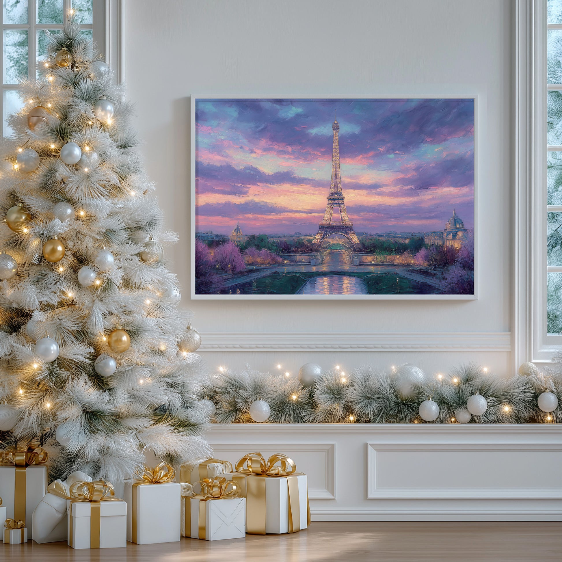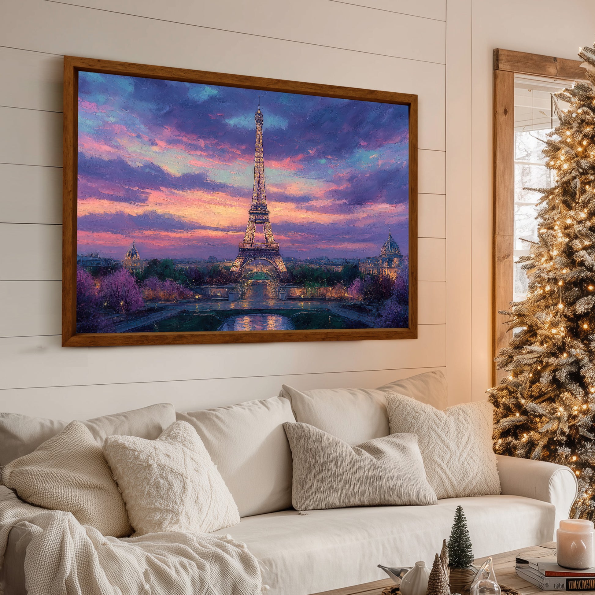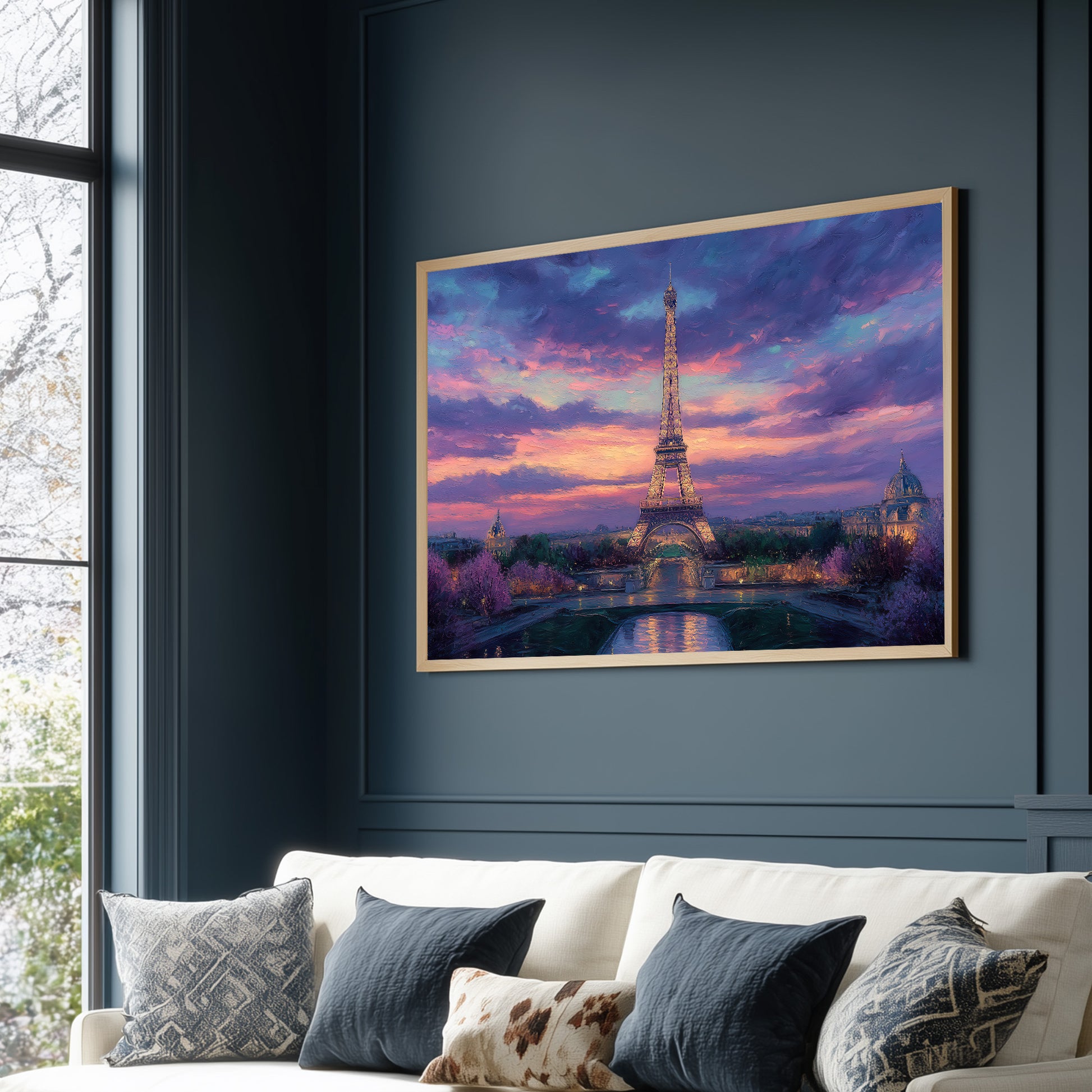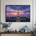 A breathtaking impressionist oil painting of the iconic Eiffel Tower in Paris during a dramatic sunset. The sky is filled with swirling clouds in vibrant shades of deep purple, pink, and orange, creating a magical and romantic atmosphere. The city below begins to glow with evening lights, reflecting softly in the foreground. With rich textures and expressive brushstrokes, this artwork captures the timeless beauty and allure of the City of Light. It is a perfect focal piece for a sophisticated living room, a master bedroom, or a travel-inspired gallery wall.