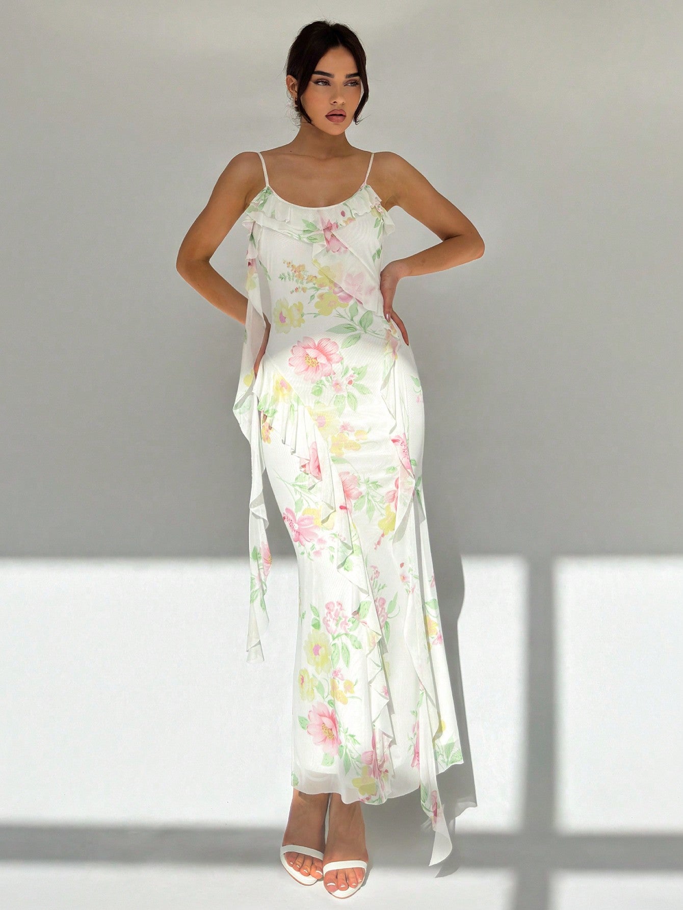Romantic Holiday Floral Bodycon Dress: Women's Spaghetti Strap Mesh Panel
