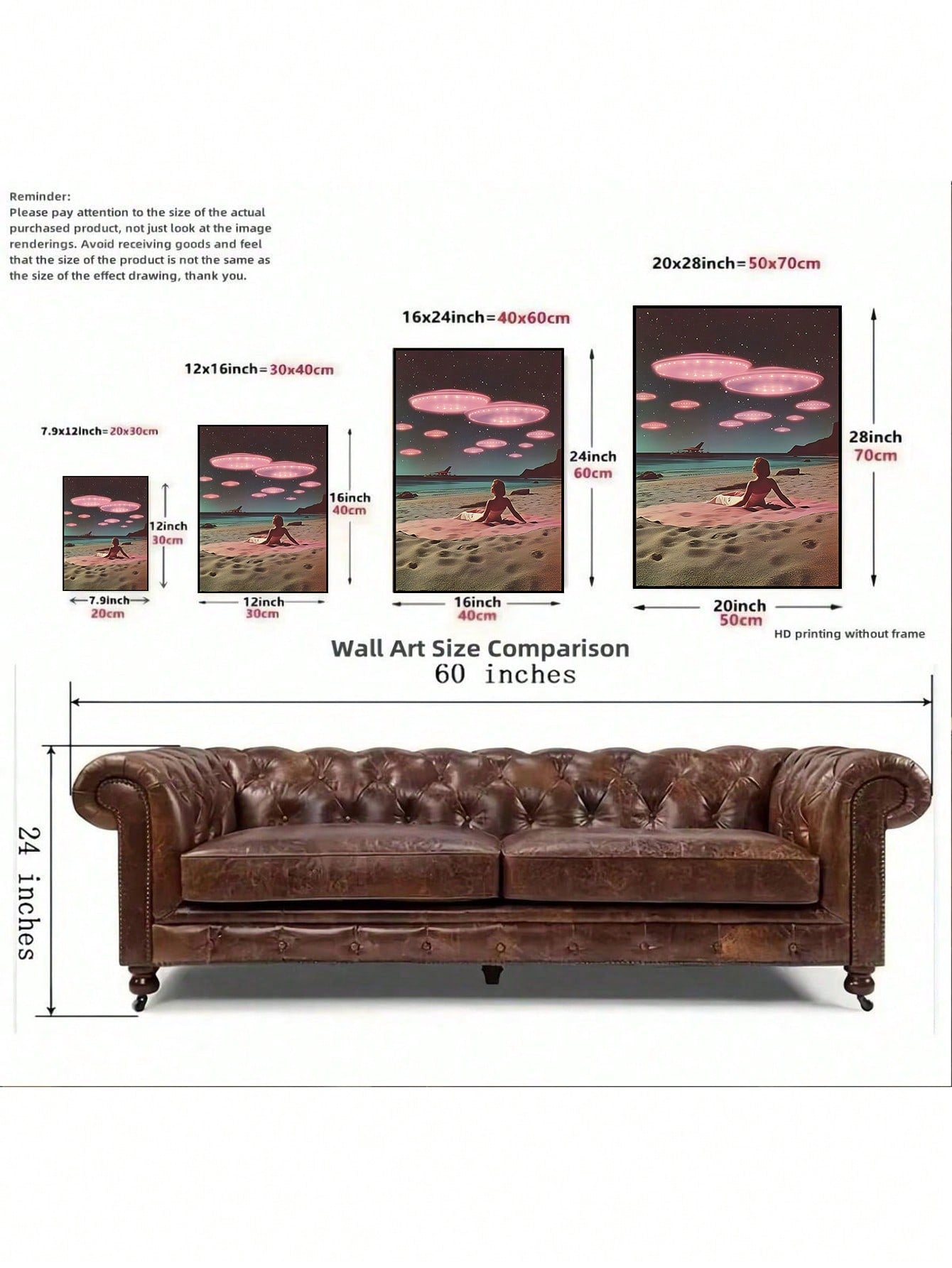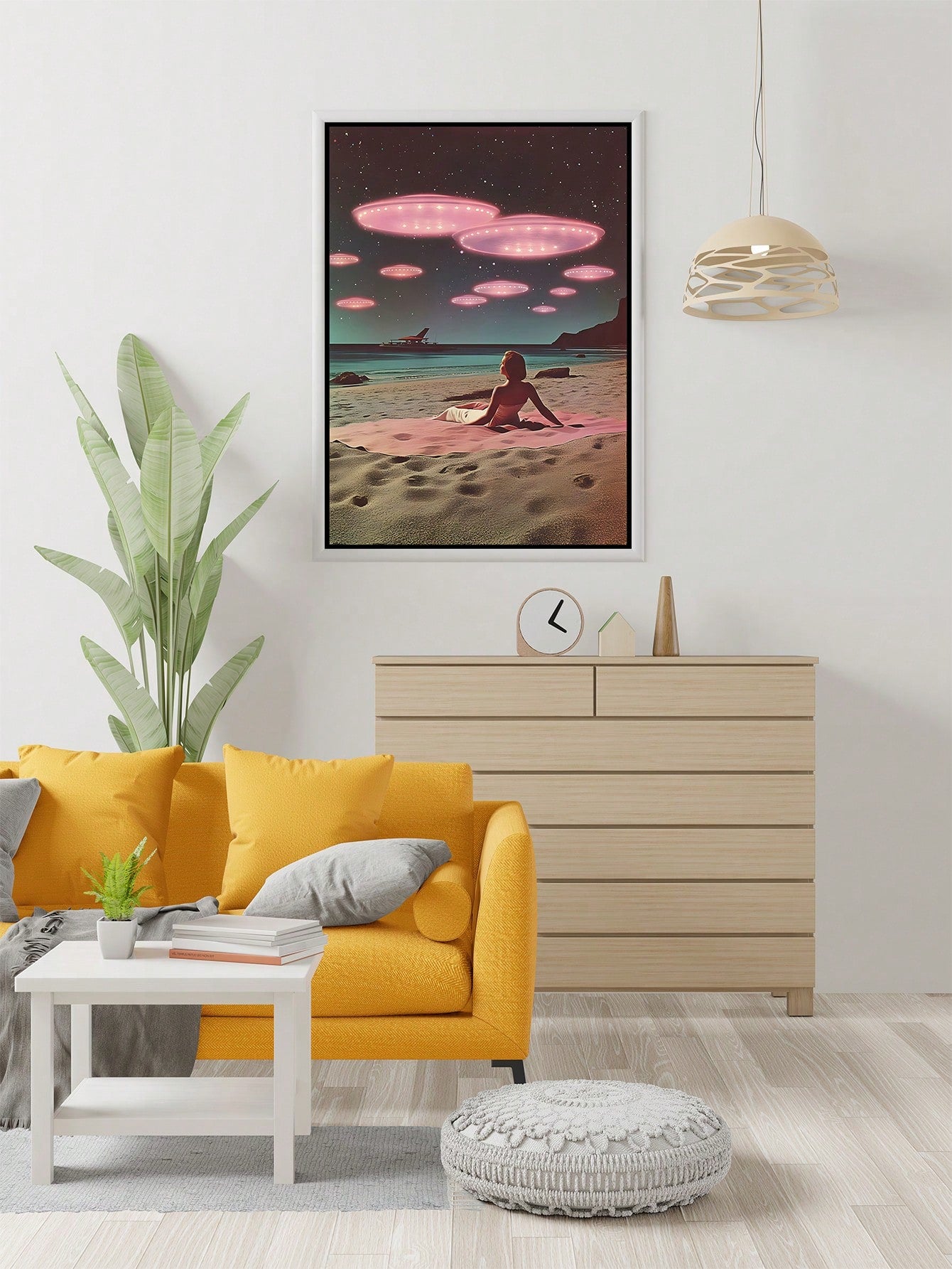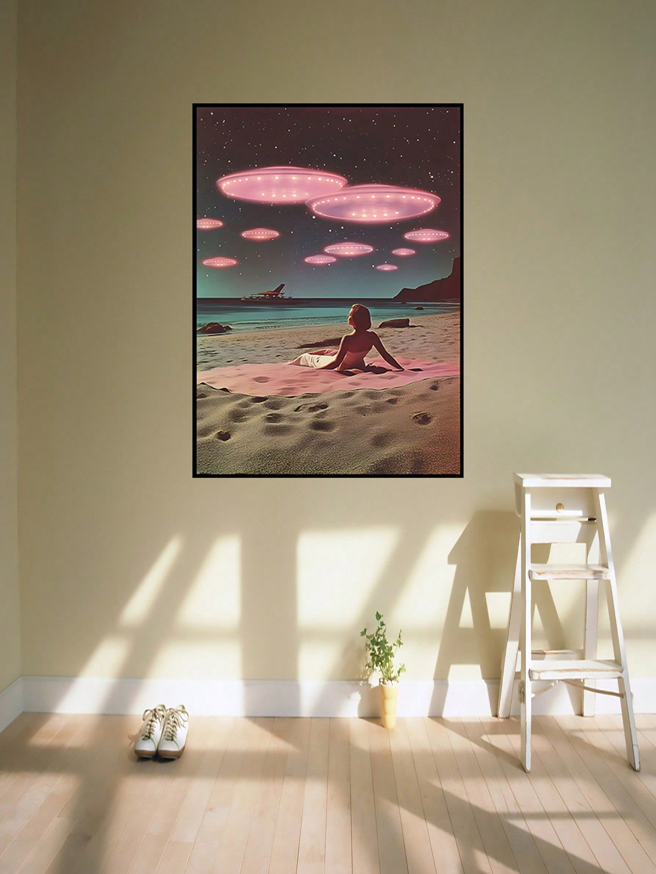 Sci-Fi Encounter: UFO and Alien Beach Canvas Print - Modern Wall Art Poster for Bedroom and Living Room Decor