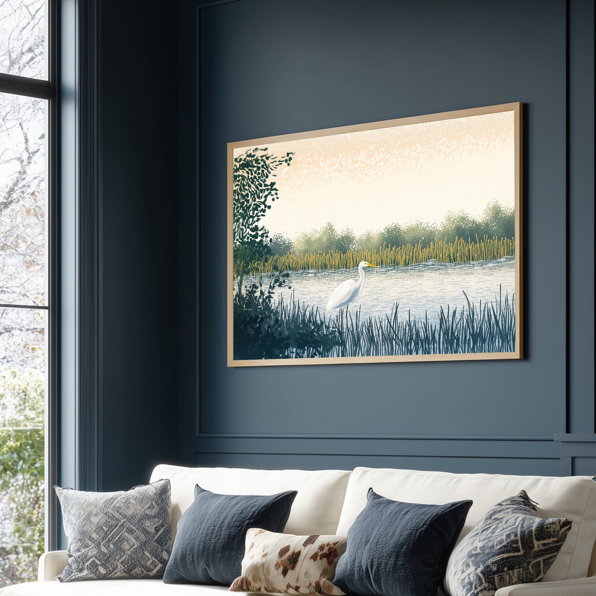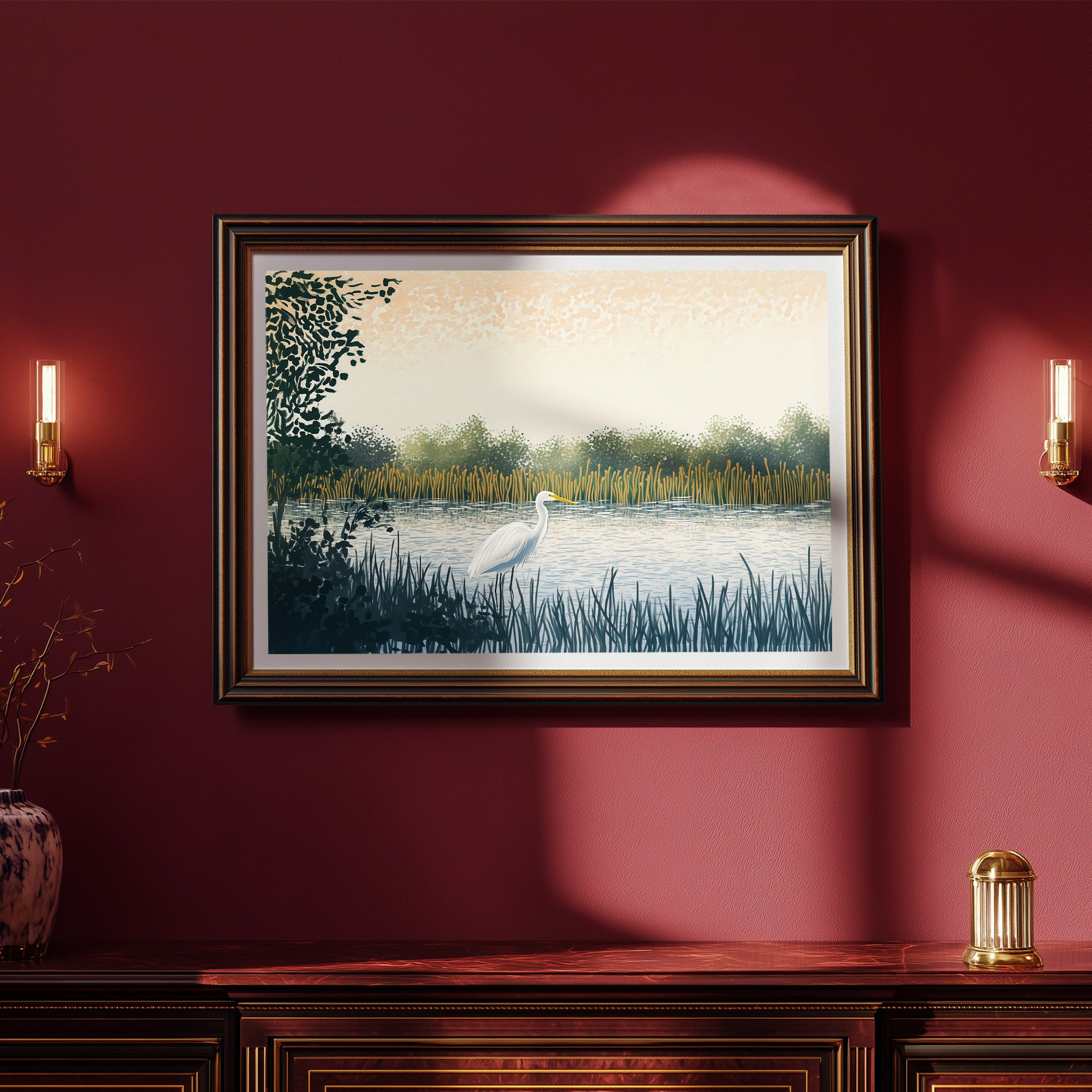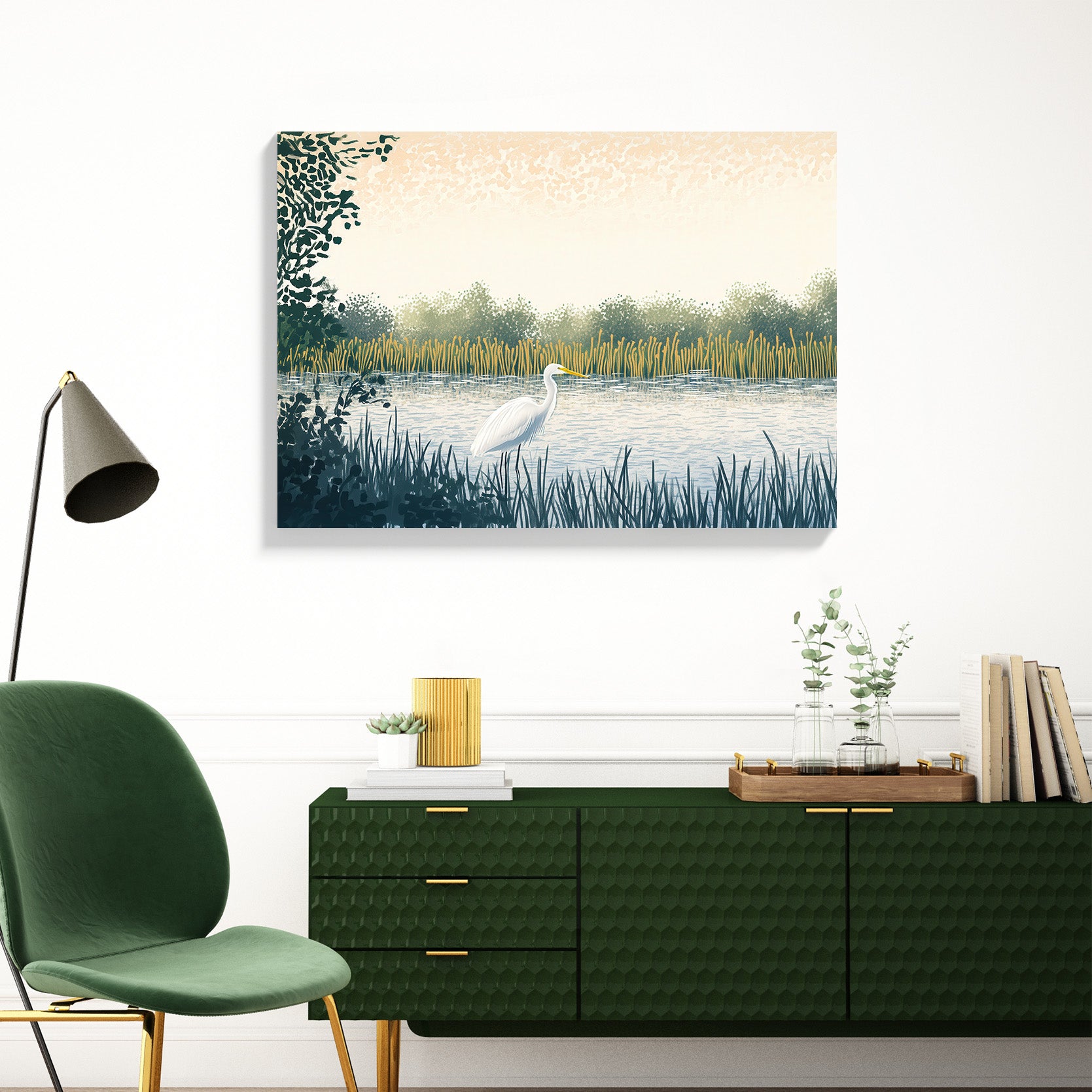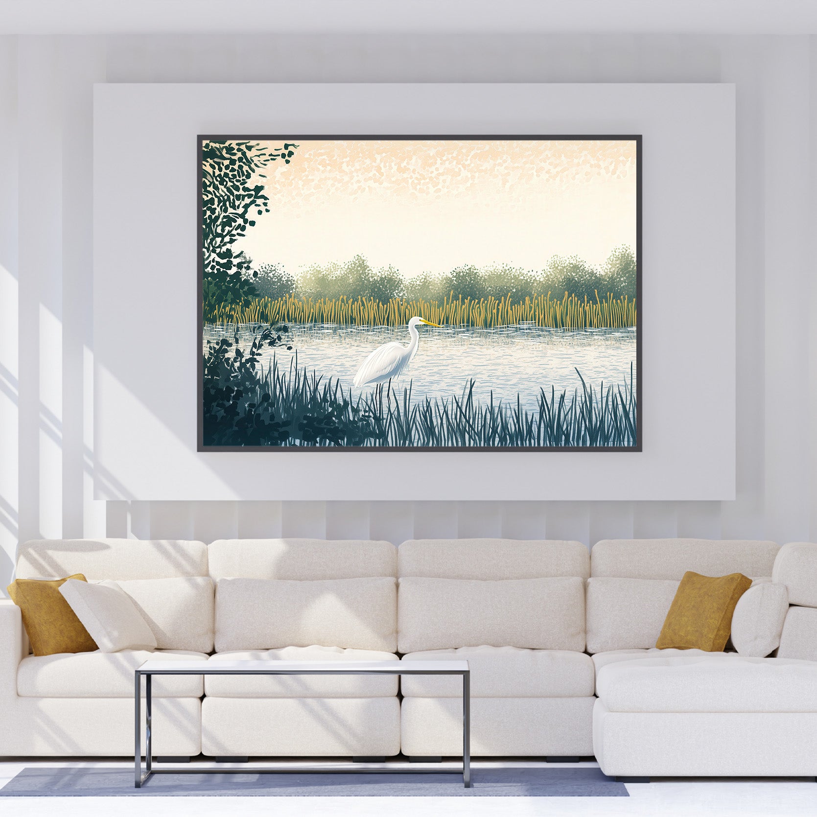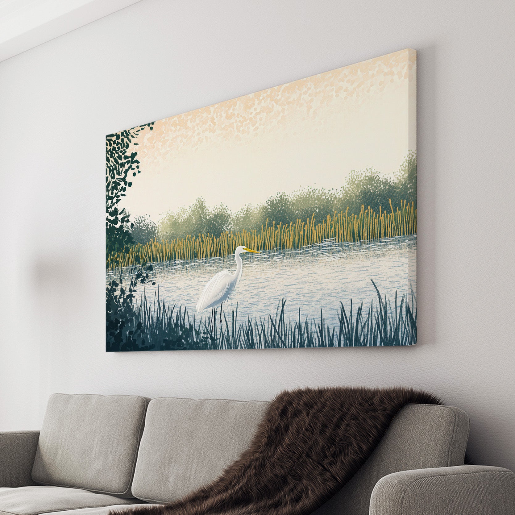 A peaceful and stylized illustration capturing the tranquil beauty of a marsh or wetland. A striking white Great Egret stands prominently at the center, its long neck and yellow beak contrasting against the muted landscape. The bird is surrounded by dark, foreground reeds and lighter yellow-green reeds in the background, subtly obscuring the water's edge. The upper portion of the canvas features a soft, pale sky, rendered in simple, textured blocks of muted color. The overall style is modern, minimalist, and serene, perfect for creating a sense of calm and natural elegance in any space.