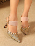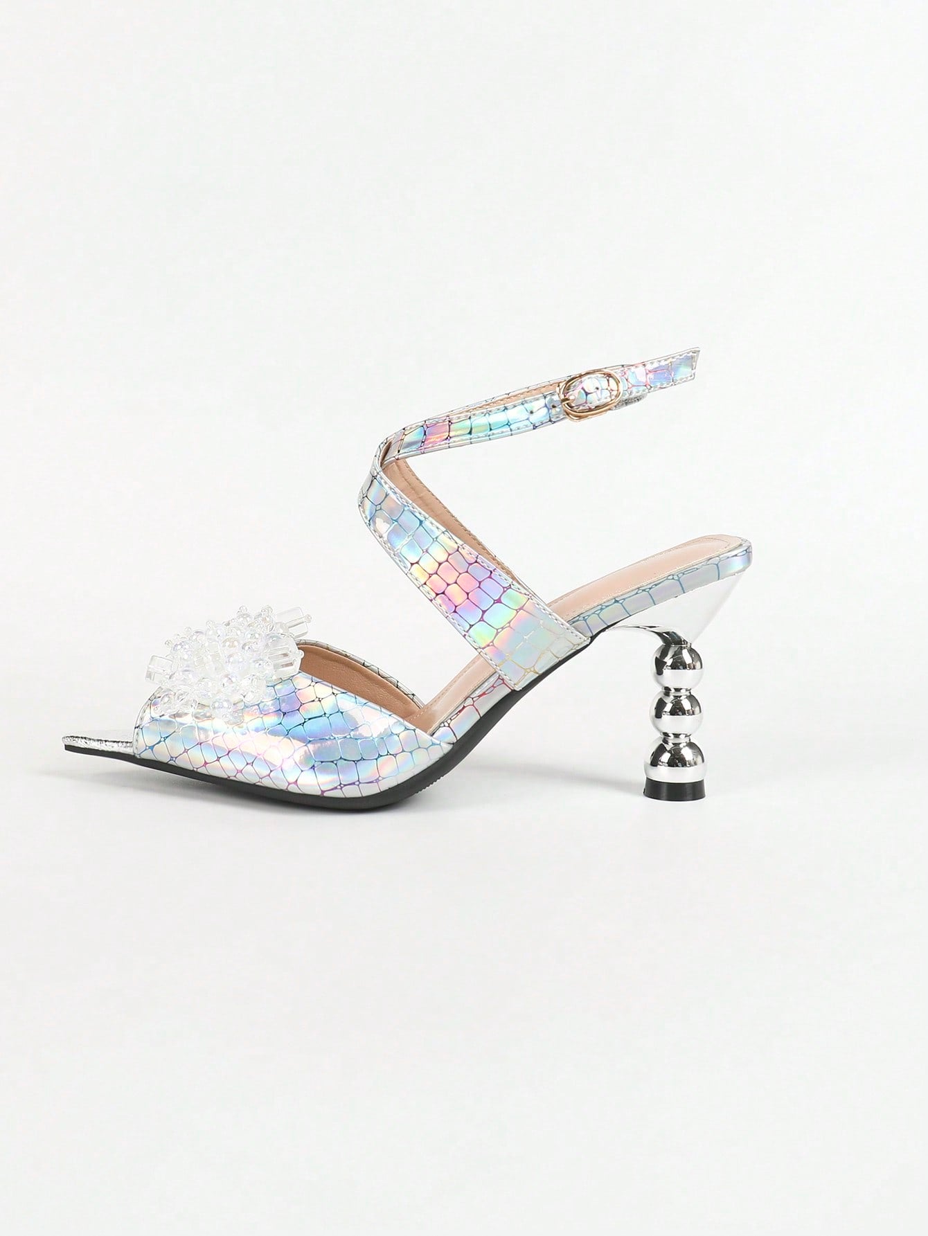 Silver Laser Snake Pattern High Heels: Elegant Spring/Summer Footwear with Imitation Pearl Acrylic Flower Decor