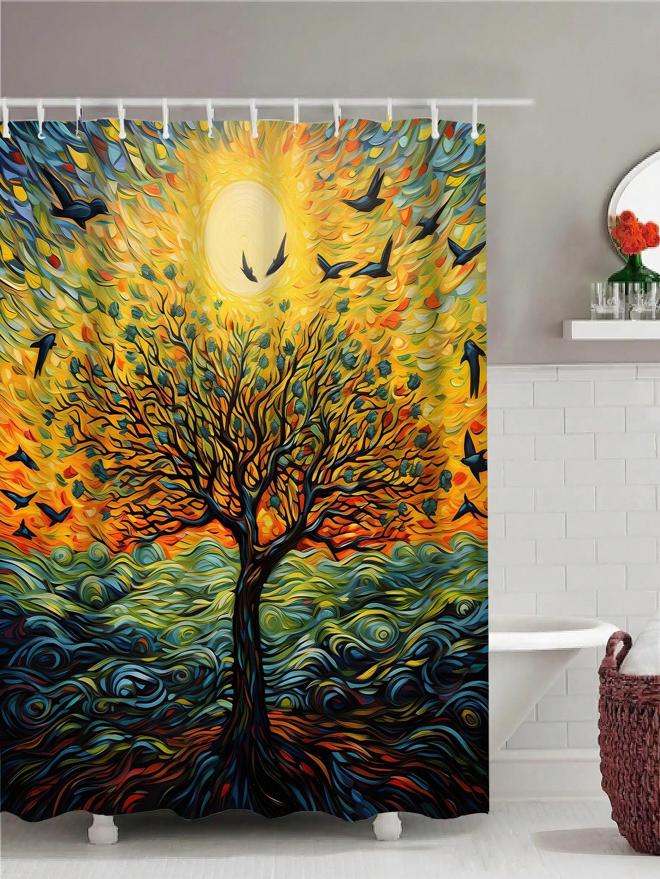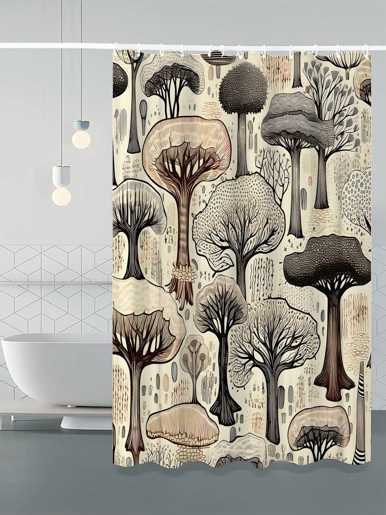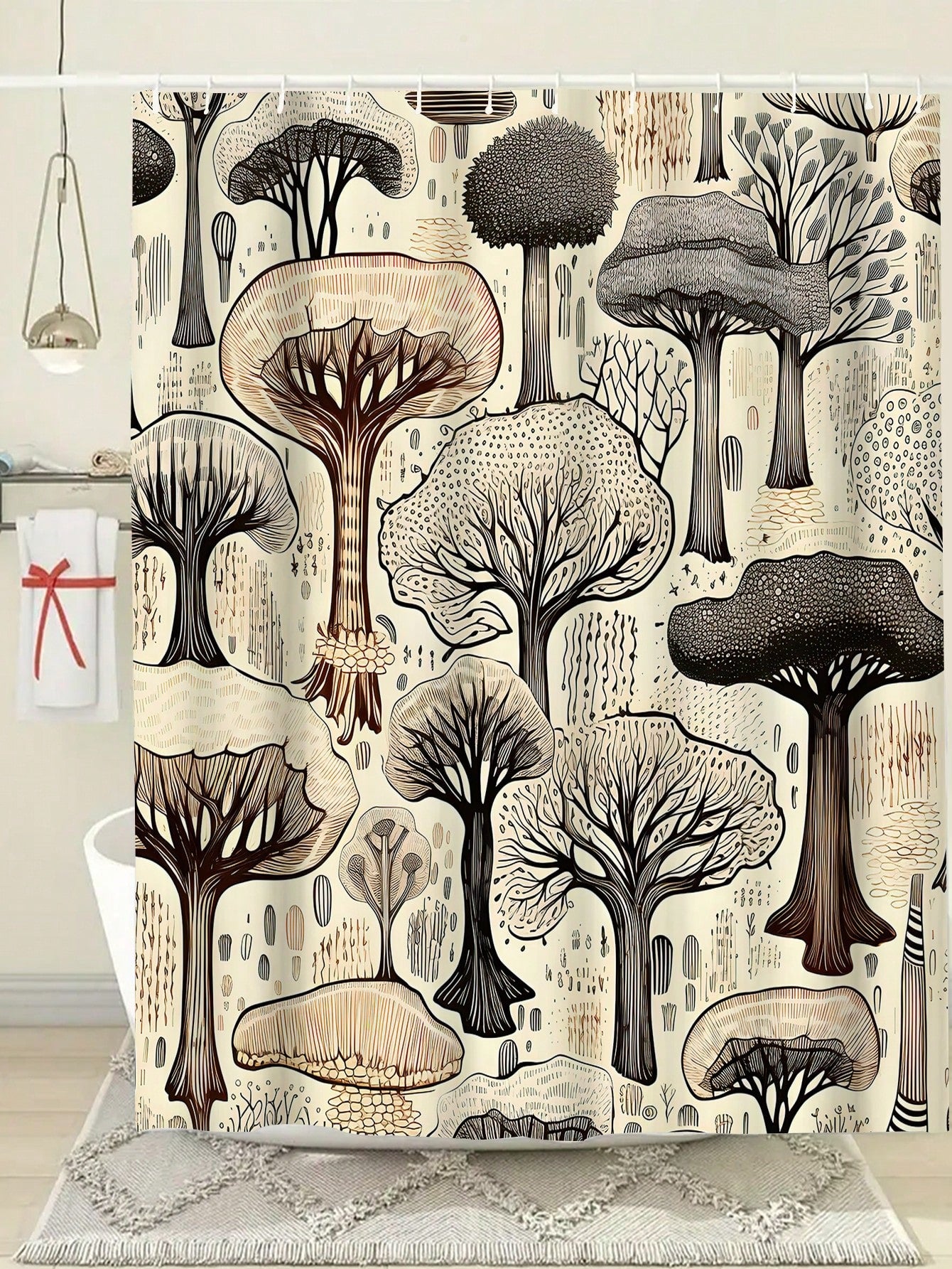 Shower Curtain. Made to withstand water and protect your bathroom, it features a sleek and simple tree design. Upgrade your decor while also keeping your bathroom clean and dry."