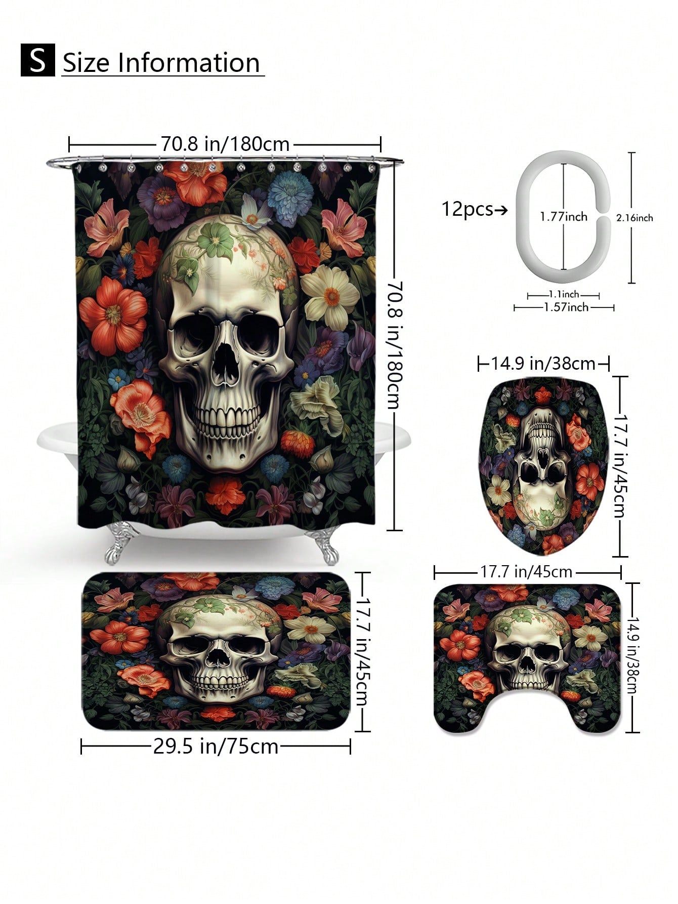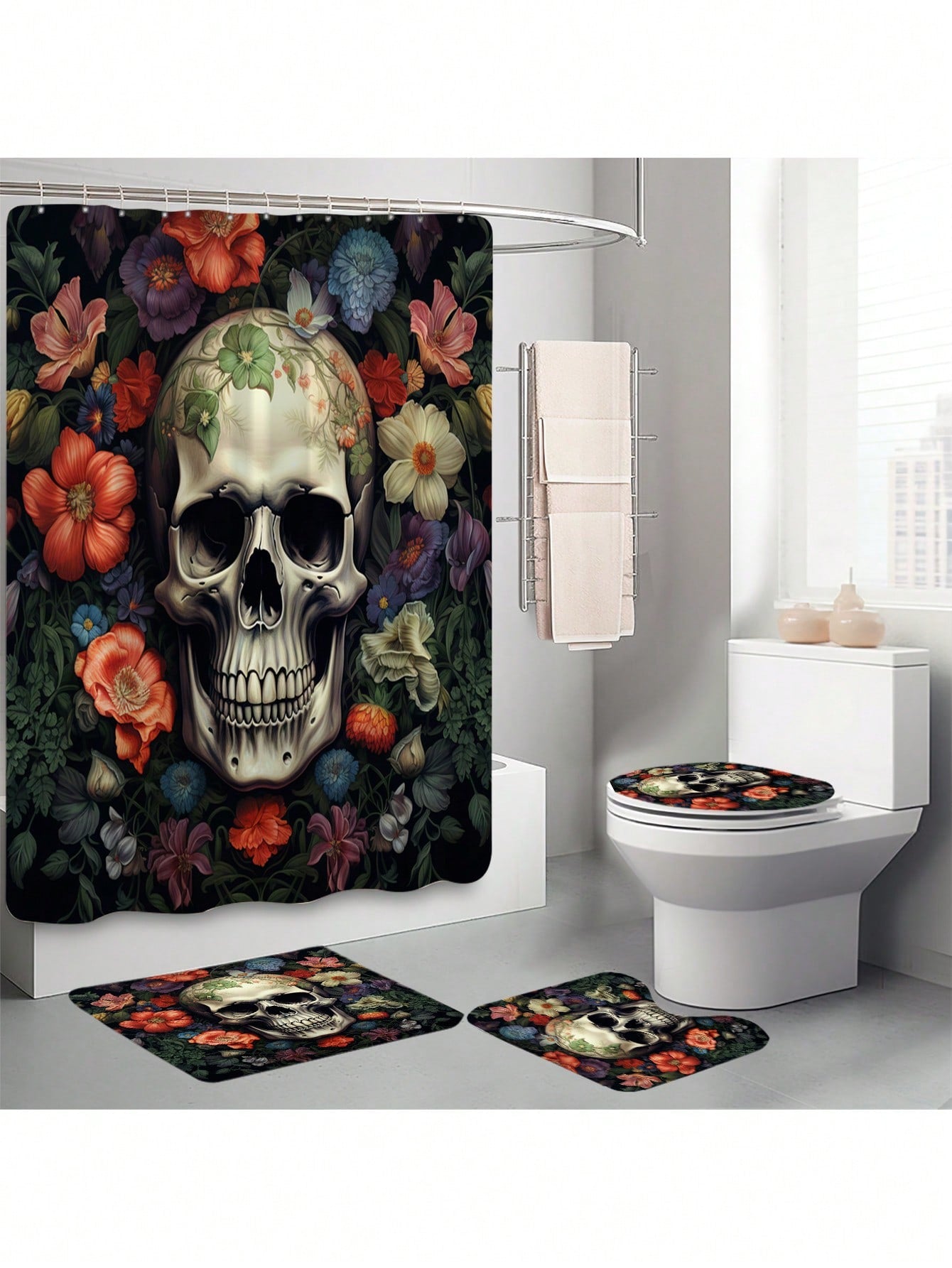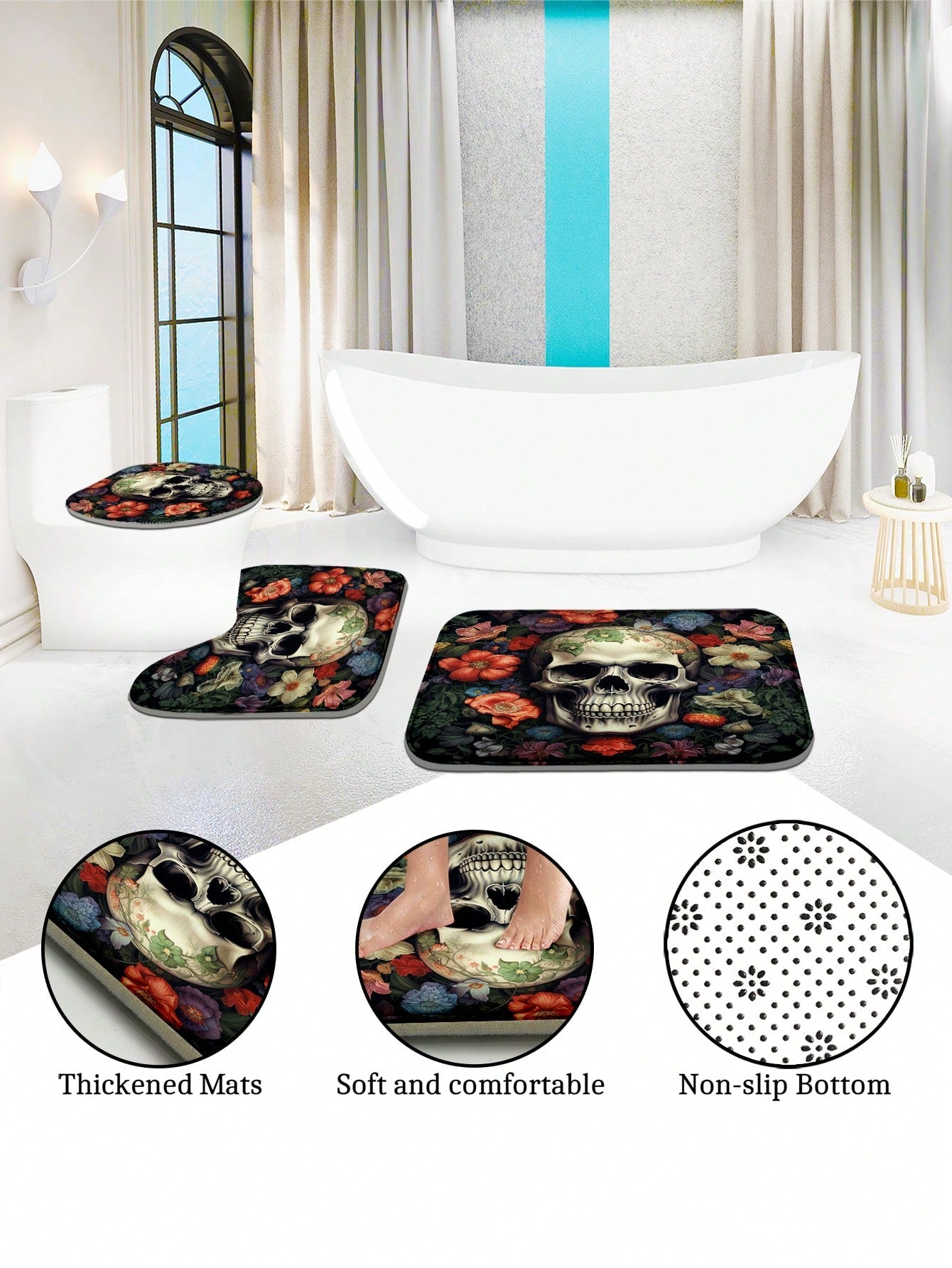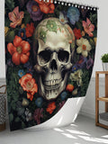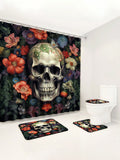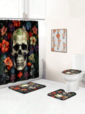 Skull Full Scene Bathroom Set: Shower Curtain, Mats, and Hooks - Waterproof and Anti-Slip for Halloween Decor