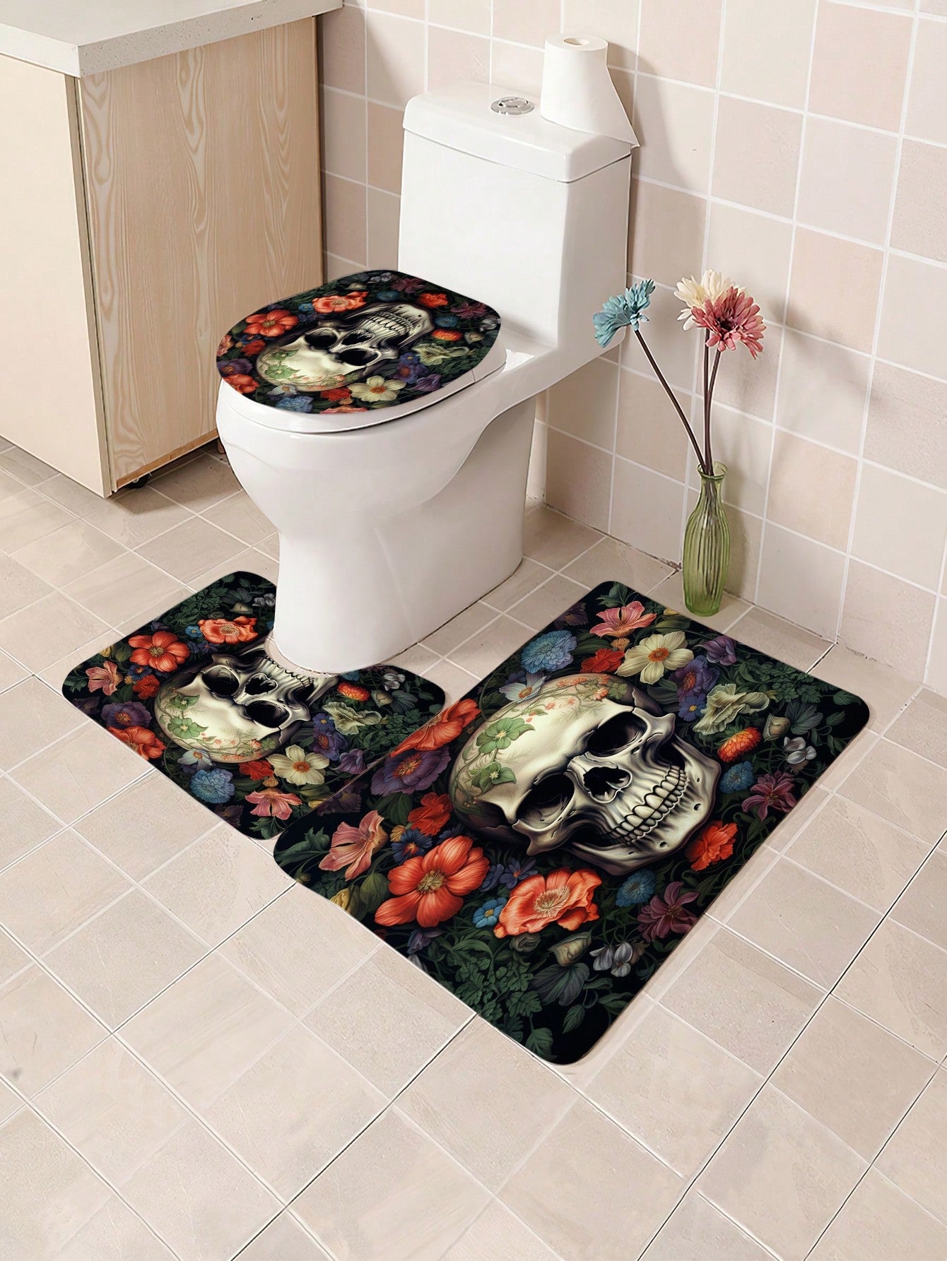Transform your bathroom into a spooky yet functional space with our Skull Full Scene Bathroom Set! This Halloween-themed set includes a shower curtain, mats, and hooks that are waterproof and anti-slip. Elevate your decor with a touch of creepiness and enjoy a safe and secure bathroom experience.