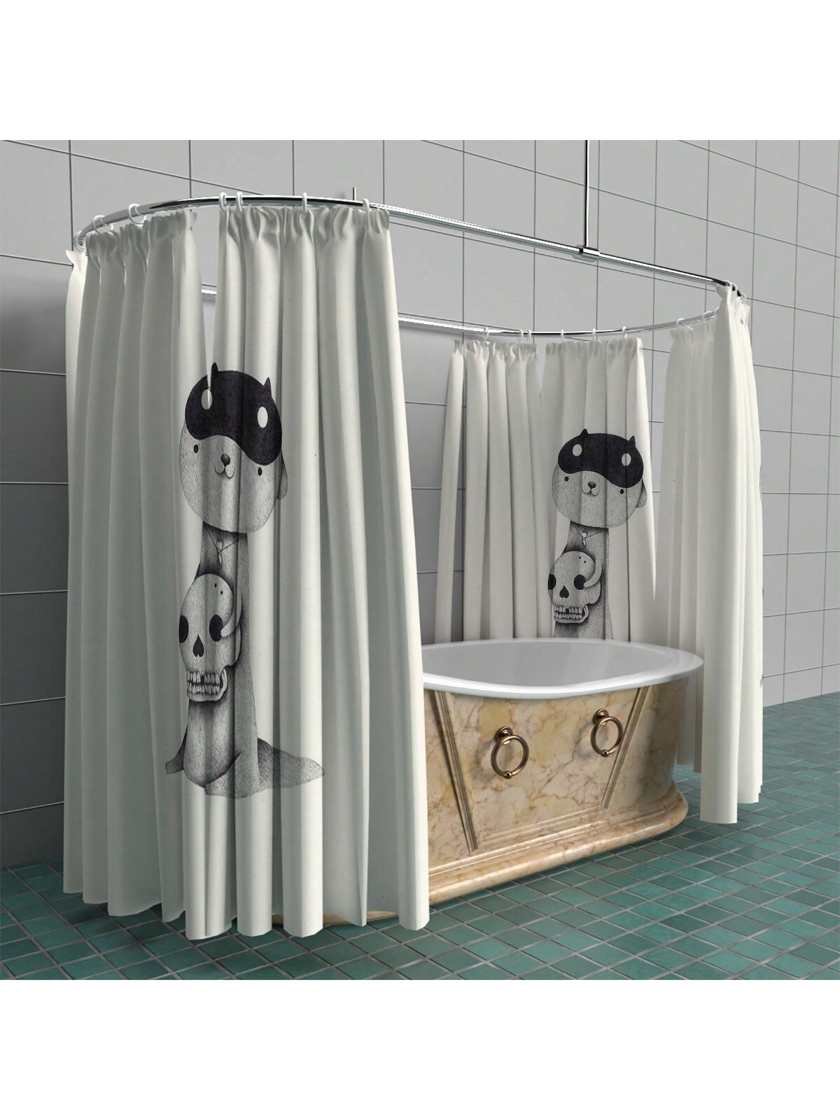 The Skull Hugging Little Cutie Shower Curtain offers superior protection and convenience. Made with waterproof and anti-mildew materials, this curtain ensures a clean and fresh bathroom. The thickened hook hanging provides additional privacy, making it an ideal choice for any home.