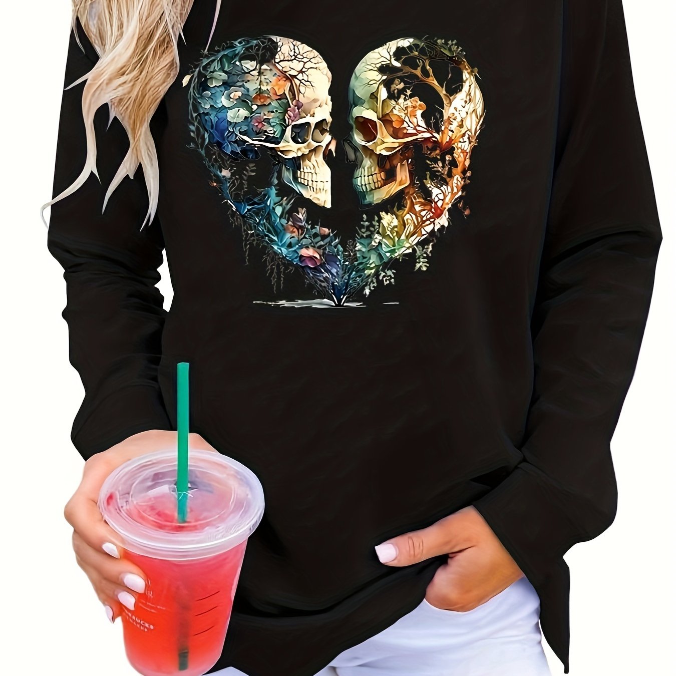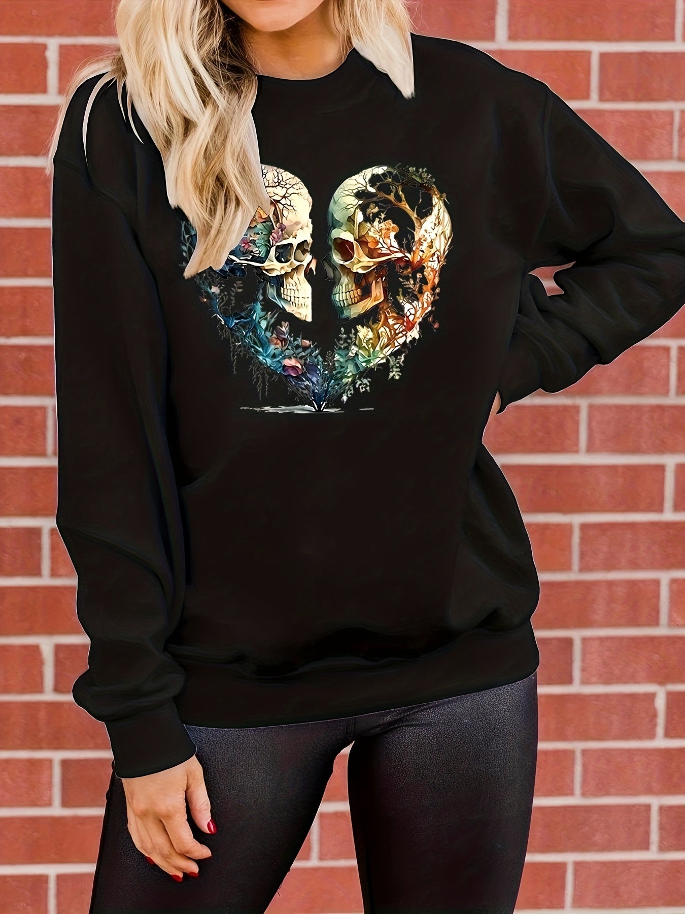 This Skull Love Print Pullover Sweatshirt is the perfect addition to your fall and winter wardrobe. Made with soft and comfortable fabric, this casual sweatshirt features a unique skull love print and long sleeves. The crew neck design adds a touch of style to this versatile women's clothing piec