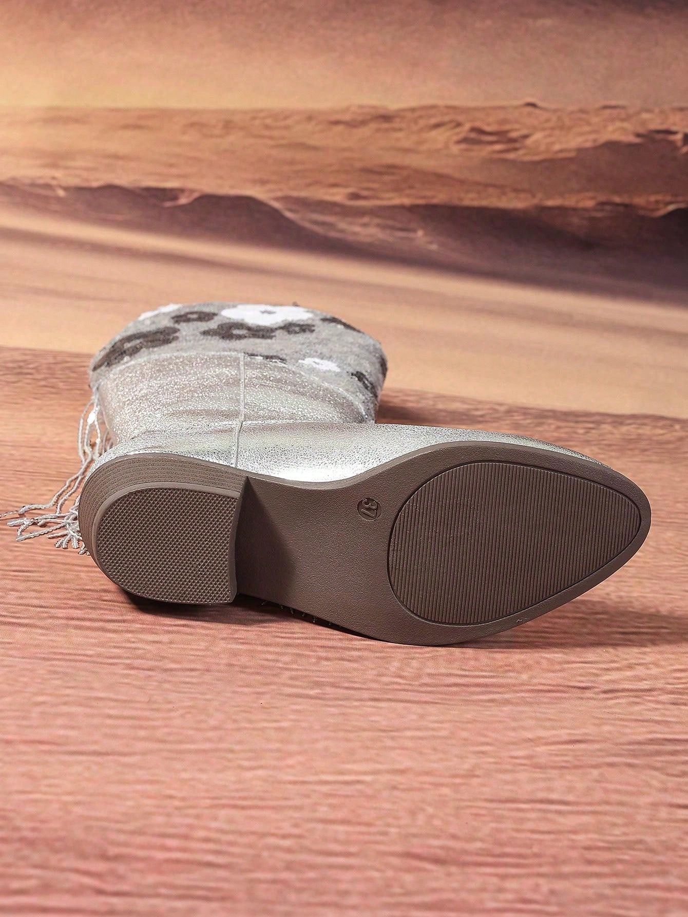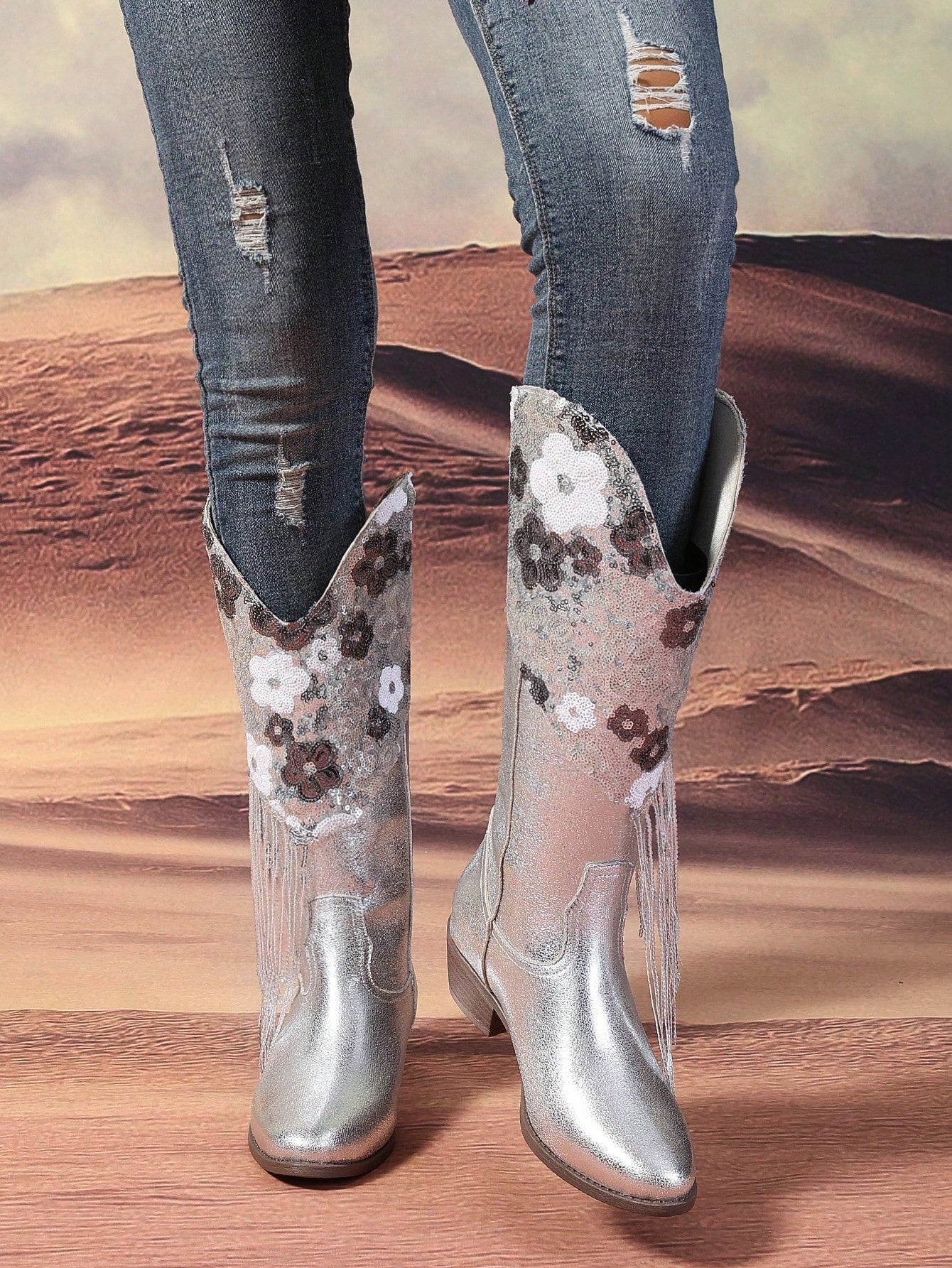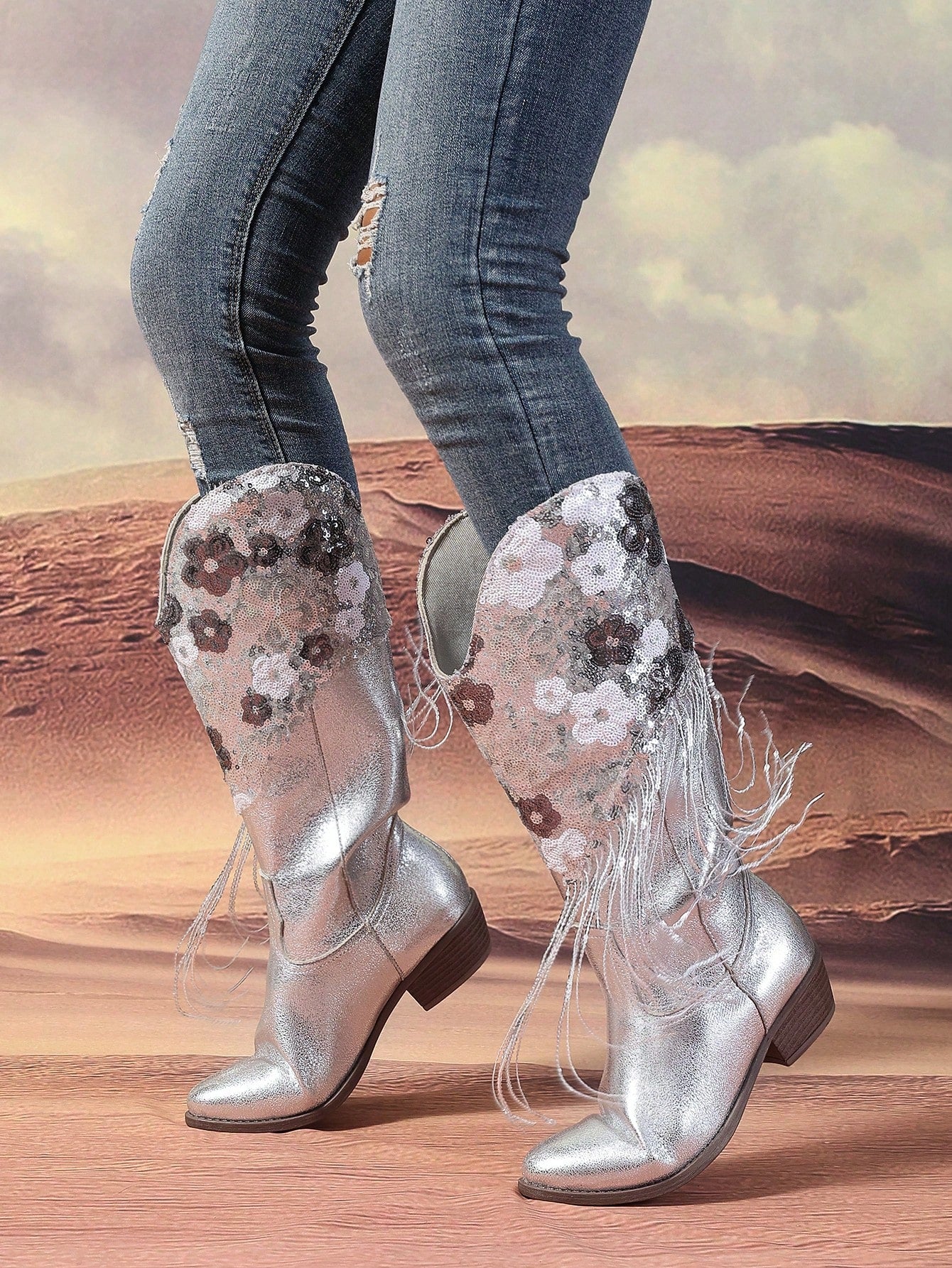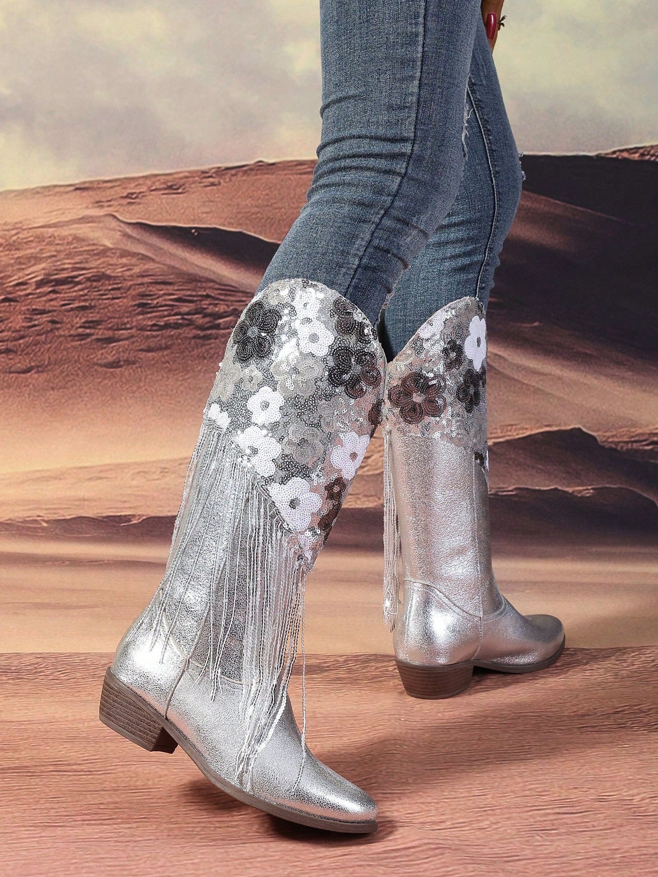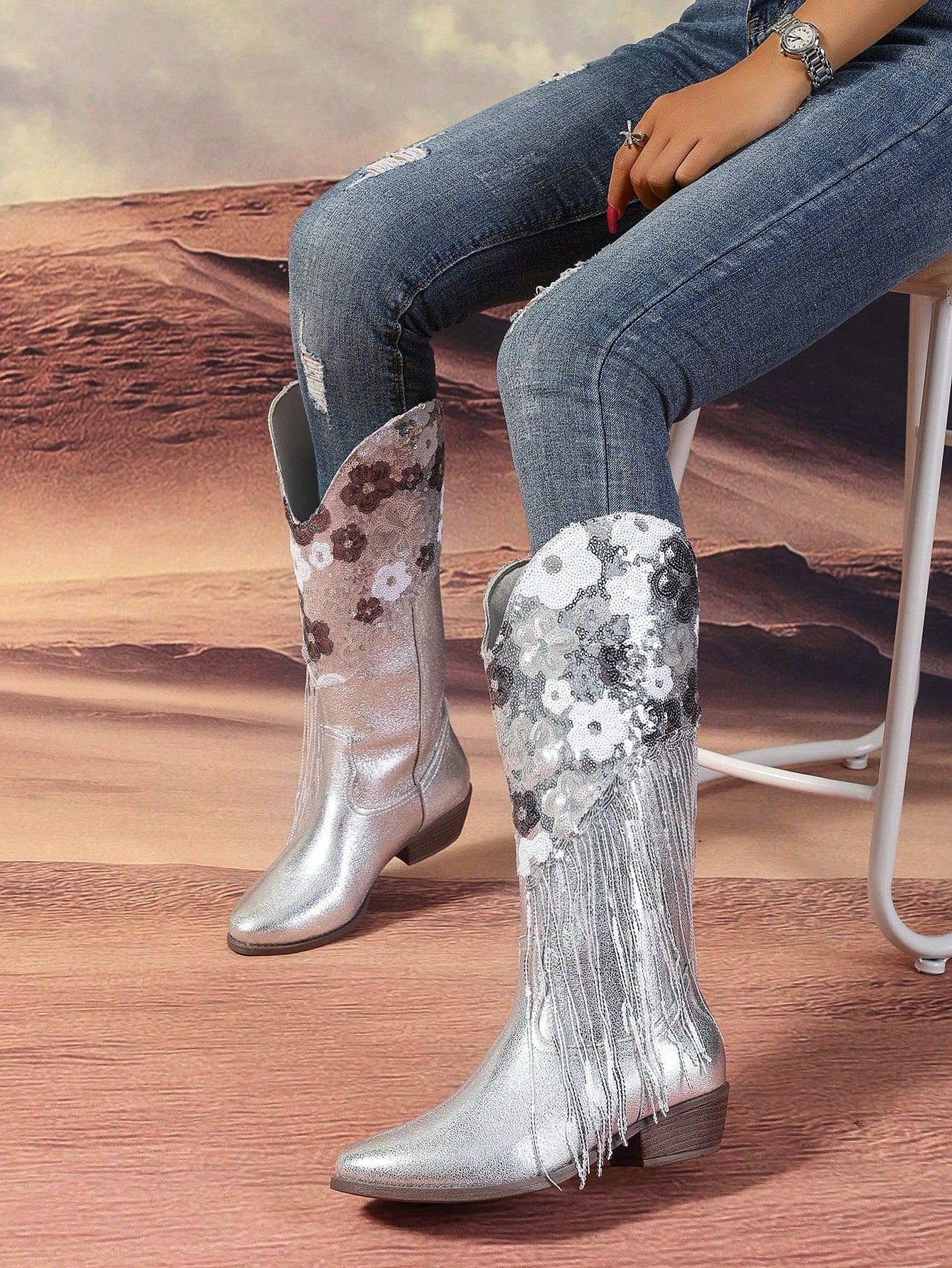 Sleek and Chic: Women's Silver Floral Sequin Tassel Trim Knight Boots for Fall/Winter Fashion