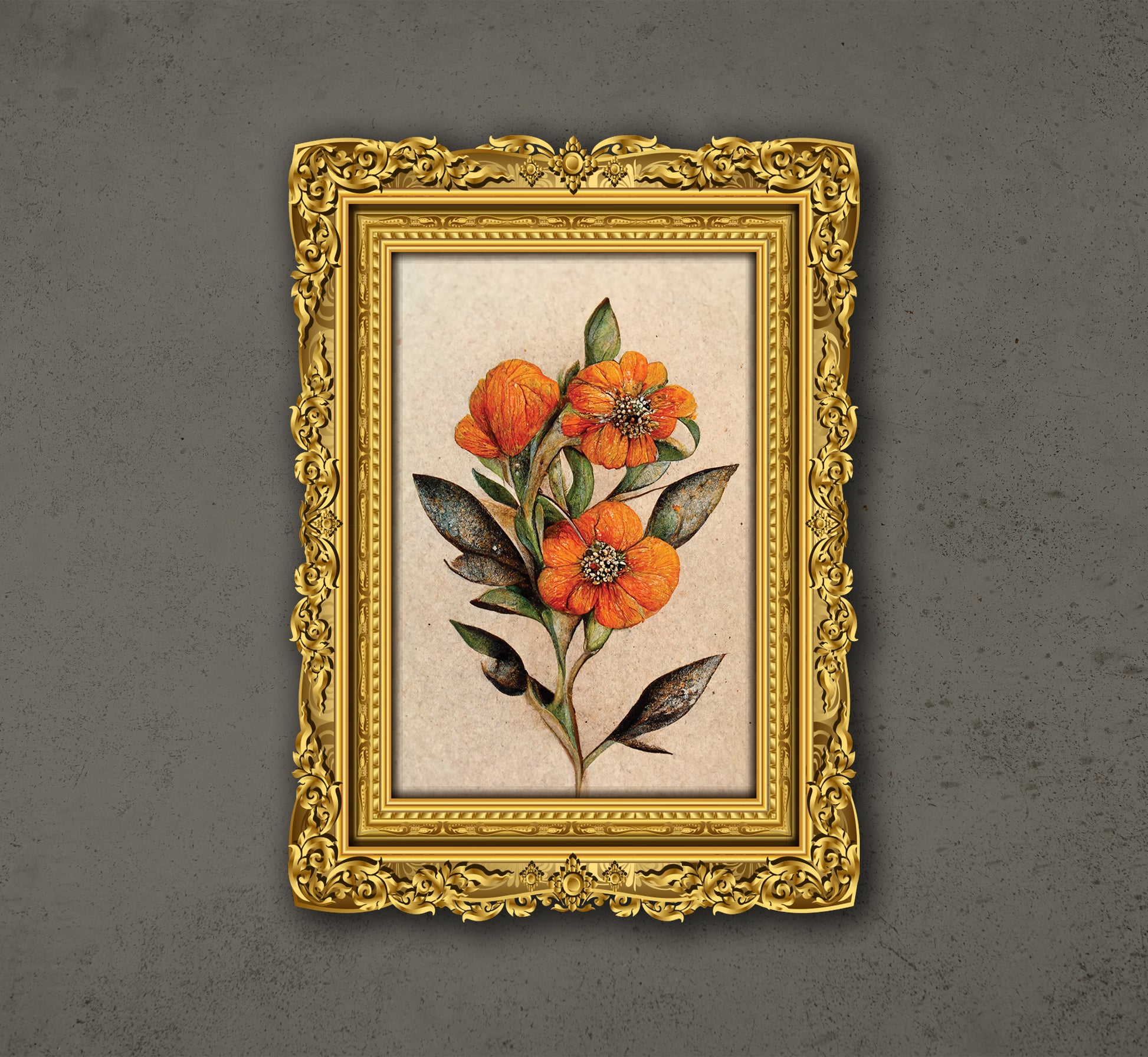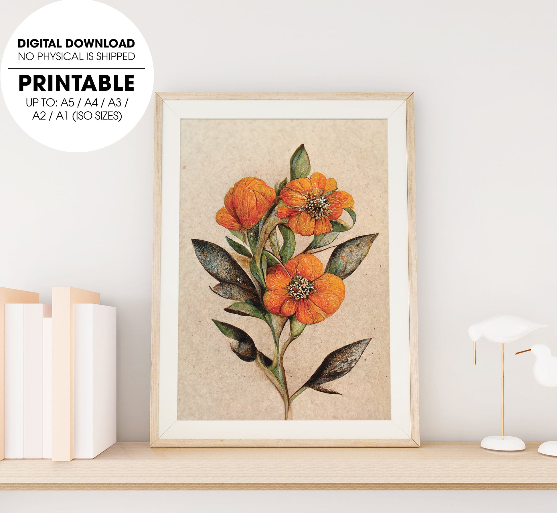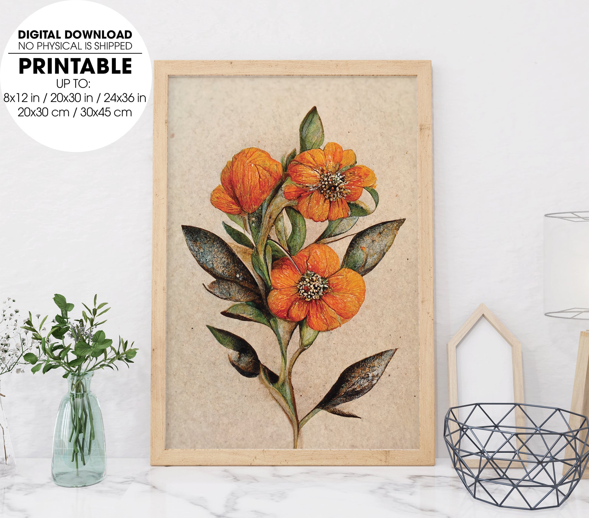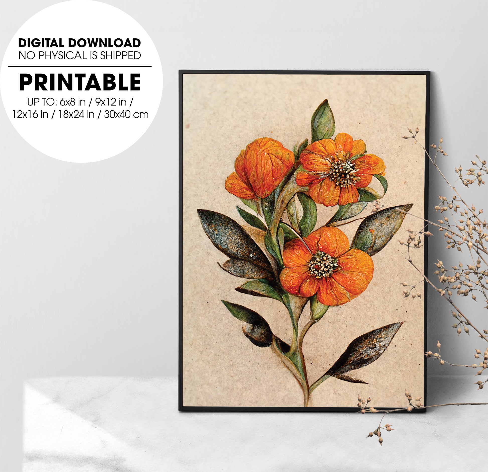 Small Cartamus Flowers, Small Orange Herbaceous Plant Vintage, Poster Design, Printable Art