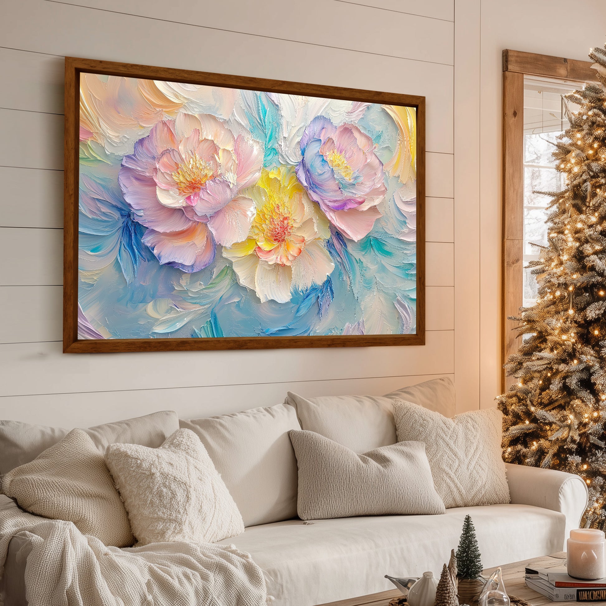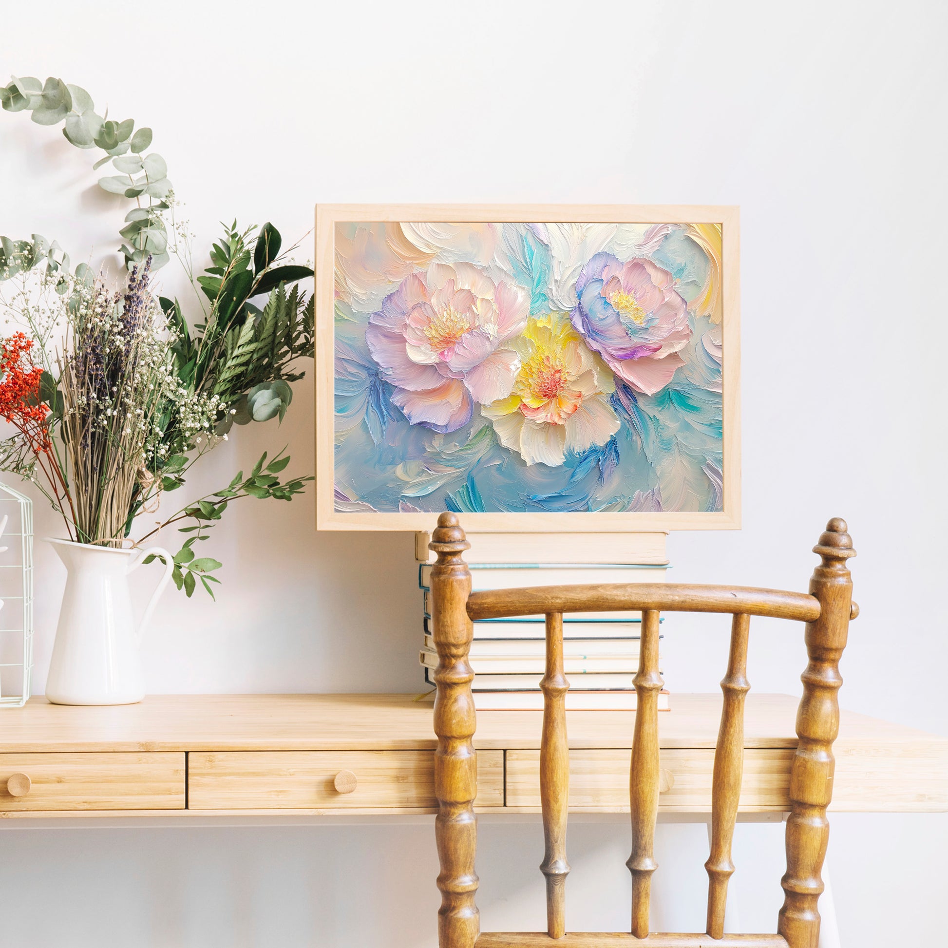A breathtaking and ethereal impasto oil painting featuring three large, blooming peonies in delicate pastel shades. The central flower glows with soft yellow and cream tones, while the outer blossoms showcase gentle pink and lavender hues. Thick, expressive palette knife strokes create a rich, three-dimensional texture that brings the floral arrangement to life. Set against a swirling background of light teal and soft neutrals, this romantic and modern floral artwork adds a sense of calm and elegance to any interior space, perfect for a bedroom or living room.