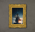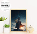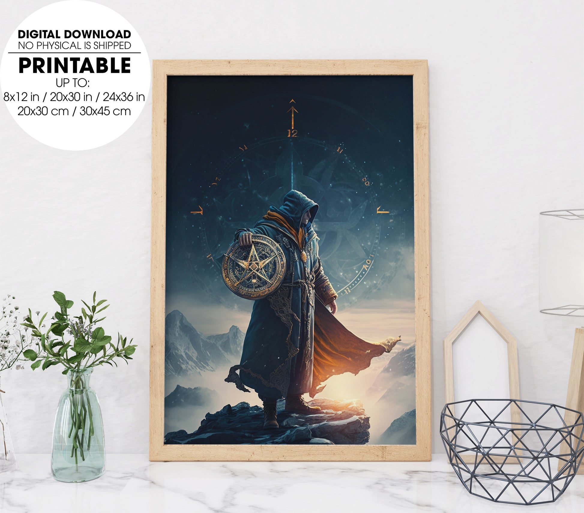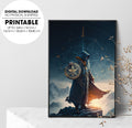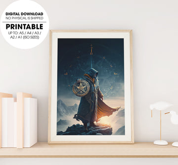 Sorcerer Standing On The Mountain, The Warrior Holds The Shield, Poster Design, Printable Art