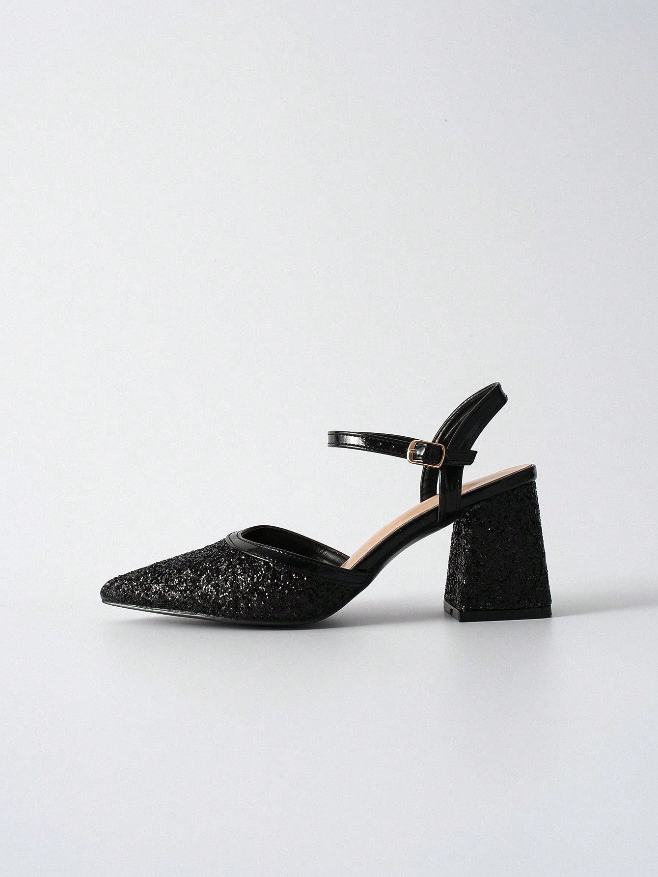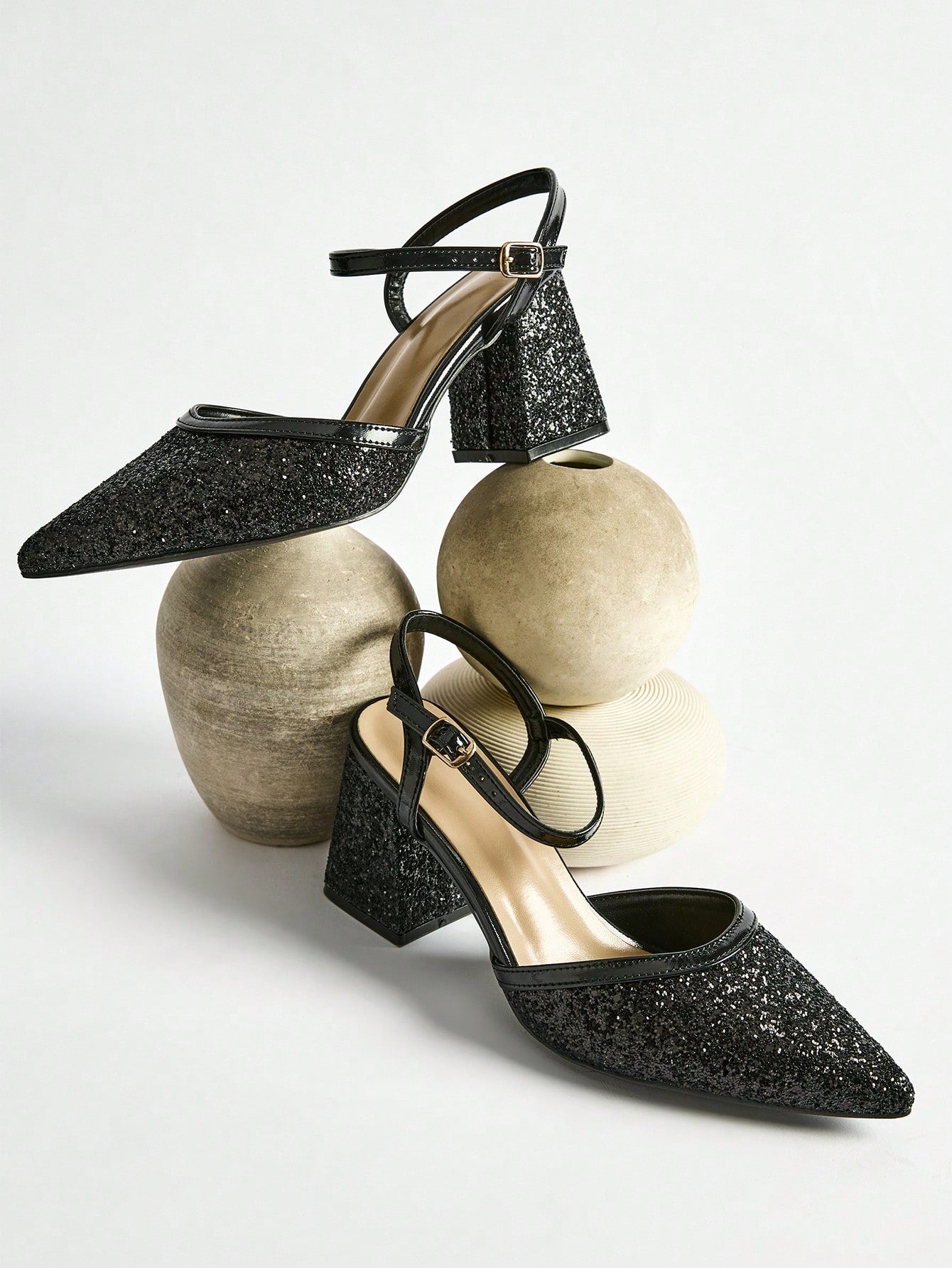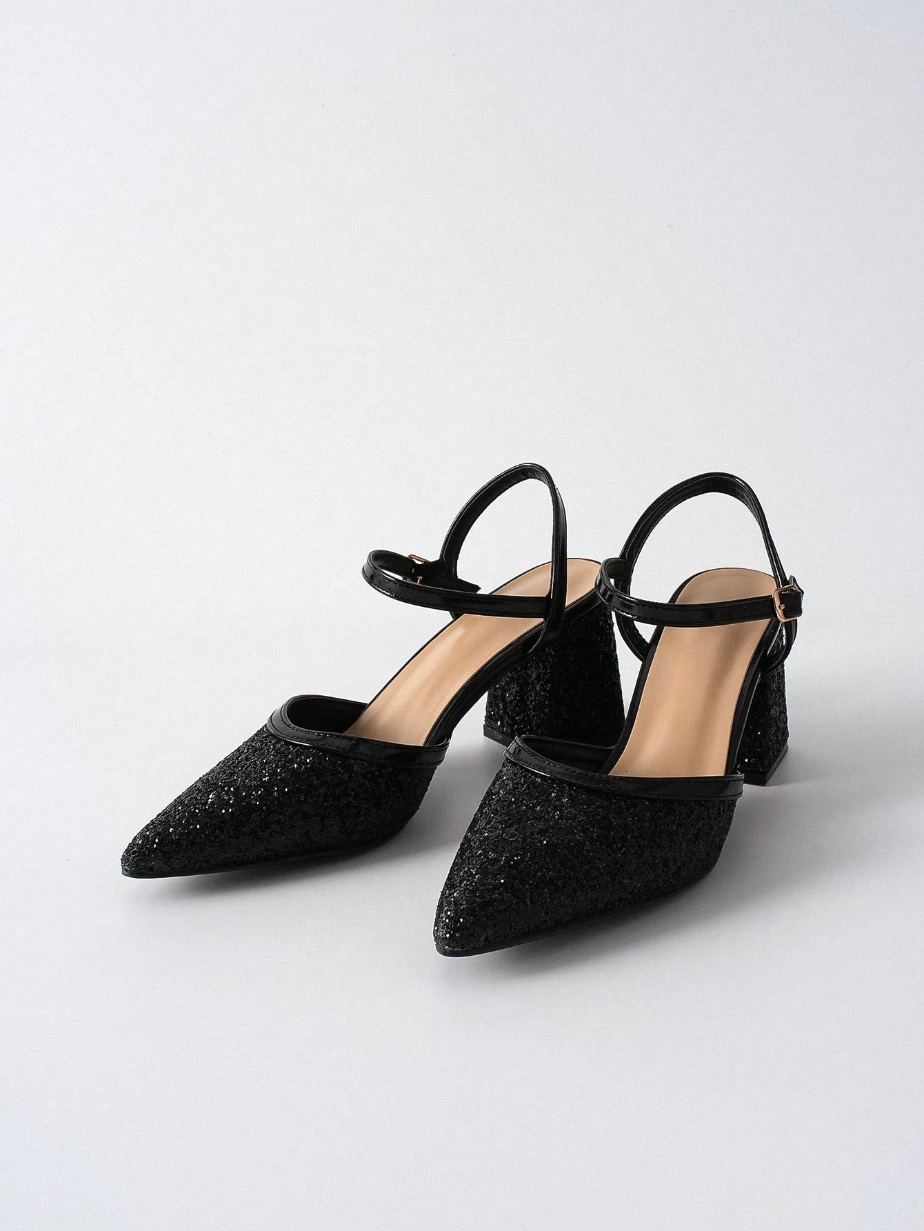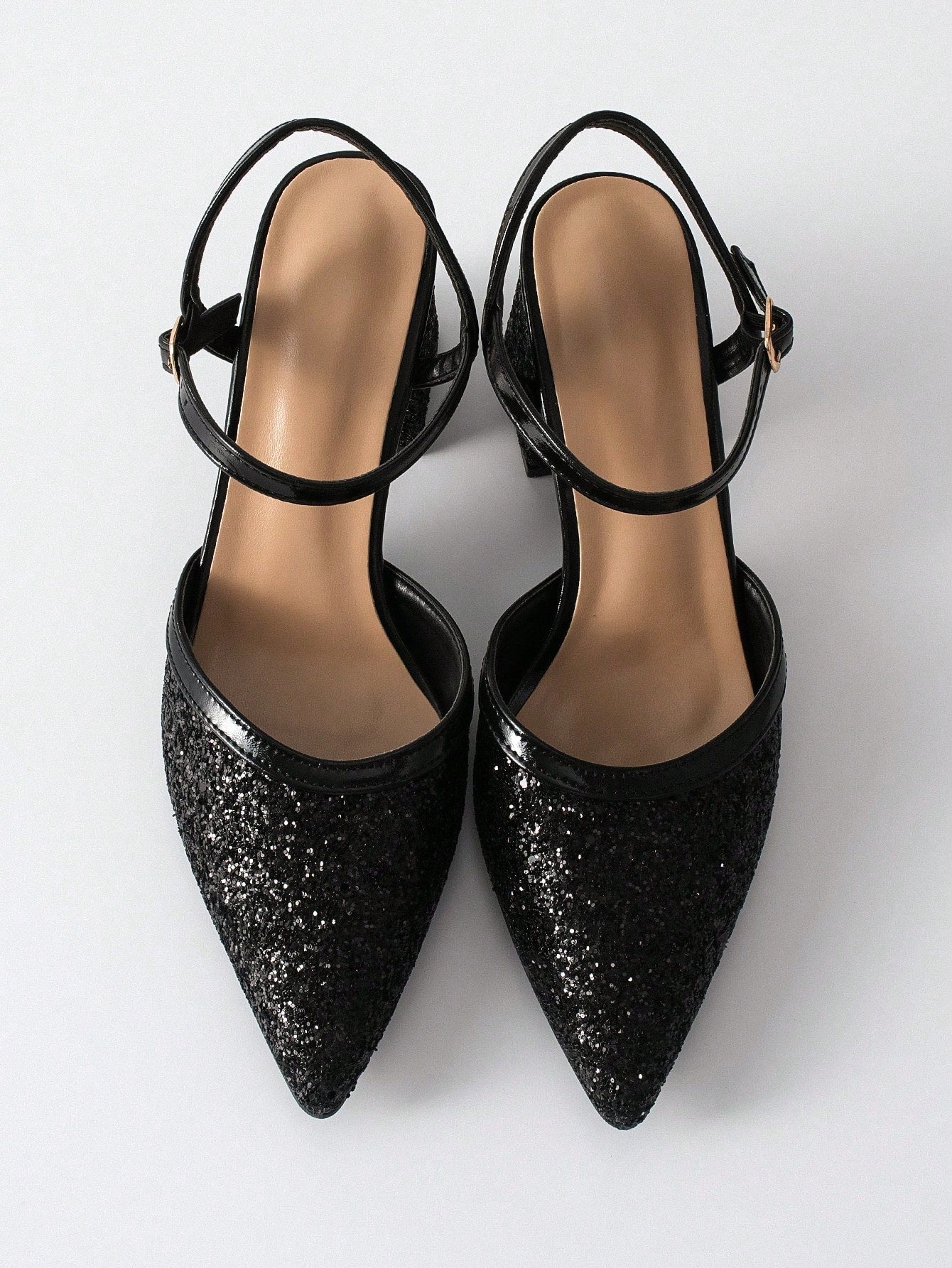 Sparkle in Style: Open Heel Pointed Toe Black Glitter High Heel Shoes for Winter Elegance
