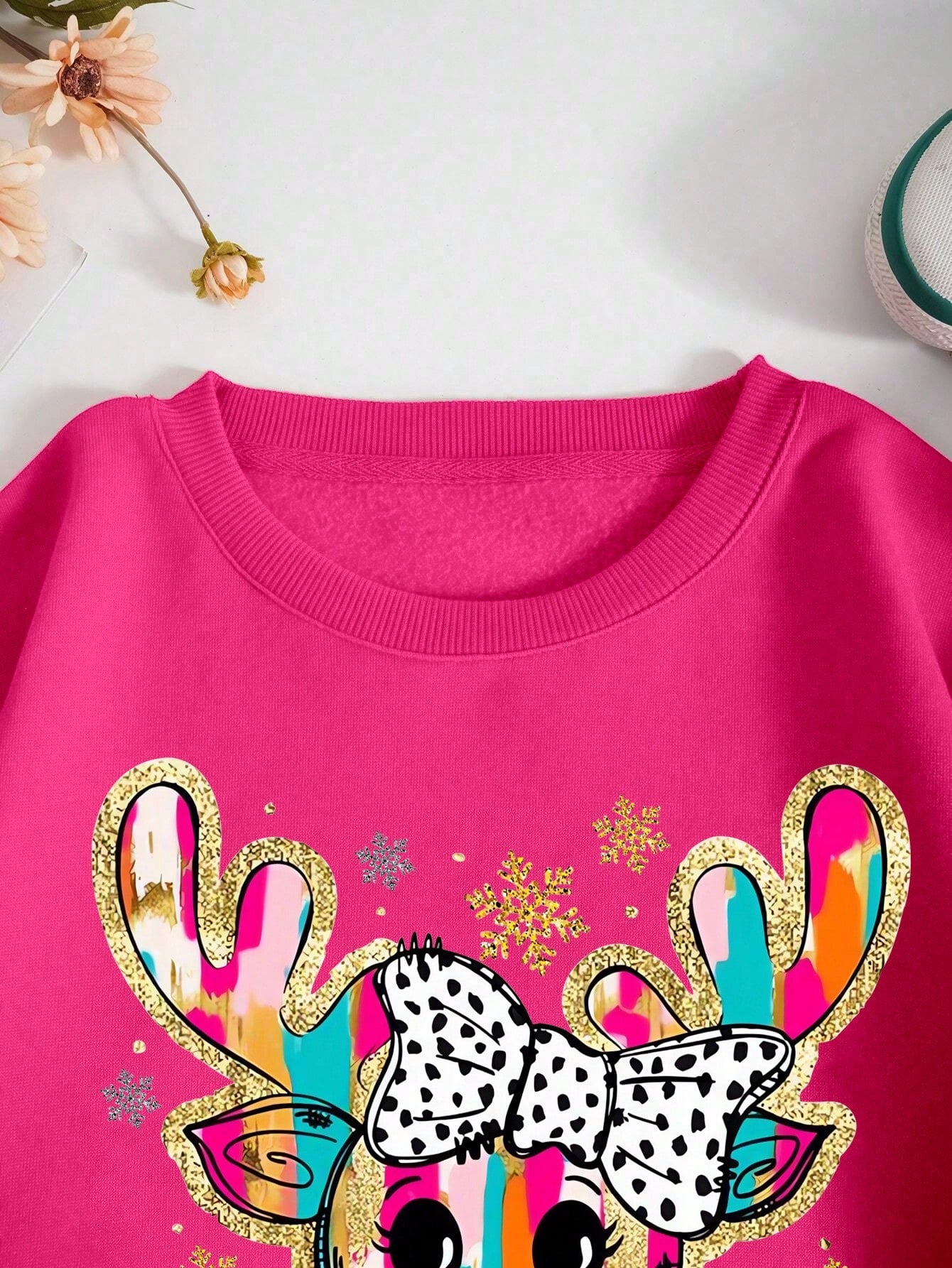 Sparkling Christmas Spirit: Colorful Reindeer Print Crew Neck Sweatshirt for Women