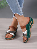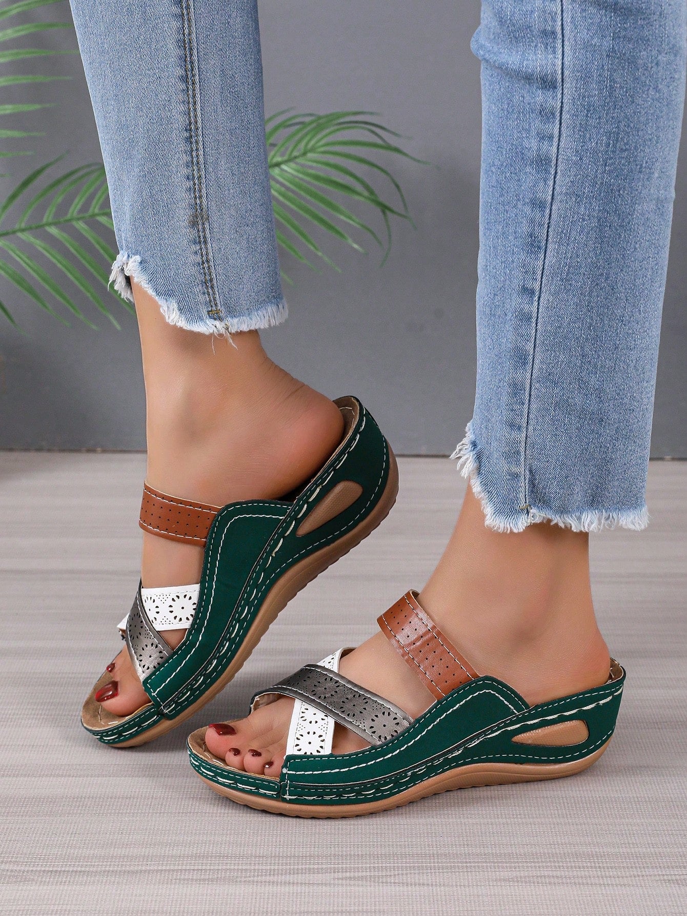 Upgrade your summer style with Sparkling Comfort: Women's Rhinestone-Decorated Wedge Slide Sandals. Adorned with rhinestones, these sandals add a touch of glamour to any outfit. The comfortable wedge heel provides both style and support for all-day wear. Elevate your fashion game this season.