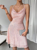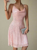 Sparkling Nights: Women's Halter Cowl Collar Sequin Embellished Dress in Pink