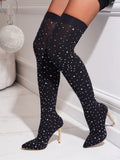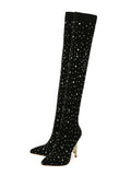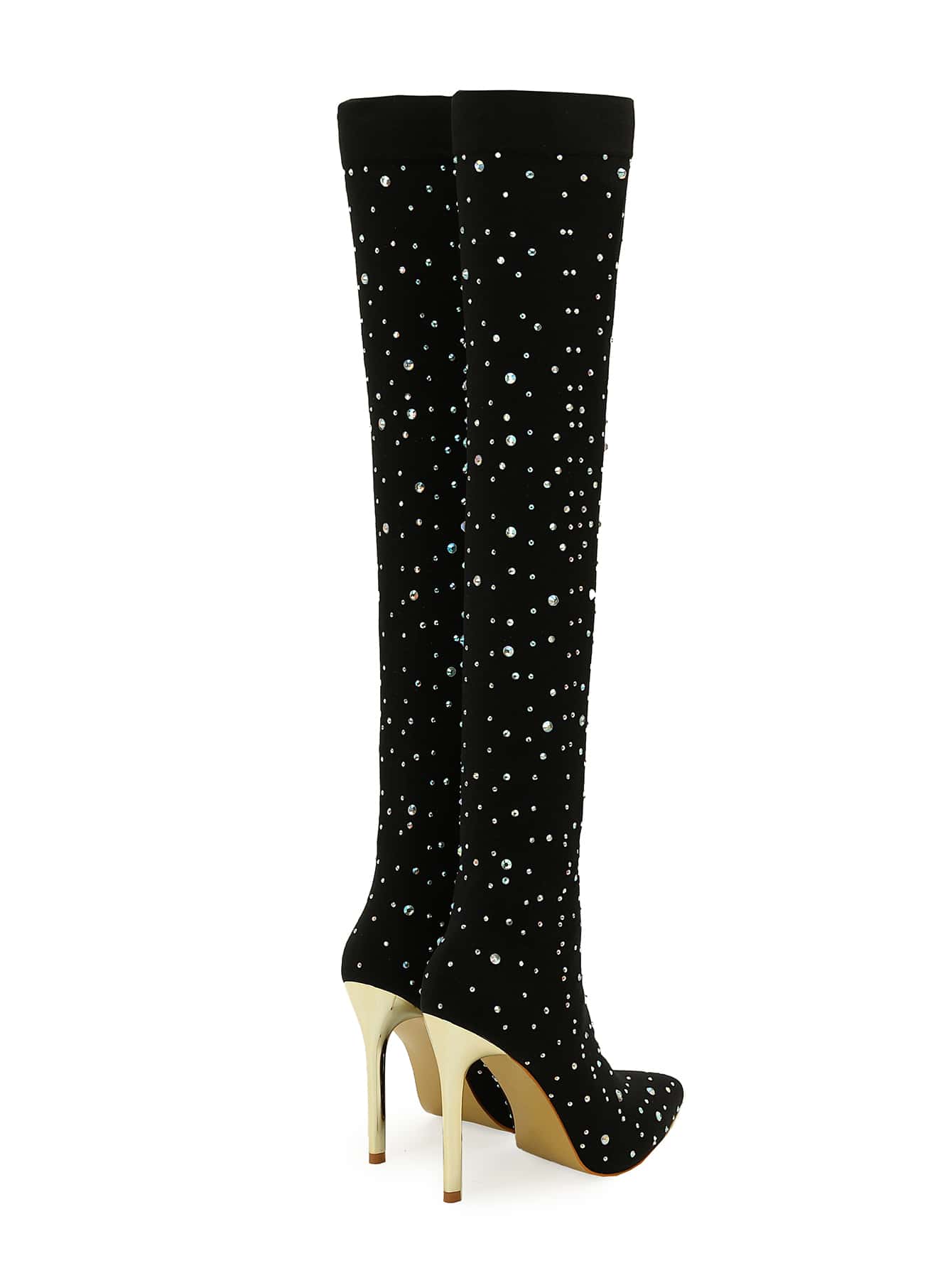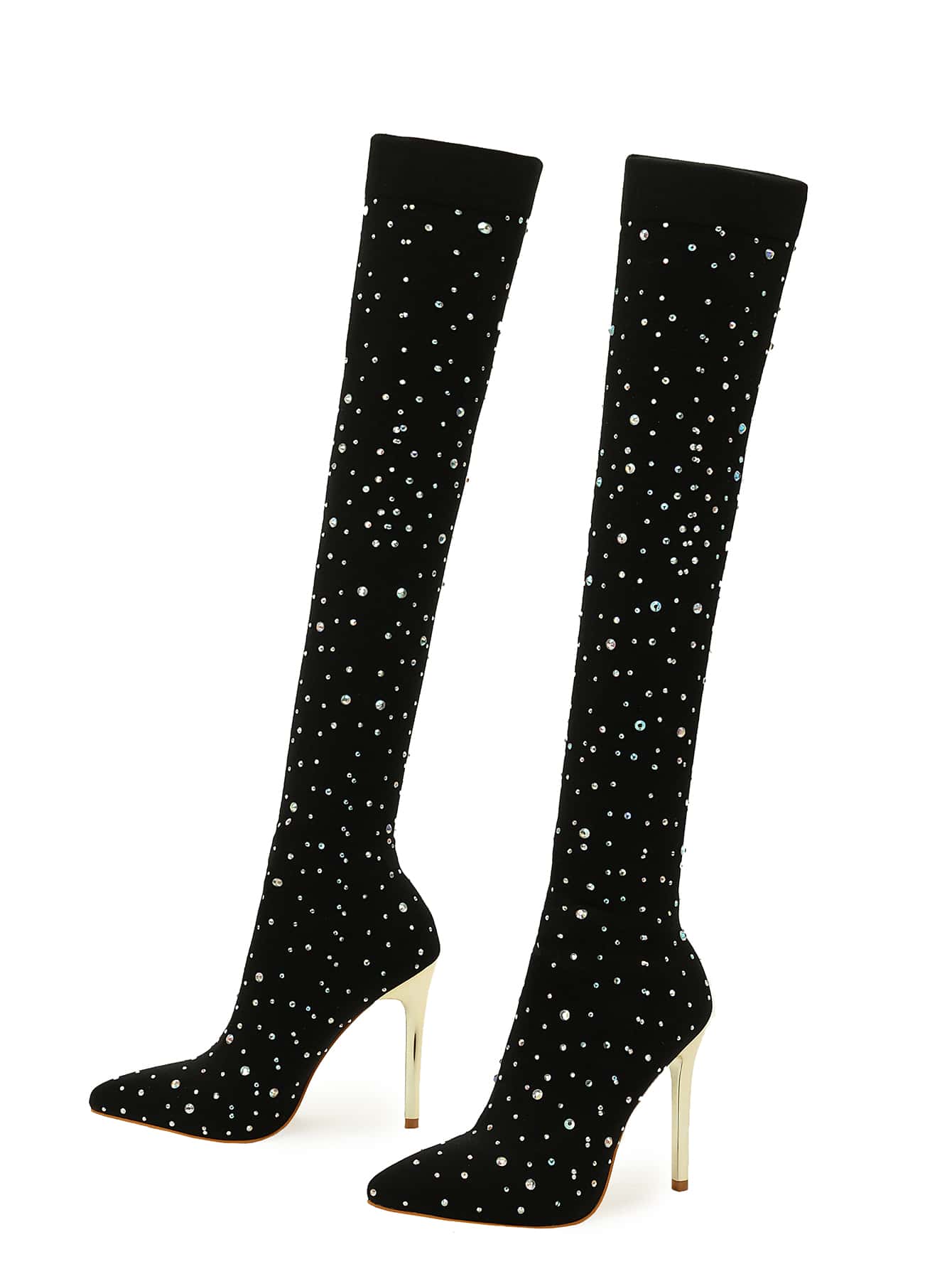 Boots. Featuring a pointed toe design and sparkling rhinestone embellishments, these boots add a touch of sophistication to any outfit. With a high heel, they give you added height and confidence. Perfect for a night out or special occasion."