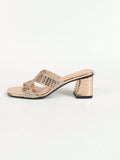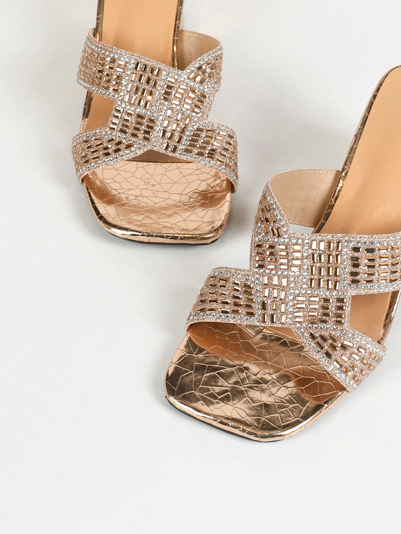 - Sparkling Steps: Women's Chunky Heel Gold Glitter Slide Sandals with Rhinestone Detailing offer a stunning way to elevate any outfit. The chunky heel provides stability and the gold glitter adds a touch of glamour. The rhinestone detailing adds a touch of luxury.