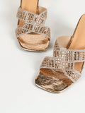 Sparkling Steps: Women's Chunky Heel Gold Glitter Slide Sandals with Rhinestone Detailing