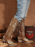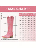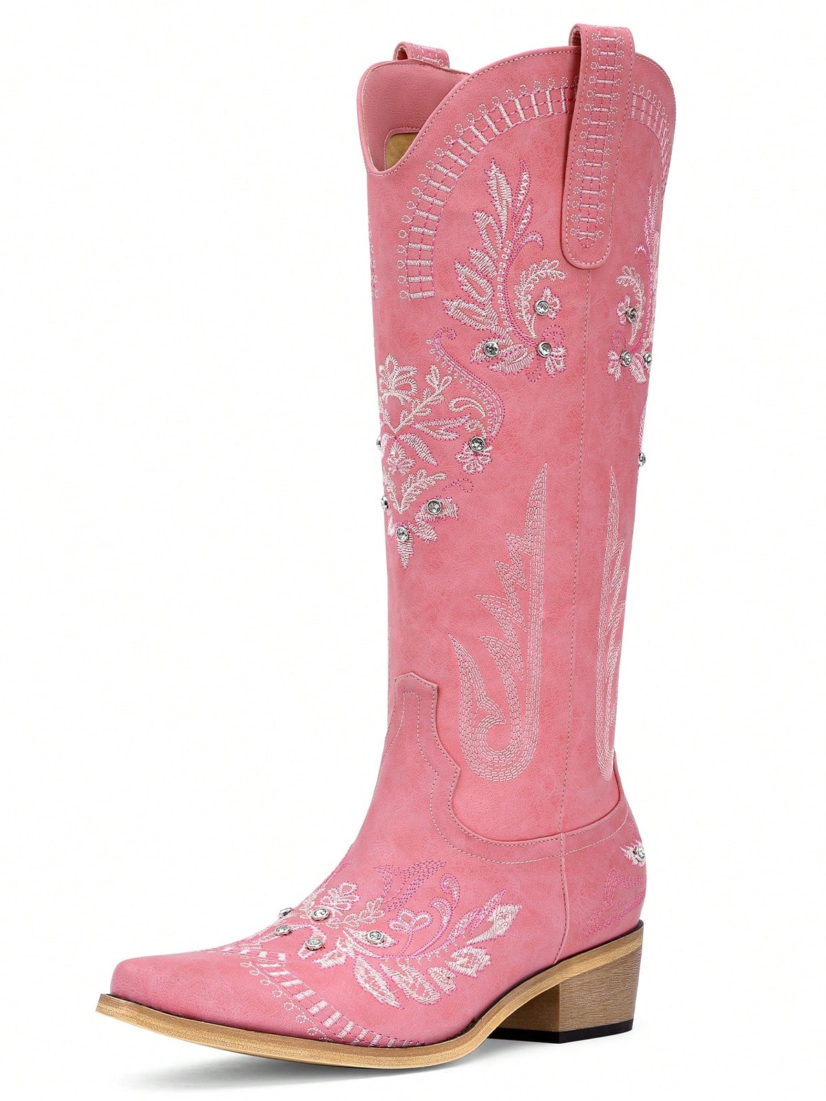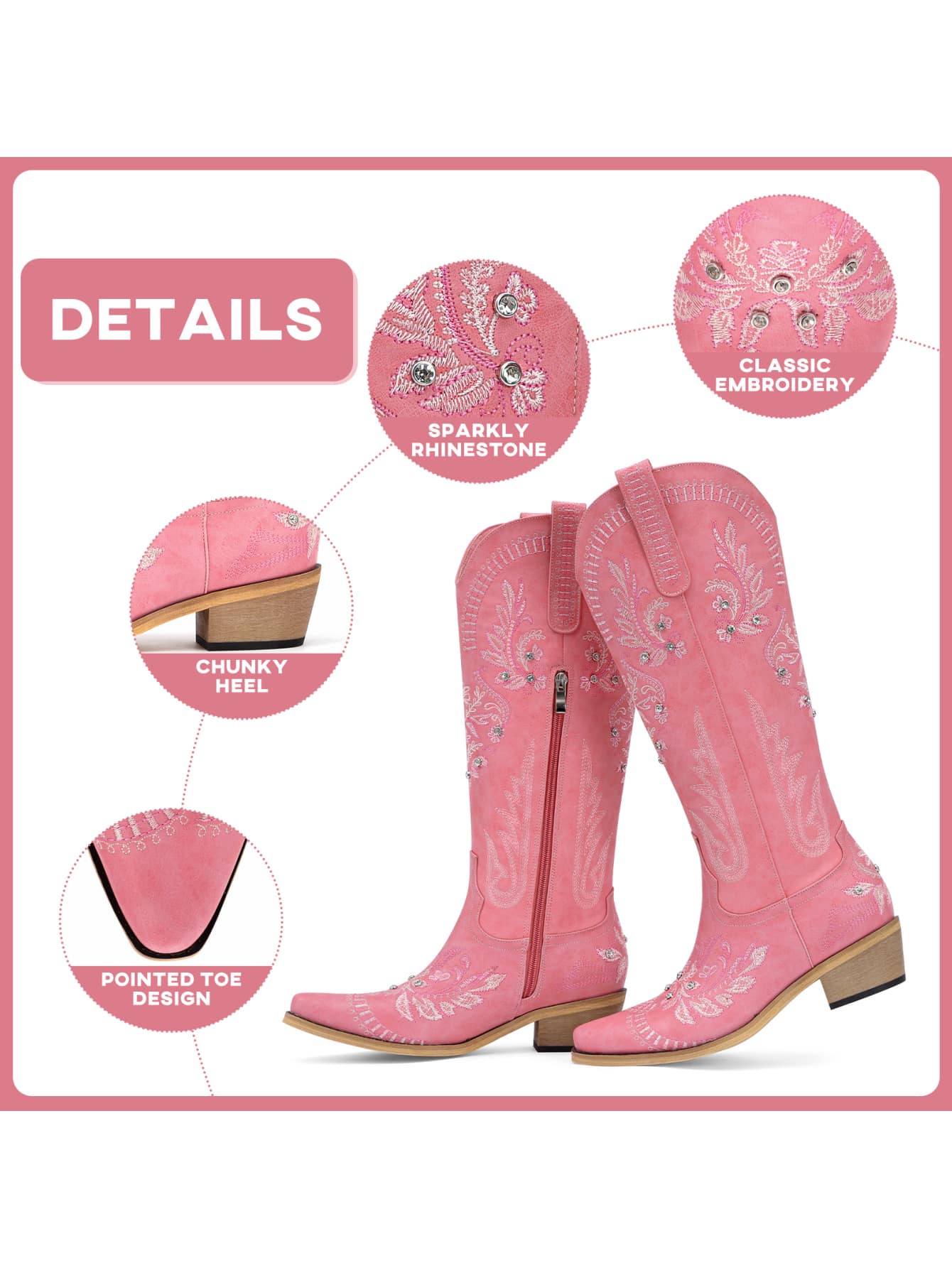 Sparkly Rhinestone Western Cowboy Boots for Women - Retro Knee-High Vintage Style with Classic Embroidery and Chunky Heel