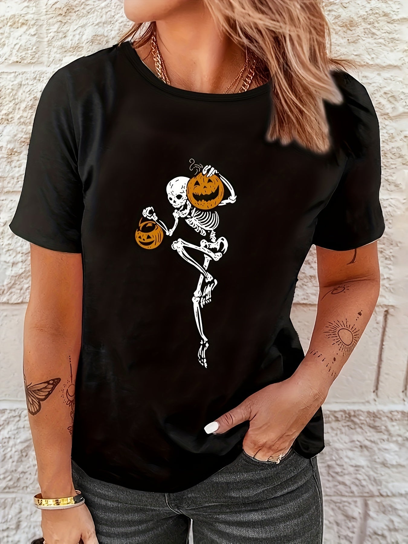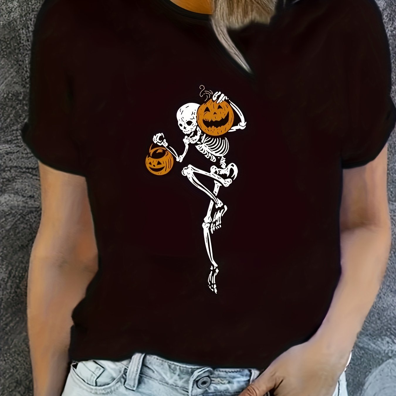 Spooky and Stylish: Halloween Skeleton Pumpkin Print T-Shirt For Women - Perfect for Spring and Summer!