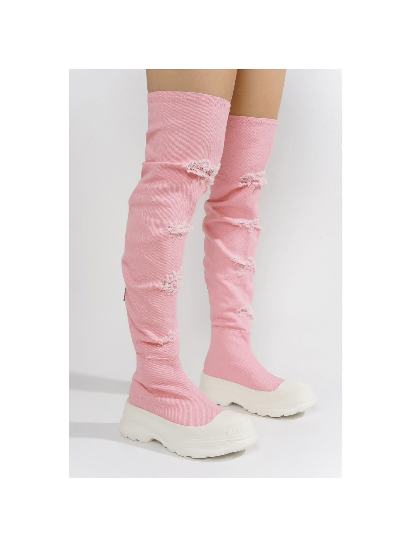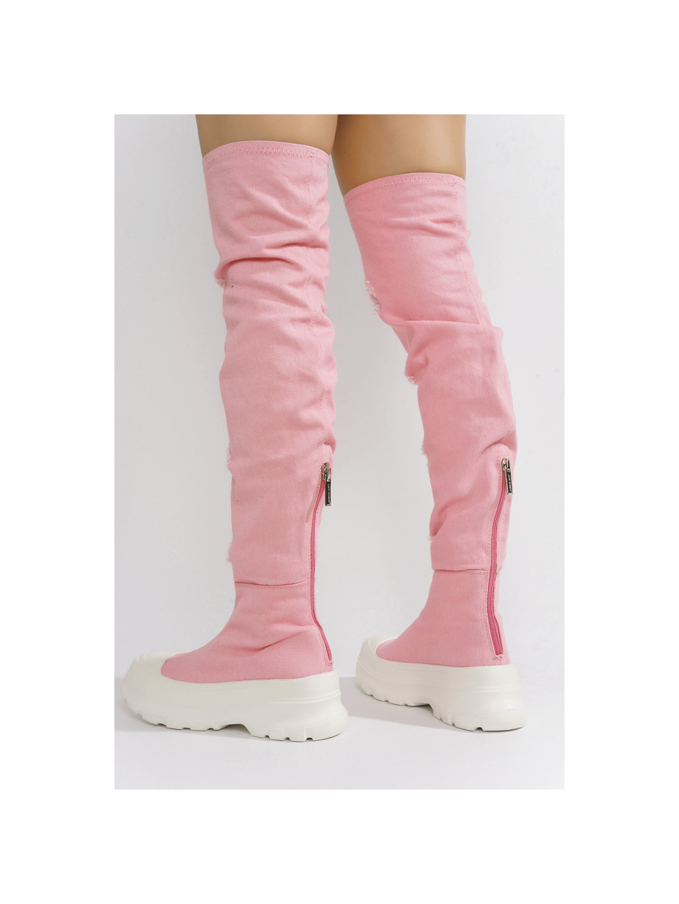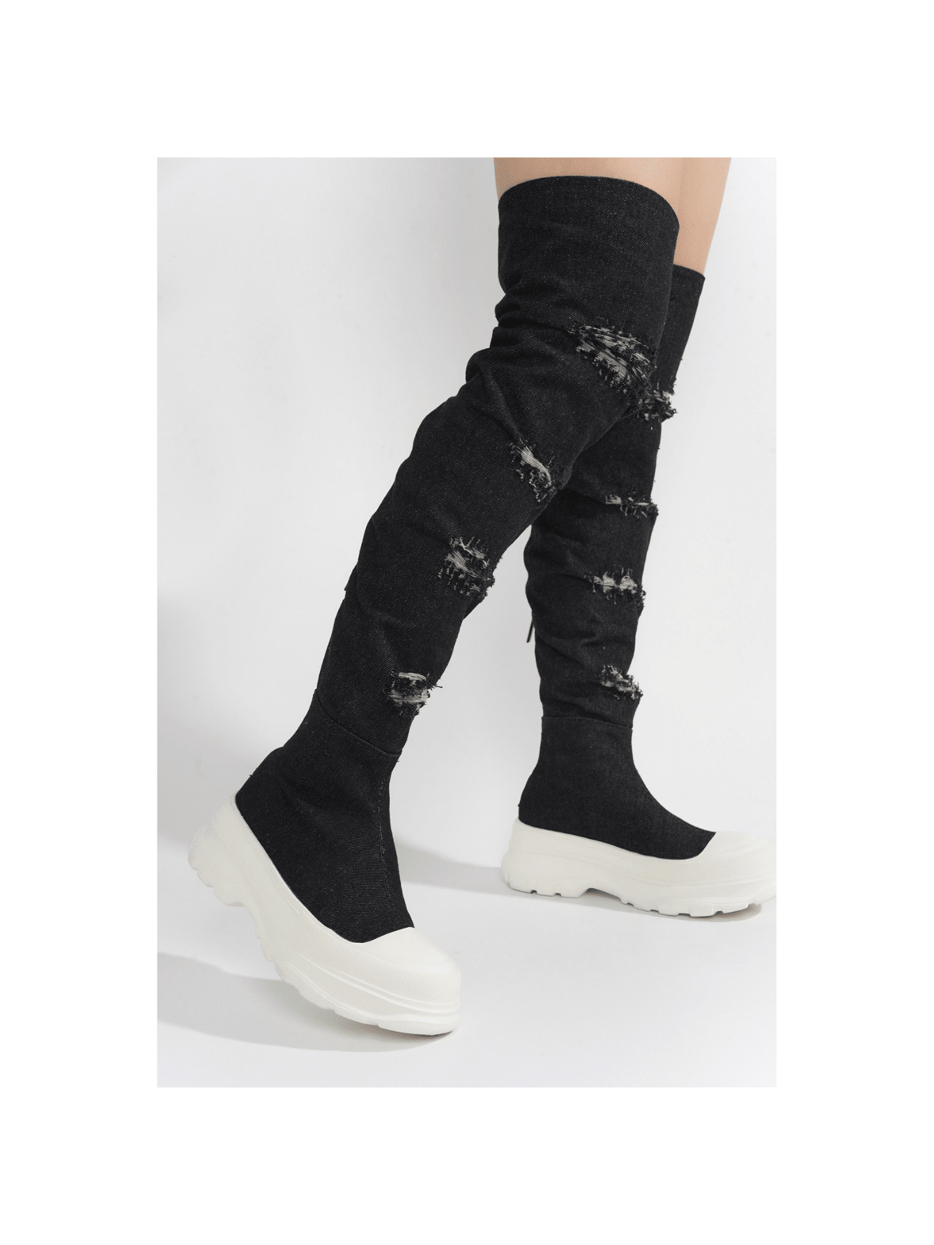 Upgrade your fashion game with our Chunky Sole Thigh High Denim Sneakers. These statement shoes combine trendsetting chunky soles with thigh-high denim for a unique and stylish look. Elevate any outfit and make a bold fashion statement with these must-have sneakers.