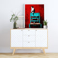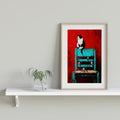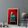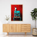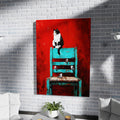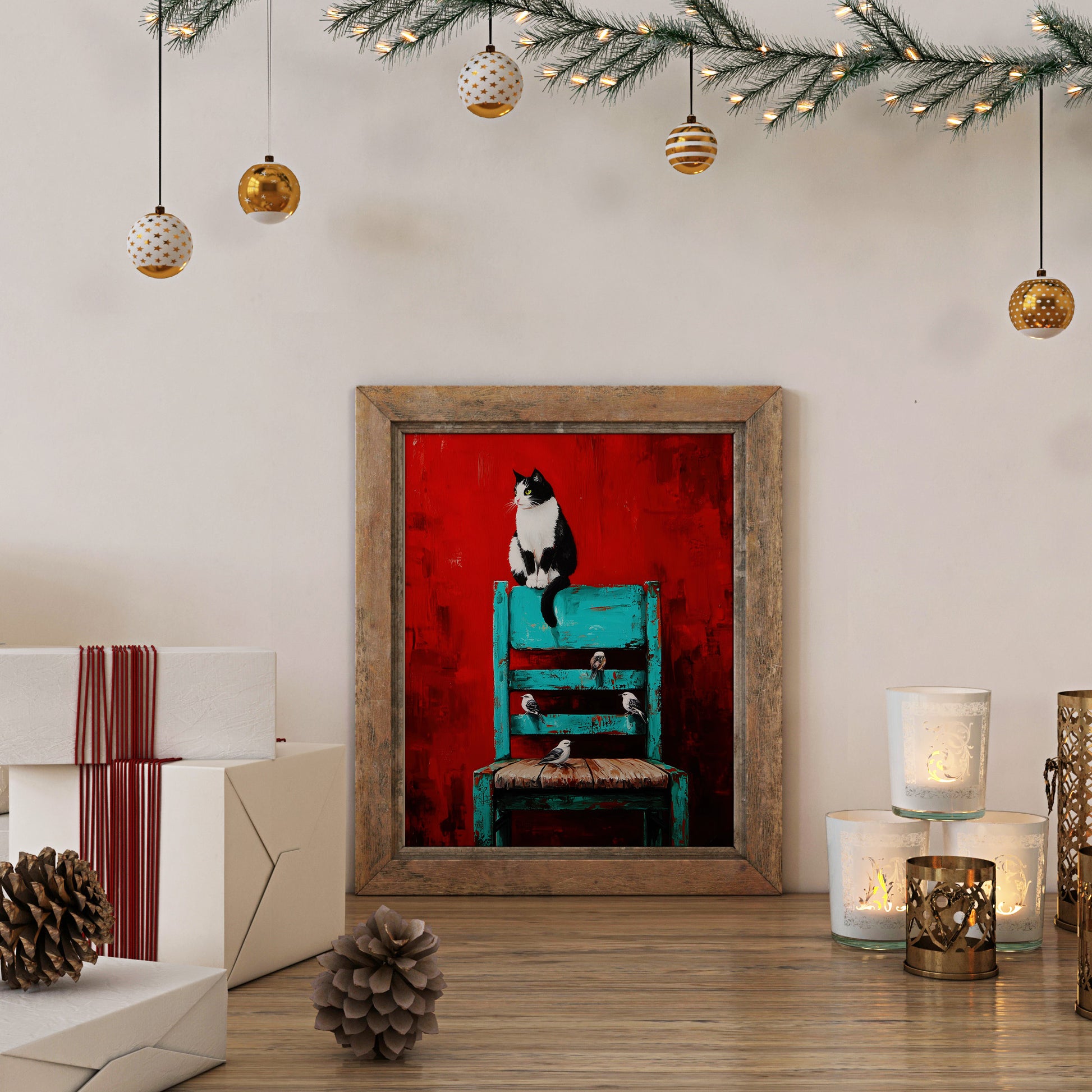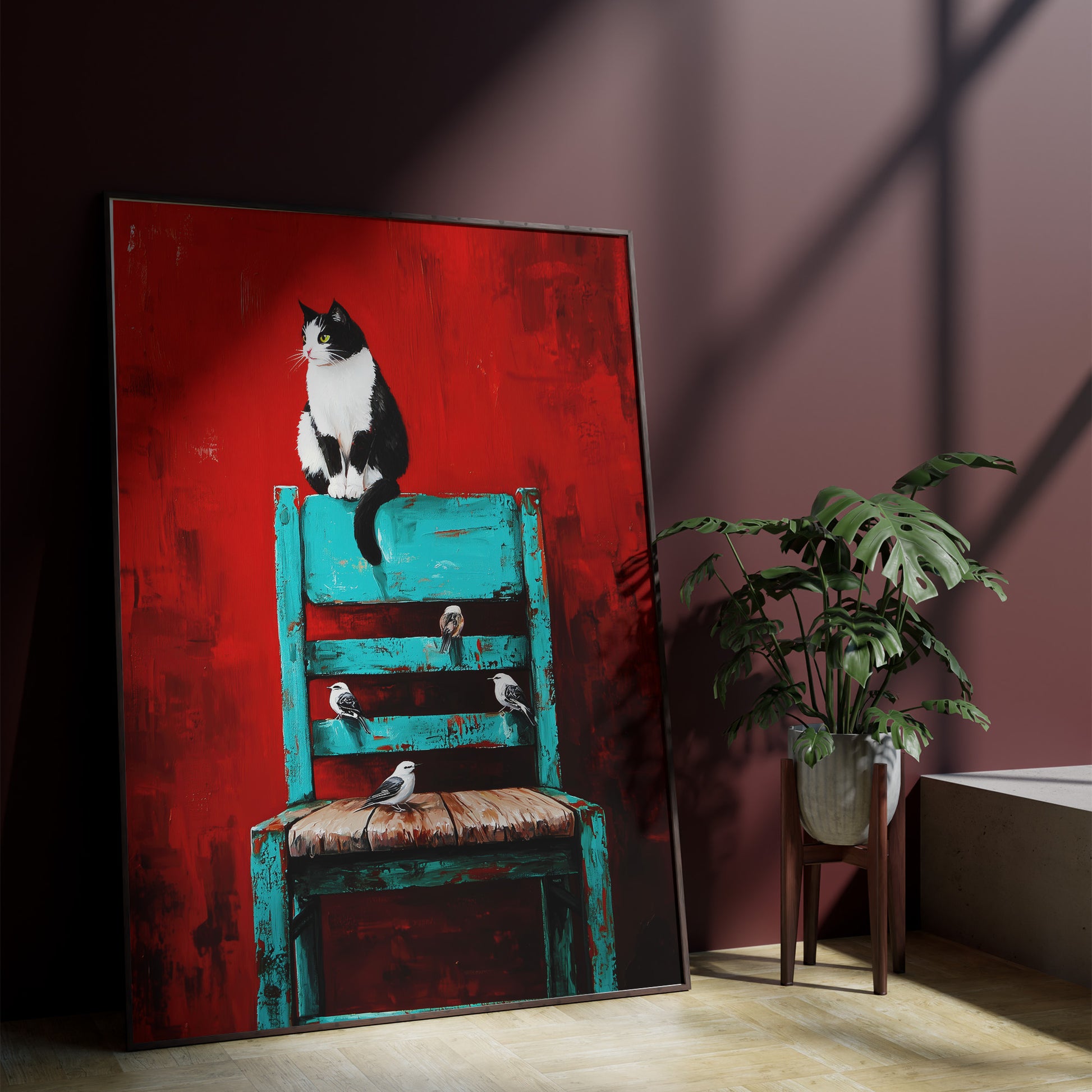 A visually arresting piece featuring high-contrast colors and a modern, bold aesthetic. A black and white tuxedo cat with bright green eyes sits poised atop a distressed, vibrant teal (turquoise/blue-green) wooden chair. The background is an explosive, intensely textured red, creating dramatic contrast and energy. Four small, white-breasted birds perch on the chair's slats, adding a whimsical touch to the composition. The thick, dynamic brushstrokes give the artwork a powerful, expressive, and slightly Pop Art feel, making it an excellent focal point for modern decor.