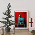 Striking Black And White Cat Sitting On A Textured Teal Chair Against A Bold, Expressive Red Background Pop Art Style