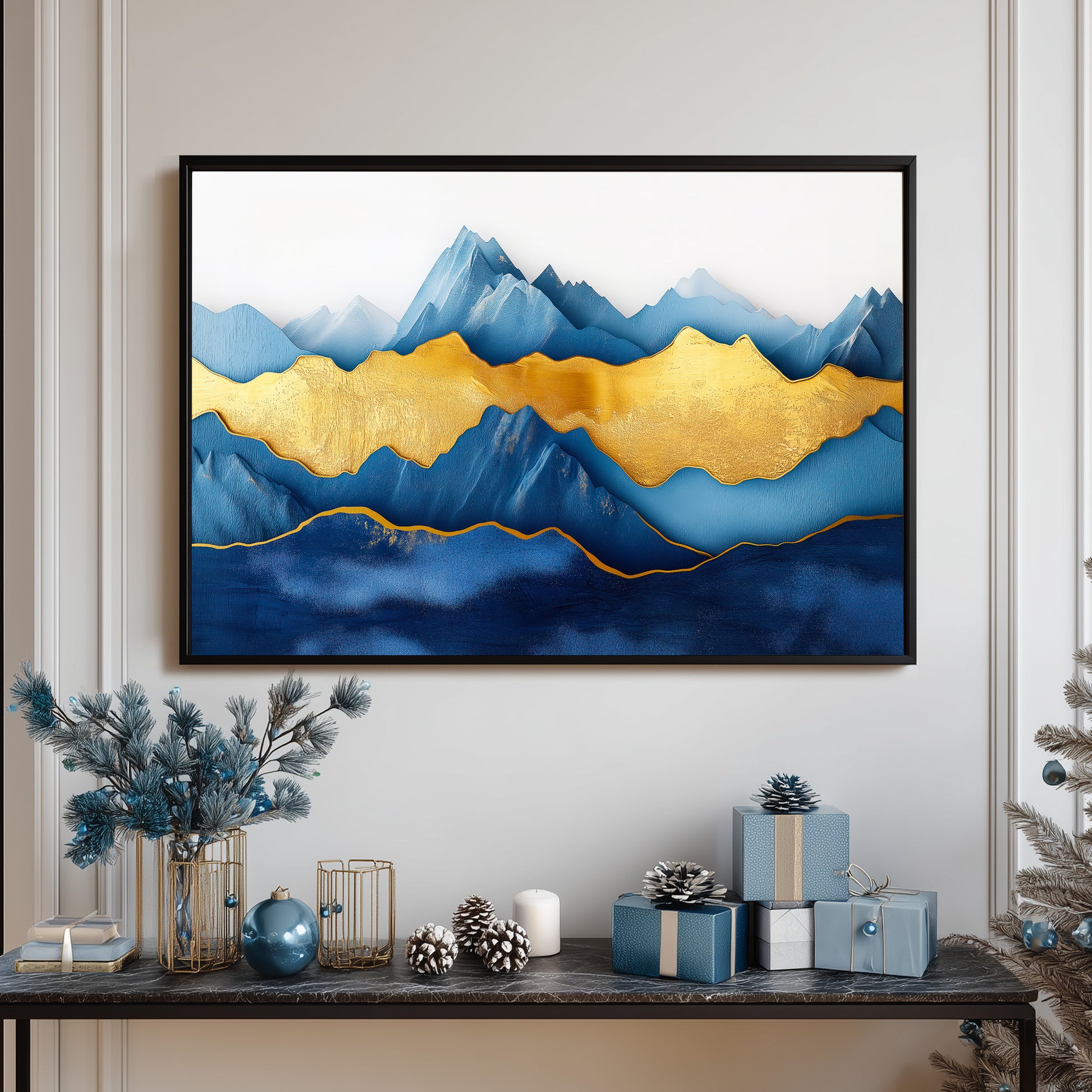 Stunning Abstract 3D Layered Mountain Landscape Painting In Deep Blue Tones With A Bold Central Gold Leaf Embellishment