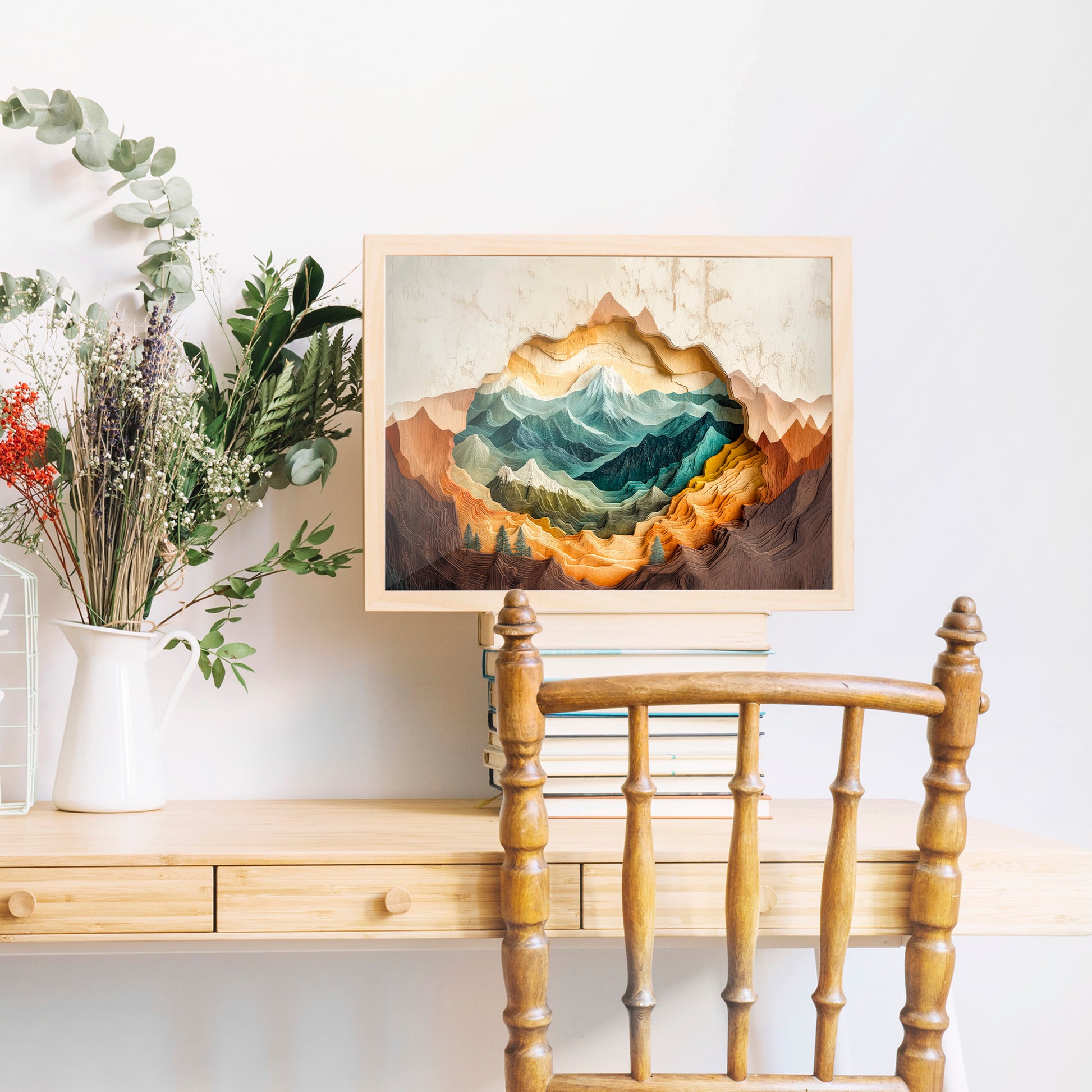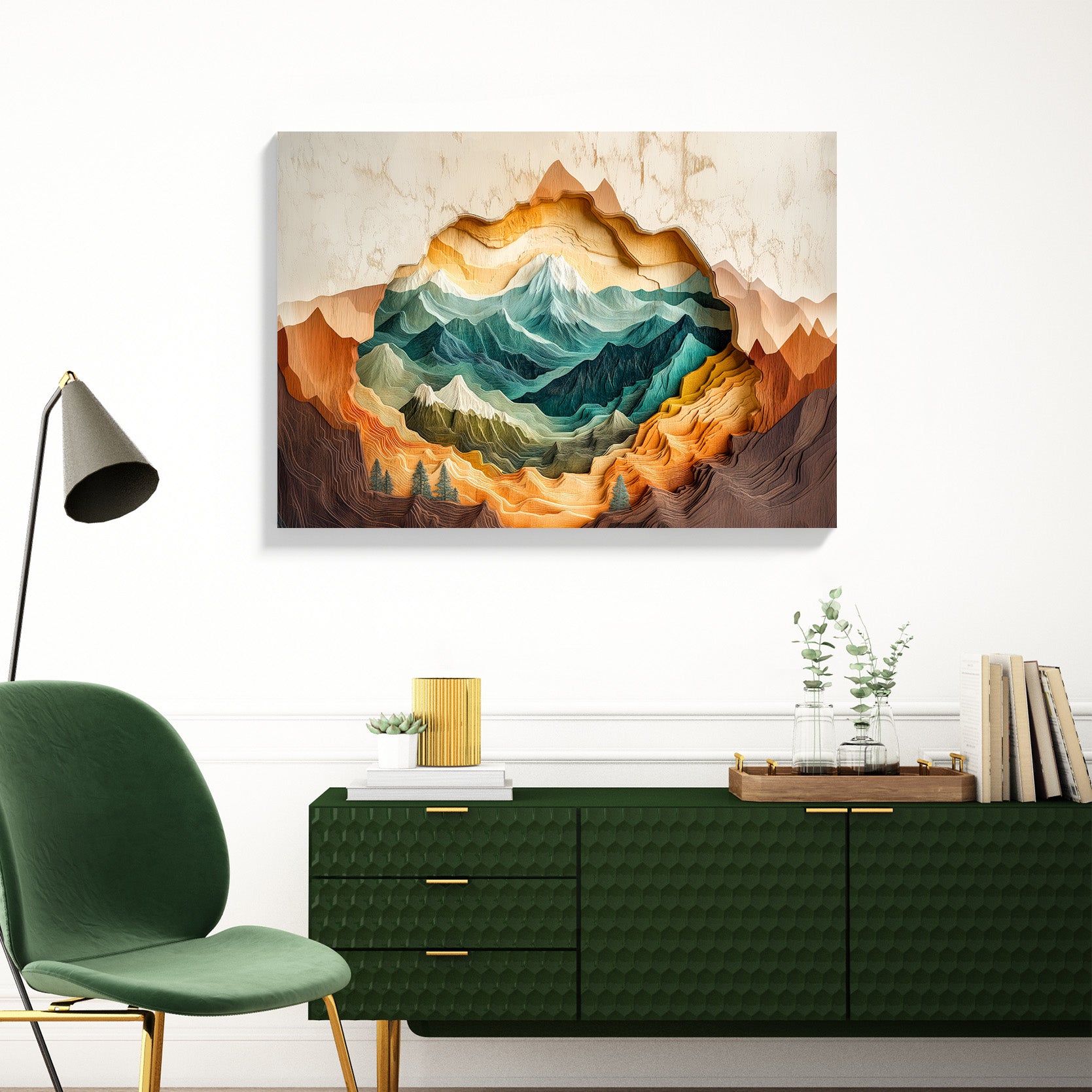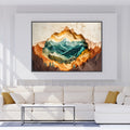 Stunning Abstract 3D Layered Mountain Landscape Painting In Deep Blue Tones With A Bold Central Gold Leaf Embellishment