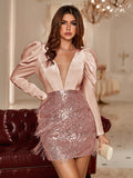 Stunning Sequin Fringe Dress with Plunging Neckline and Gigot Sleeves