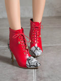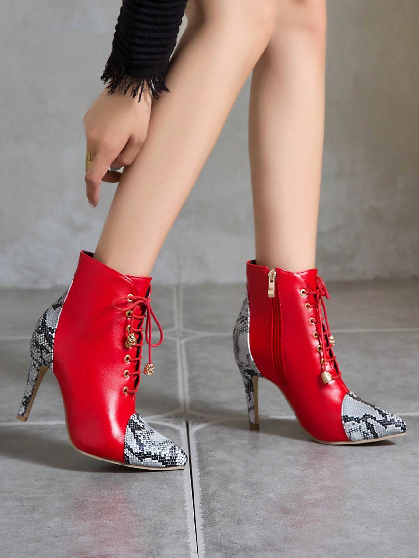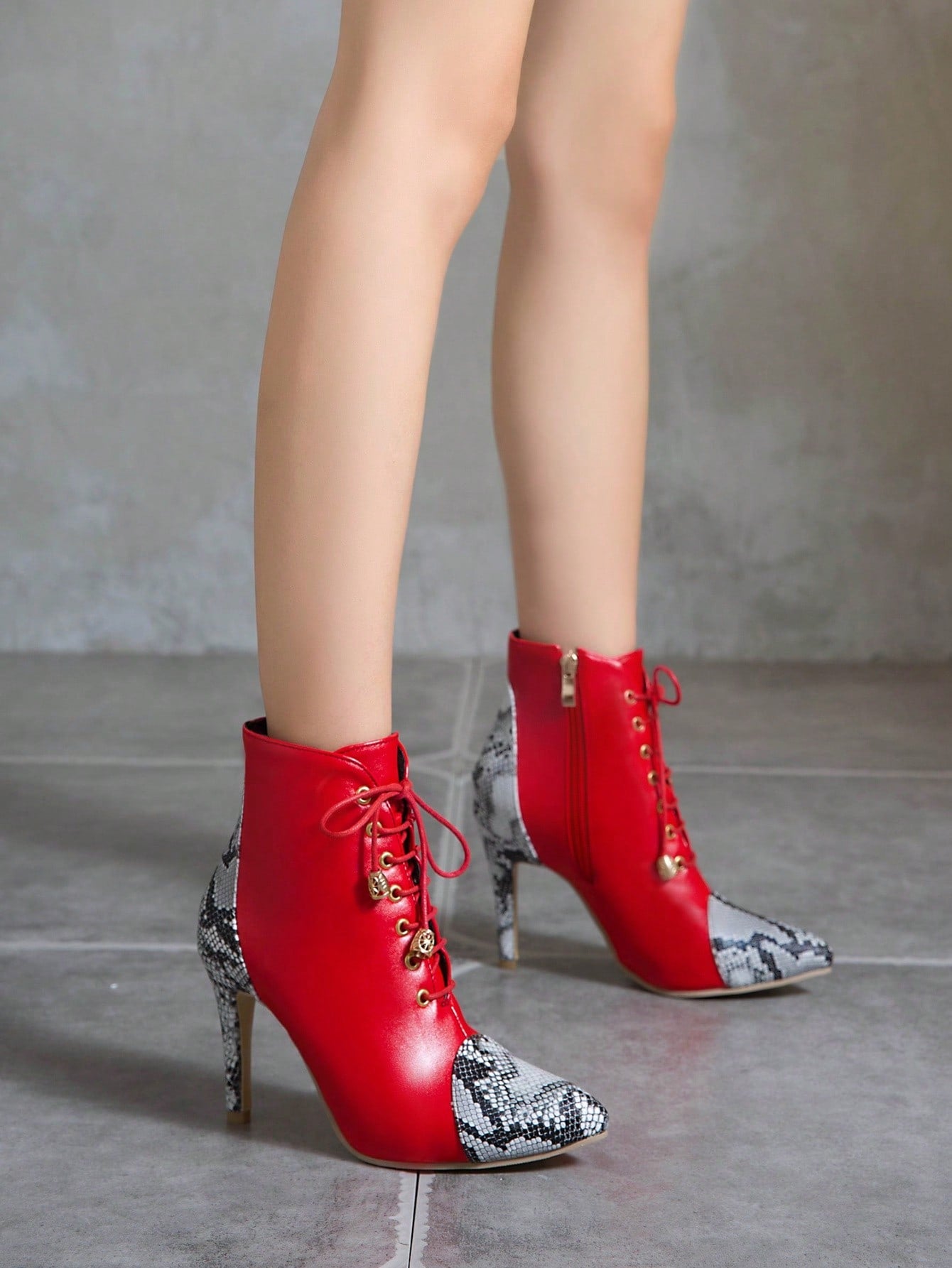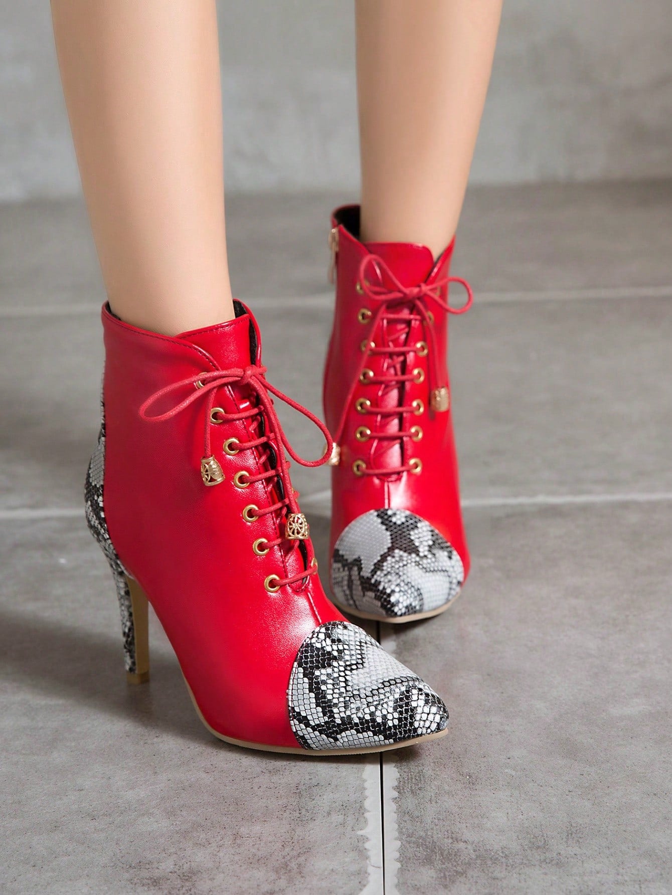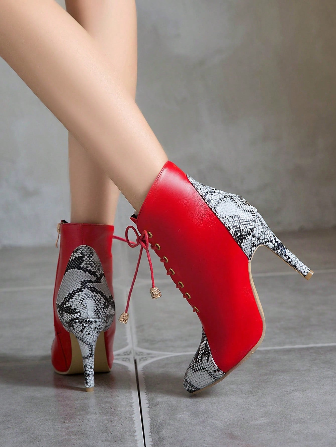 Stylish Snake Skin Print Stiletto Boots with Side Zipper and Lace-Up Detail