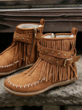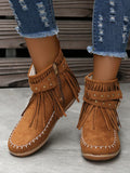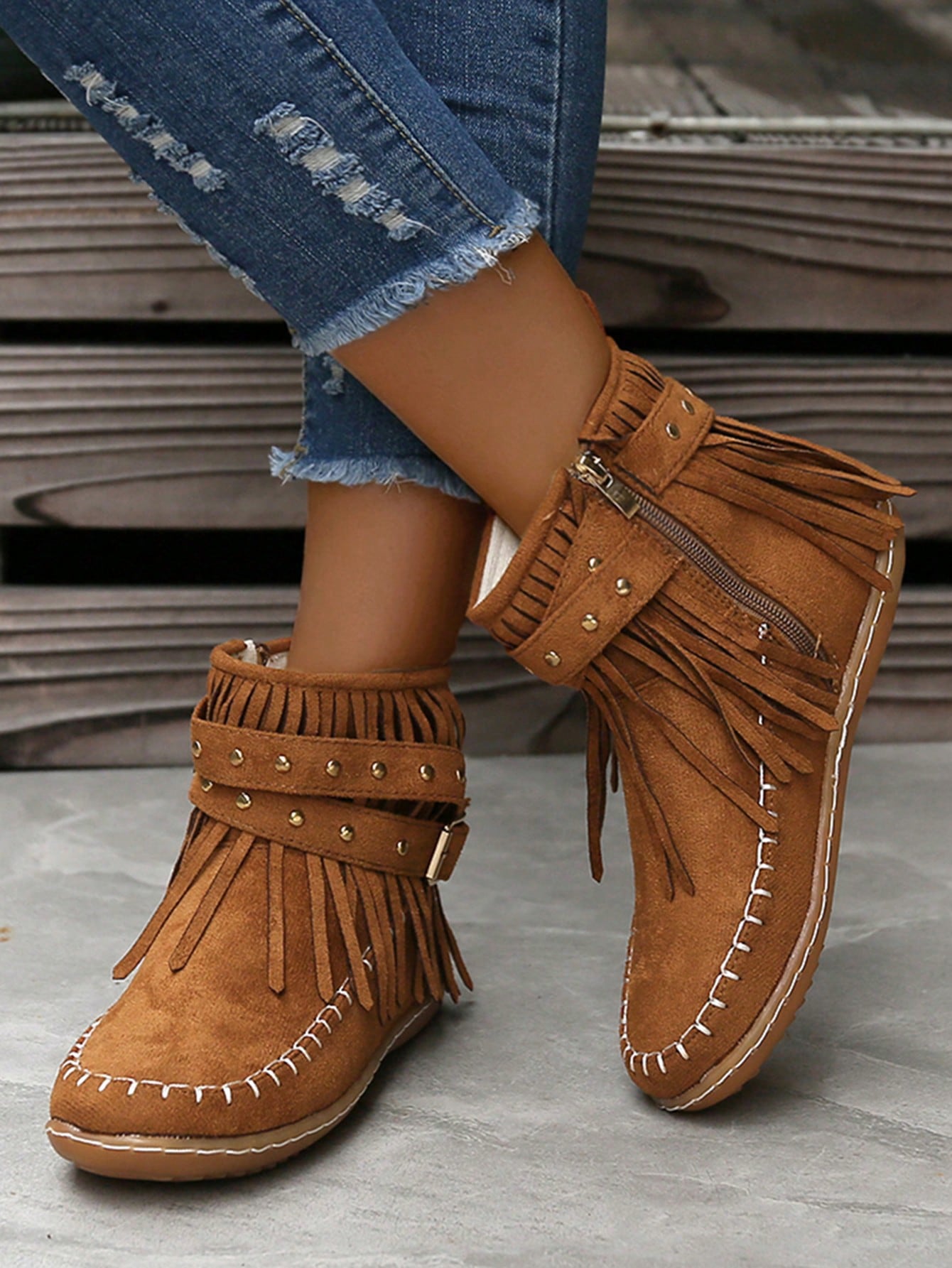 Stylish Studs and Fringe: Women's Round Toe Flat Boots with Side Zipper