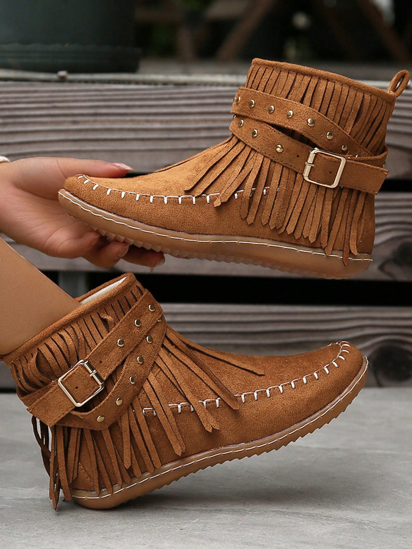Perfect for adding some edge to your wardrobe, these stylish flat boots feature a unique combination of studs and fringe detailing. With a classic round toe design and convenient side zipper, these boots are both fashionable and functional. Take your outfit to the next level with these statement-making boots.