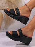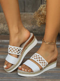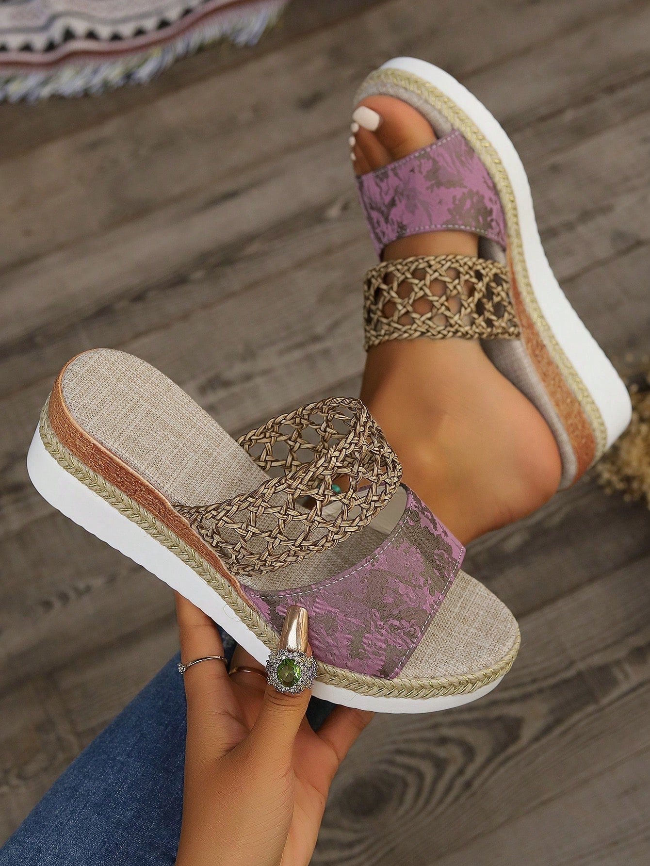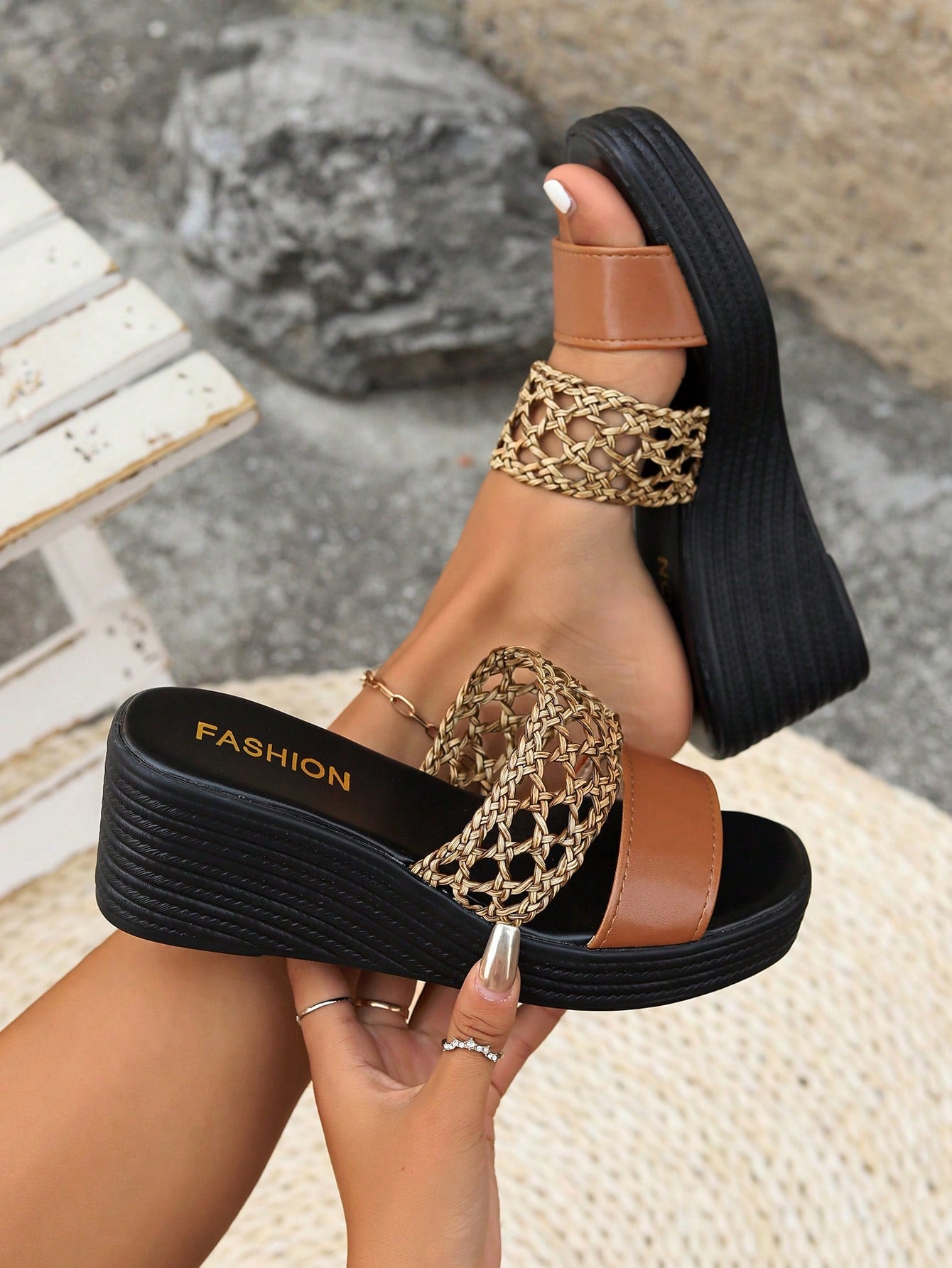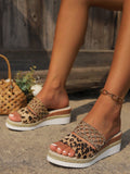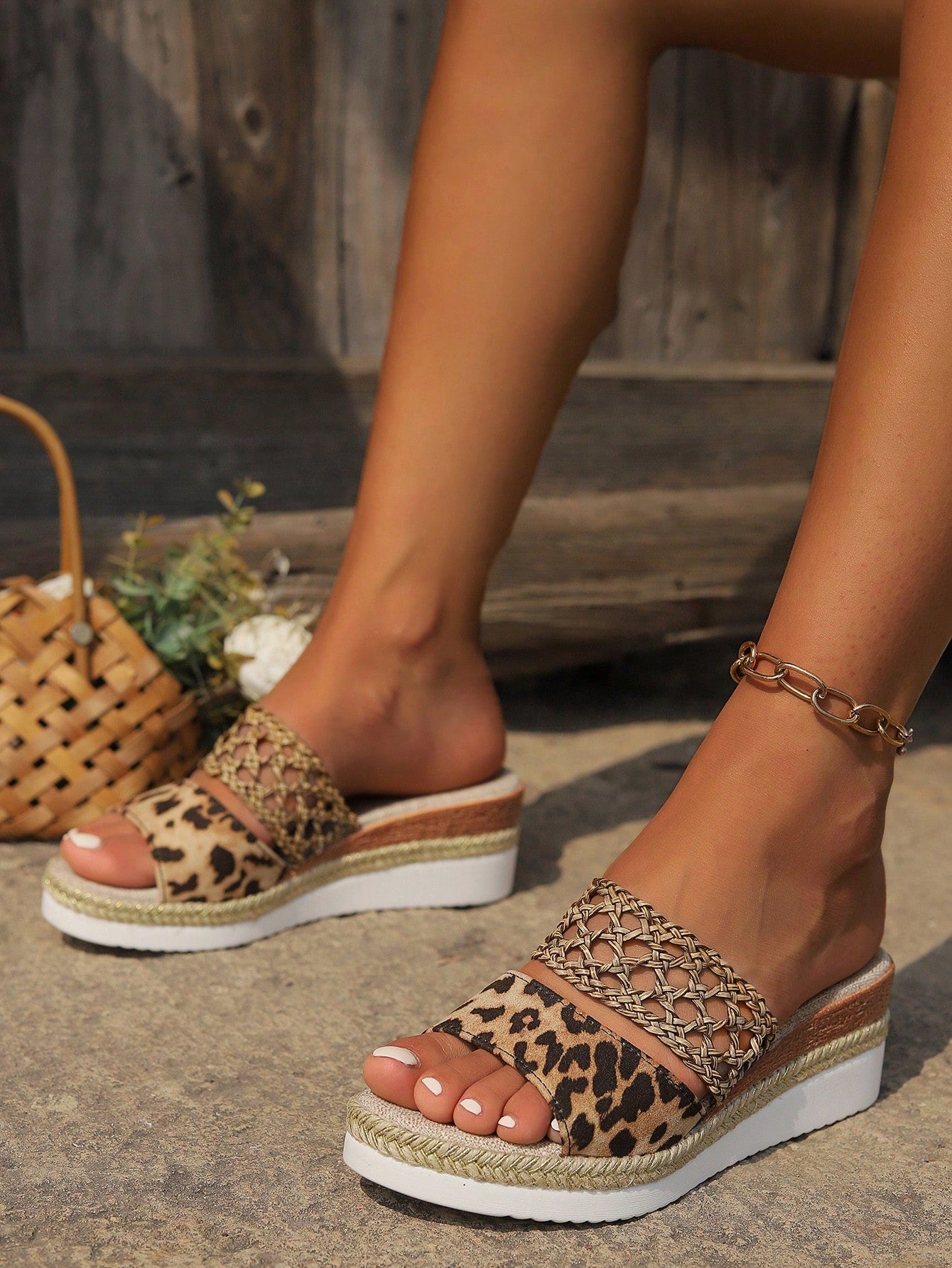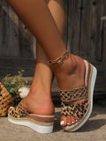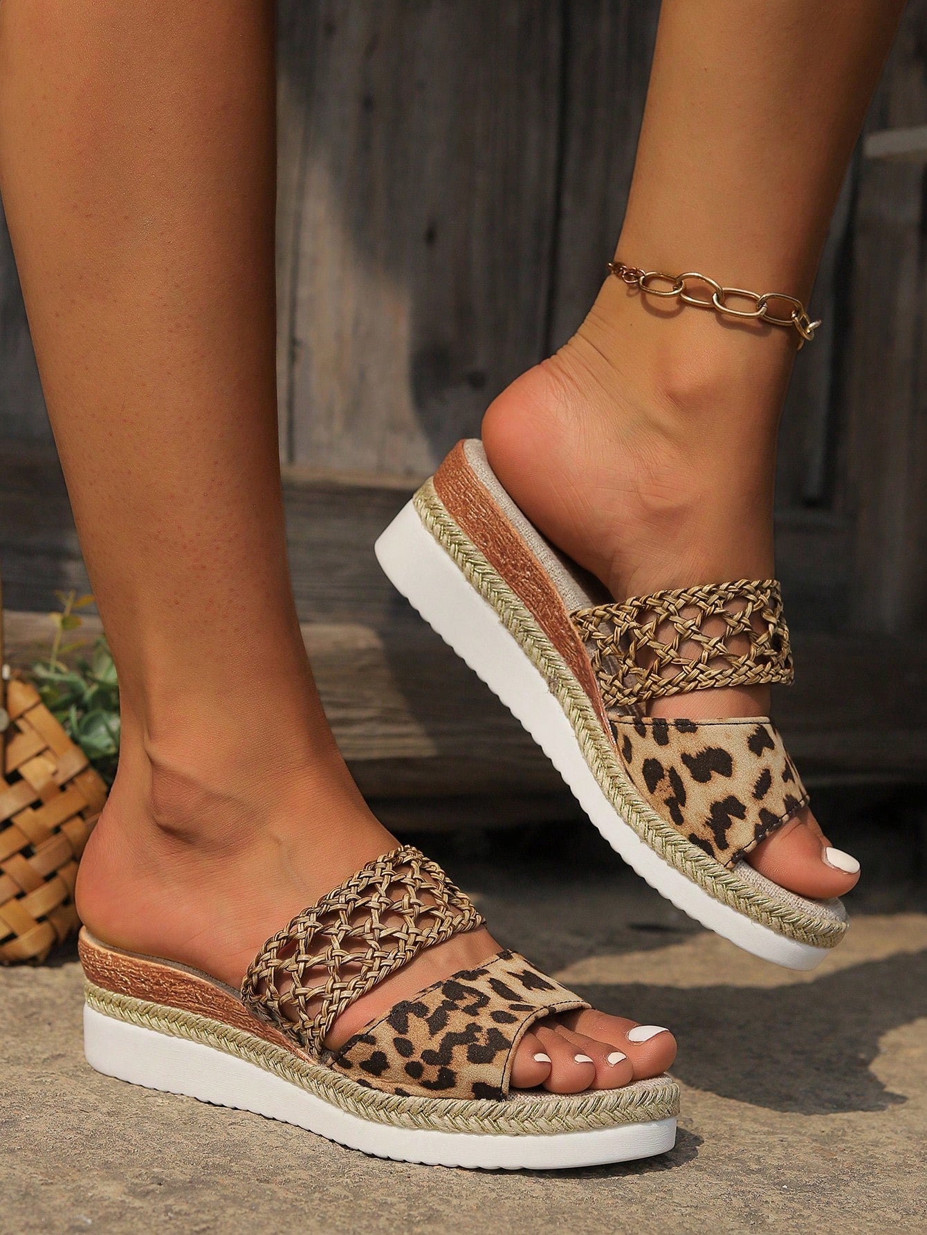 Stylish Women's Ultra-Light Brown Woven Platform Wedge Sandals with Leopard Print Detail