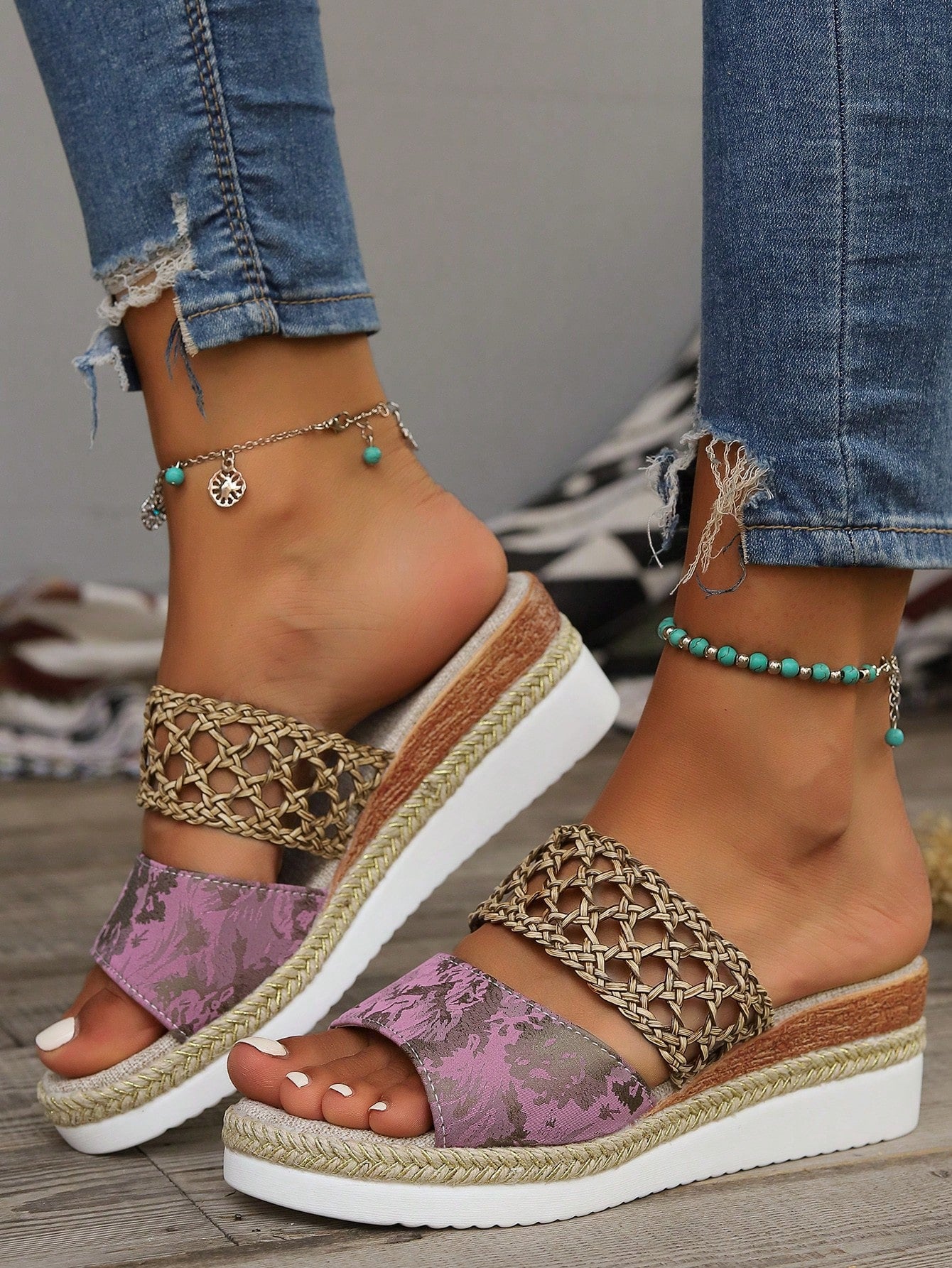 Elevate your style with these ultra-light and stylish women's woven platform wedge sandals. The beautiful leopard print detail adds a touch of fun to these comfortable and trendy sandals. Perfect for any occasion, these sandals are a must-have for any fashion-forward woman.