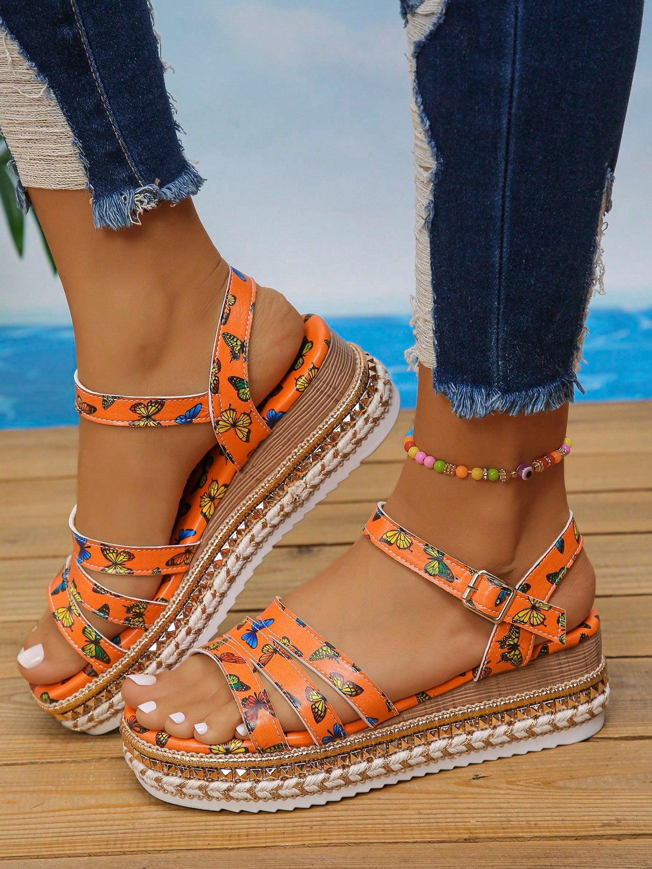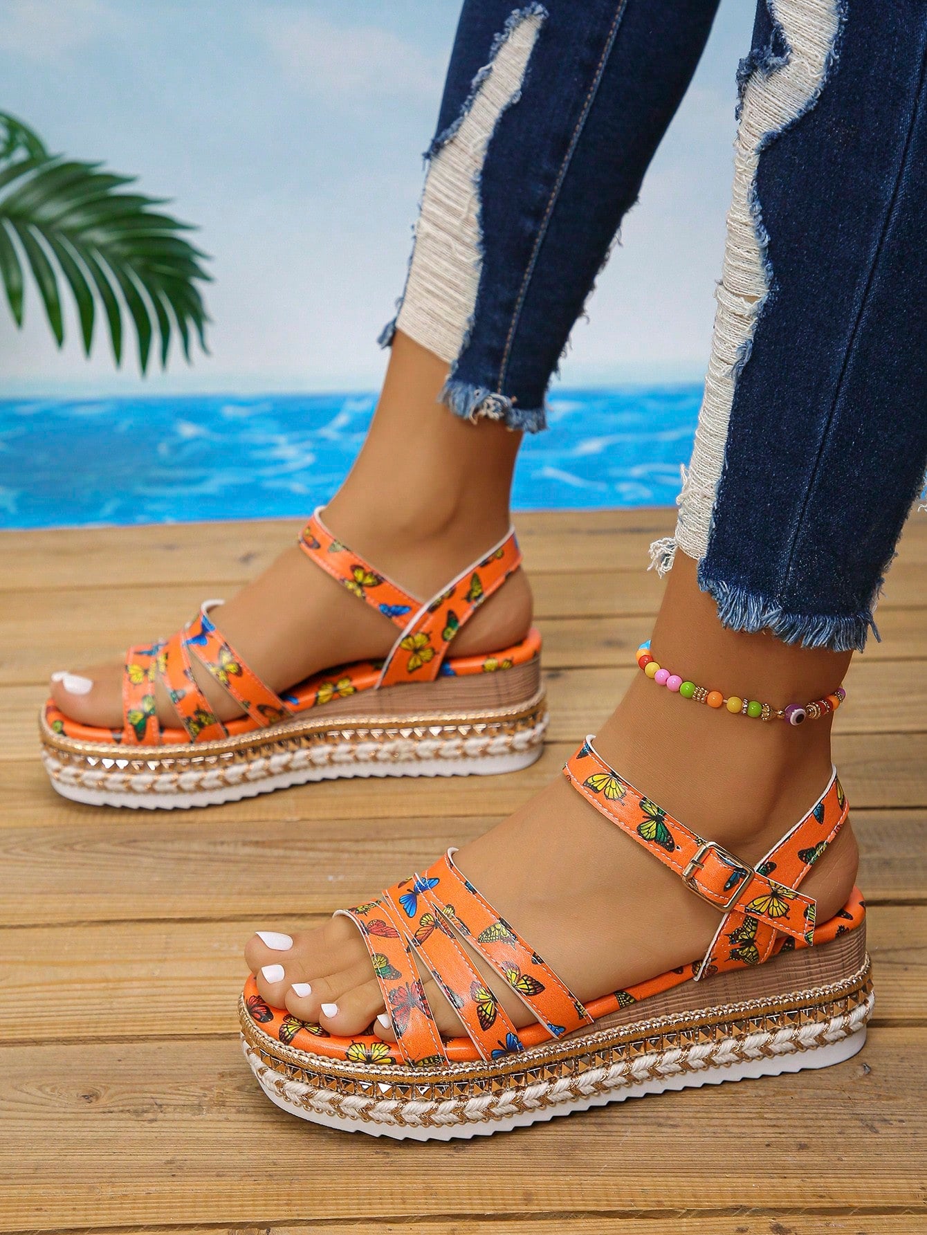 Sandals. Featuring a striking butterfly print and a durable linen rope sole, these sandals bring a touch of nature to your outfit. The platform wedge design provides comfort and stability, perfect for all-day wear. Available in plus sizes for a perfect fit."