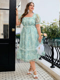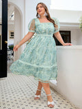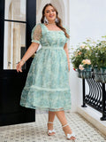 Summer Plus Size Green Flower Print Mesh Lace Bubble Sleeve Dress For Women