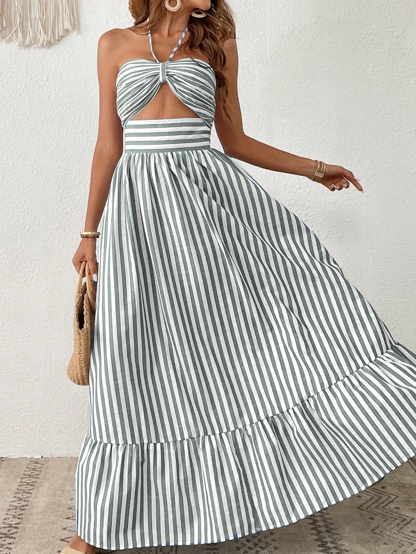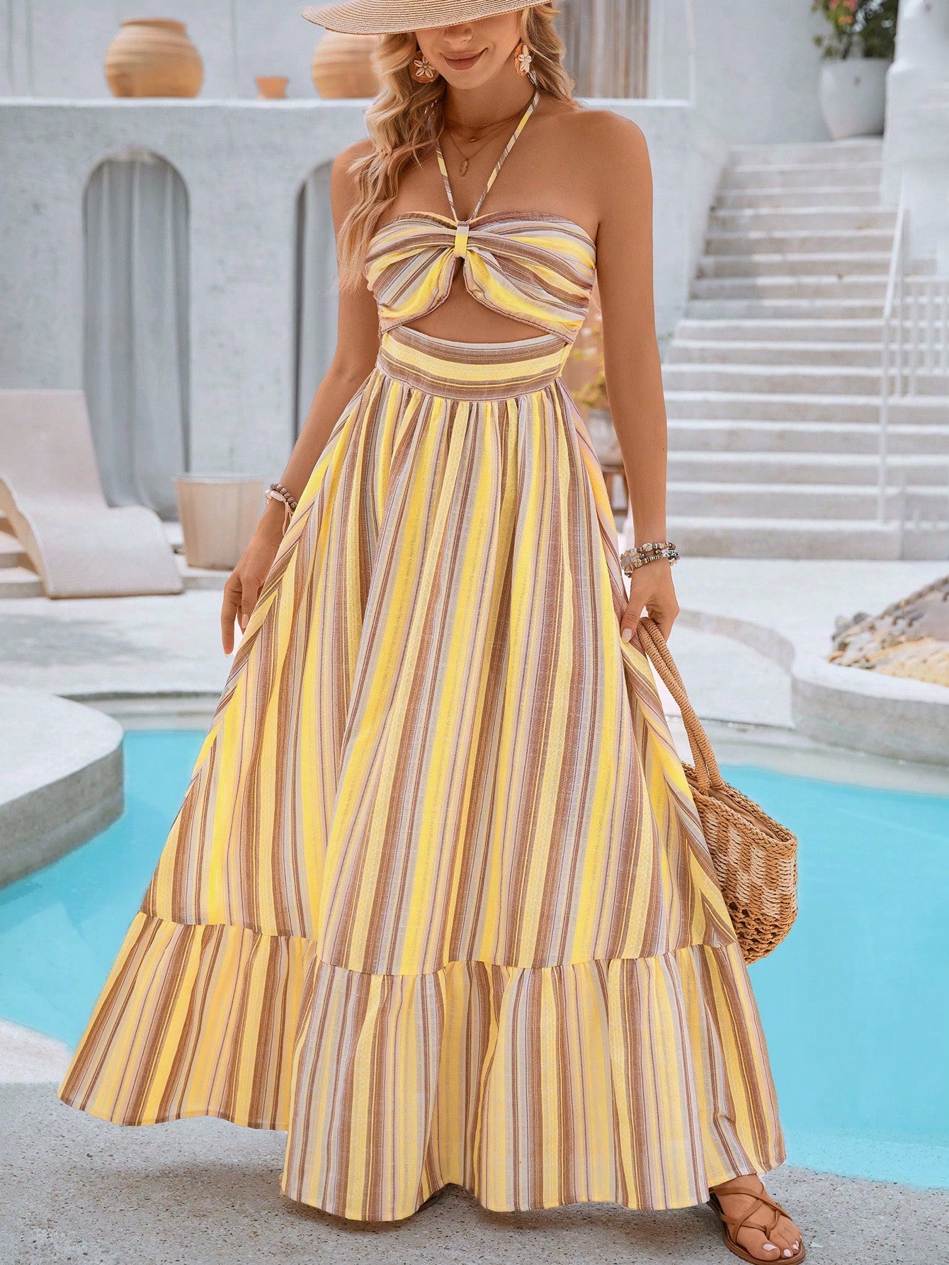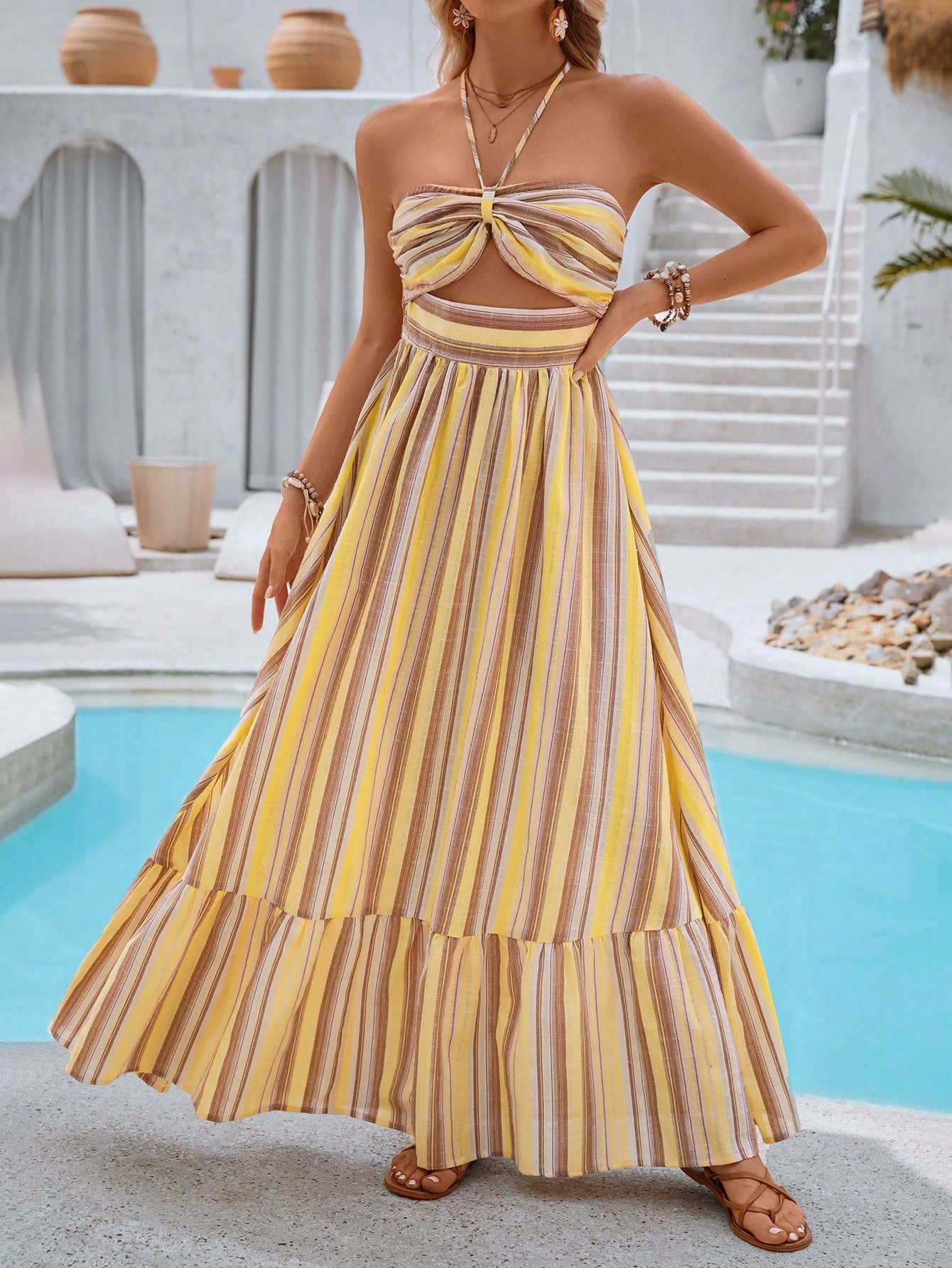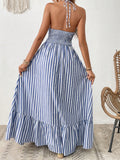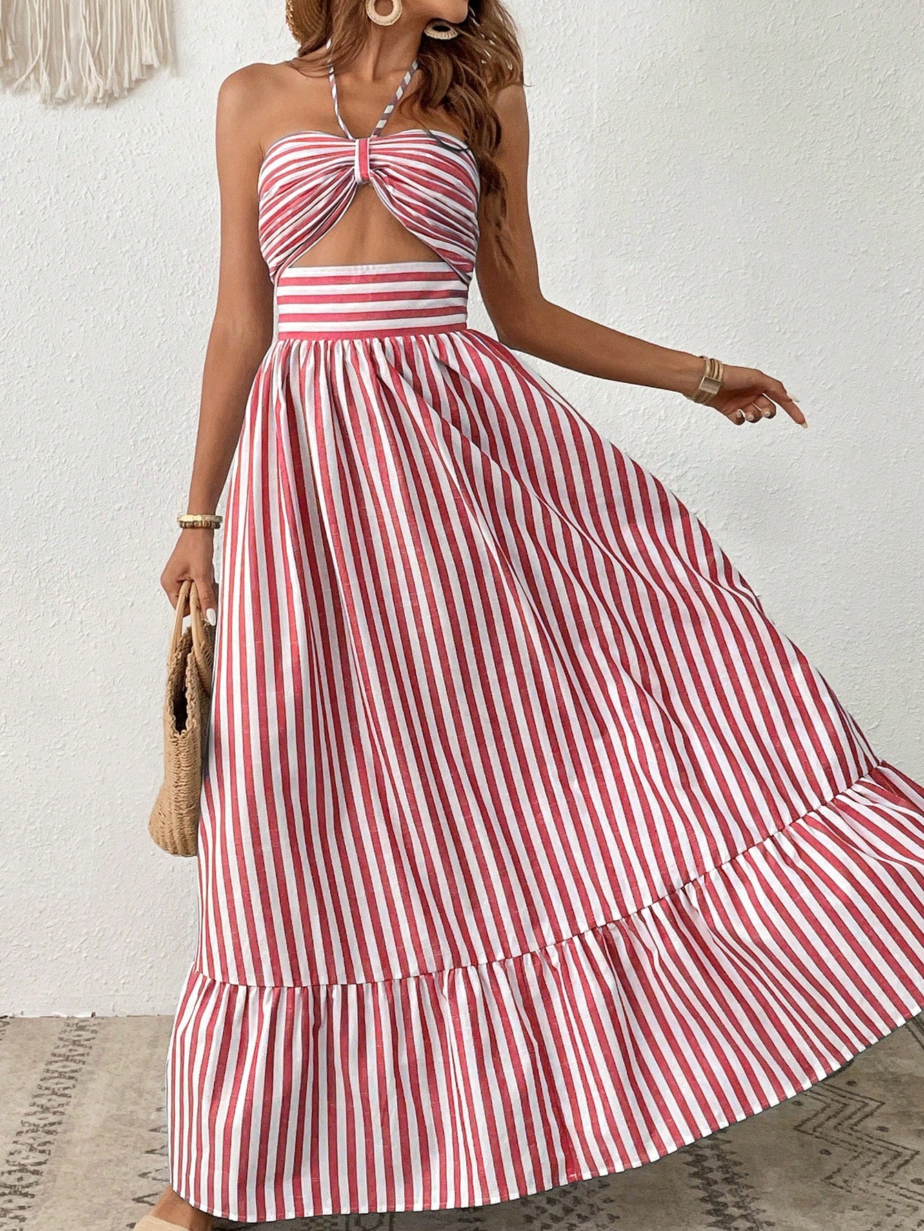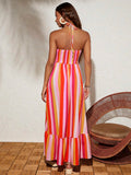 Summertime Dream: Sleeveless Striped Floral Vacation Dress with Neck Hanging Design