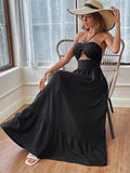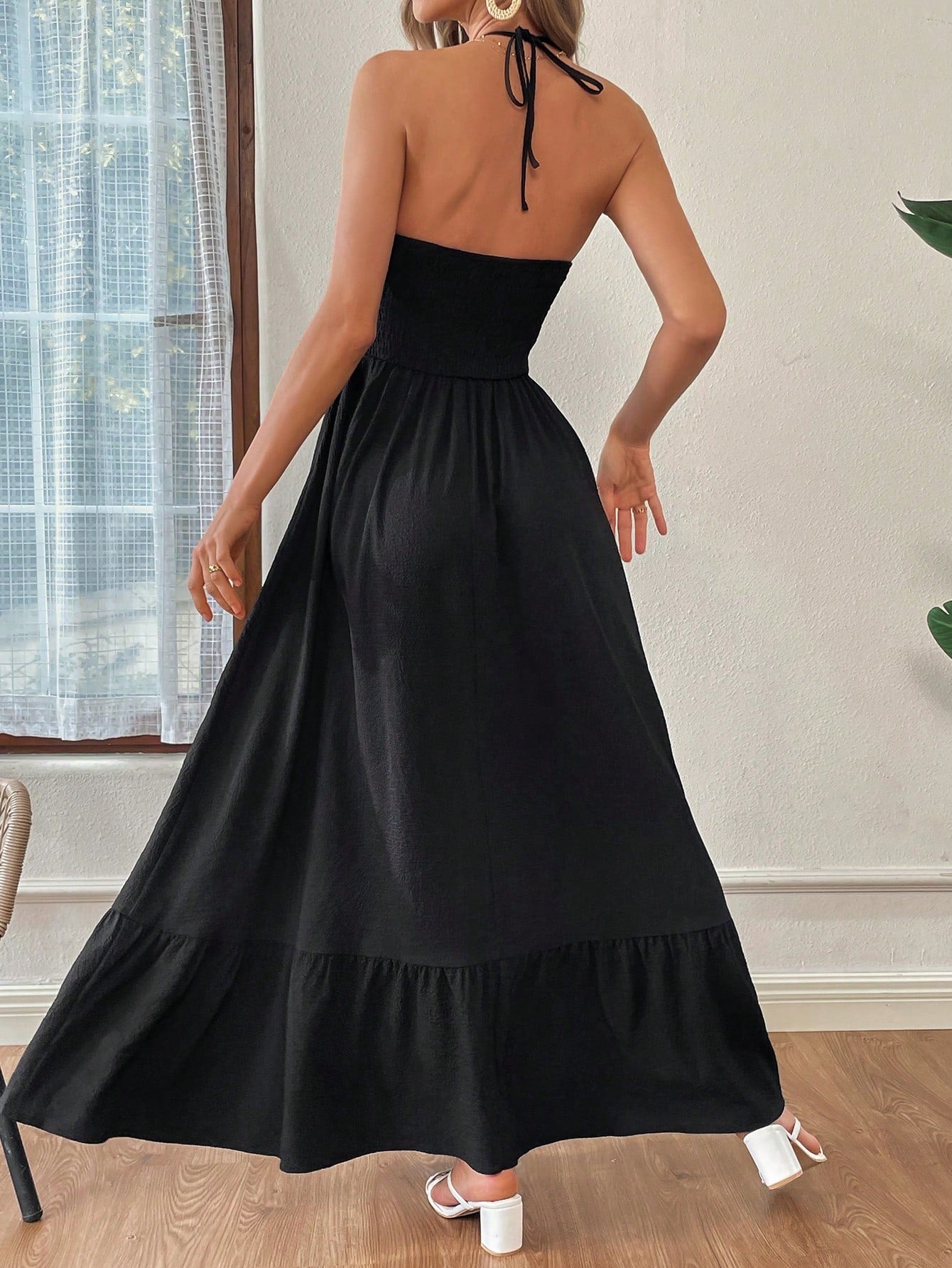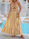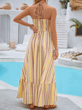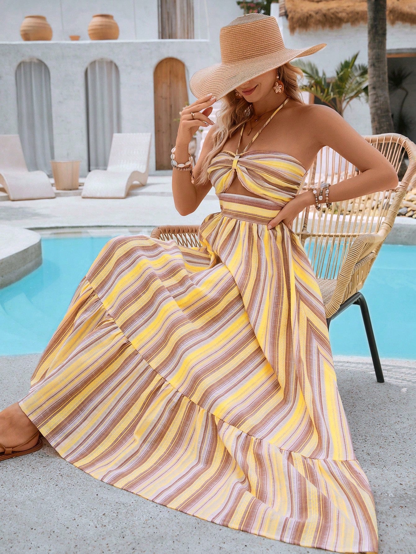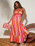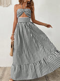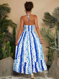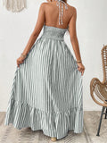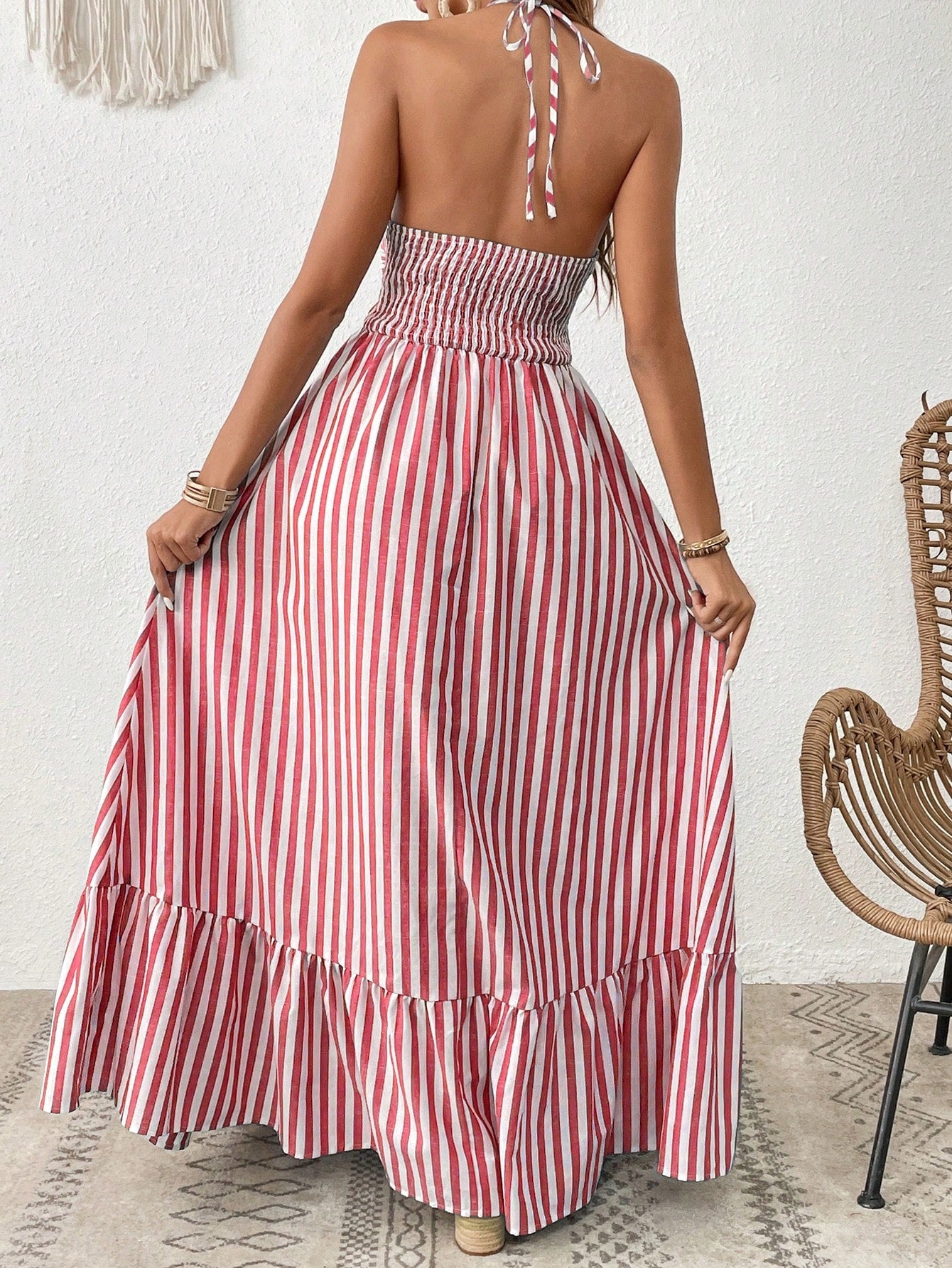 Summertime Dream: Sleeveless Striped Floral Vacation Dress with Neck Hanging Design